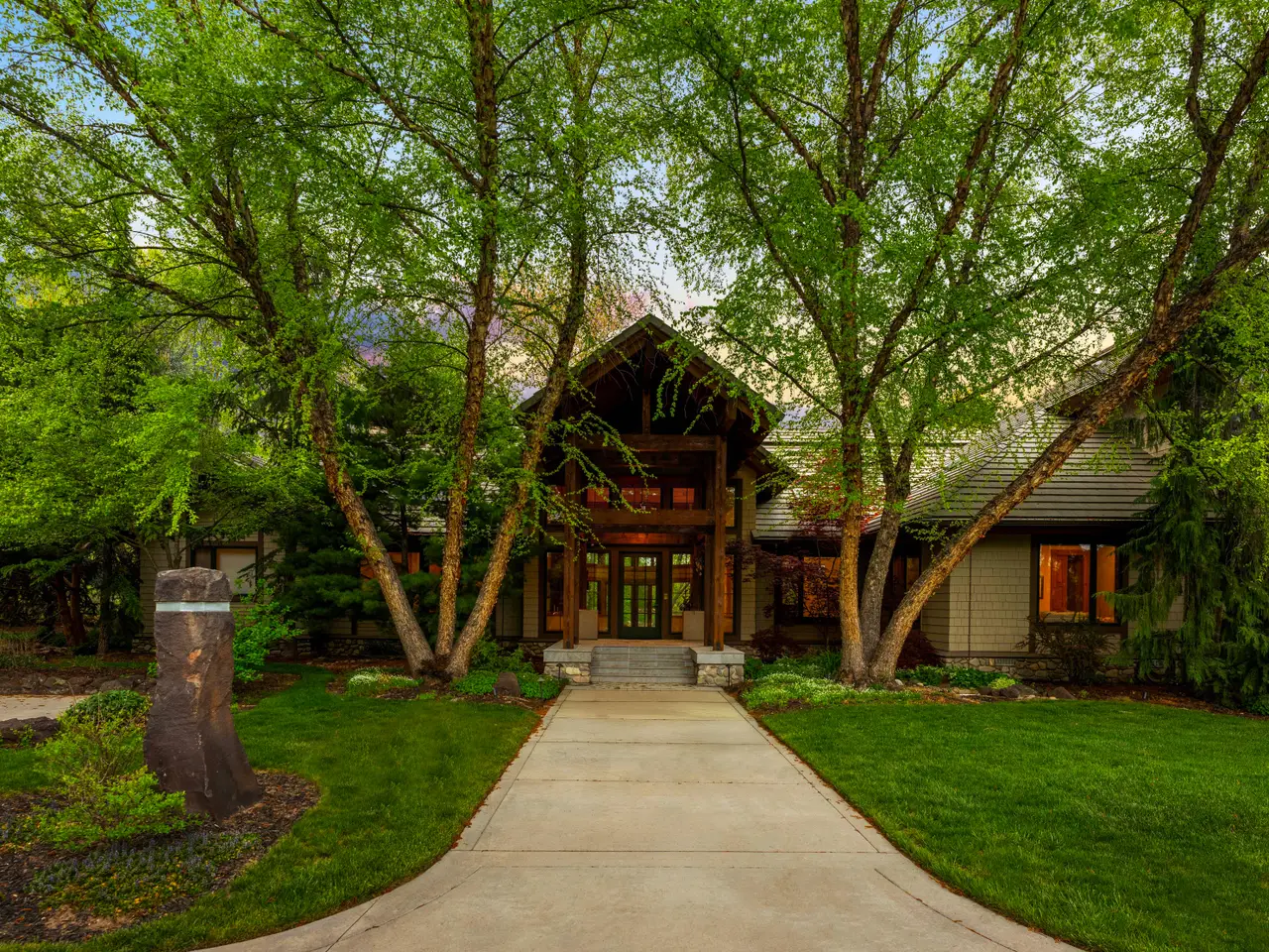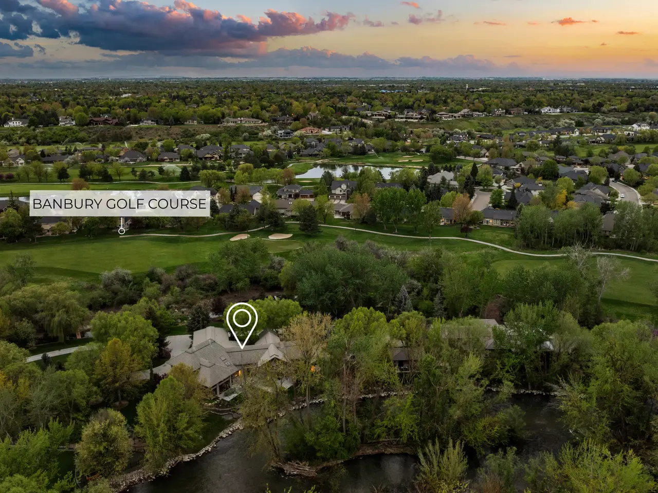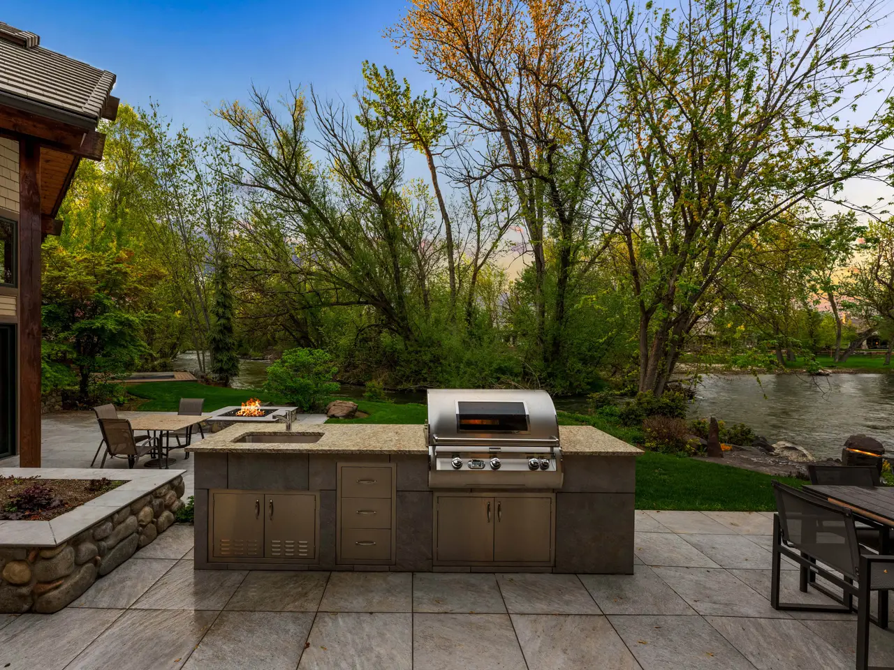 An extraordinary 1.5-plus-acre riverfront estate enveloped by water on both sides. Reminiscent of a Sun Valley cabin, the setting creates a rare sense of seclusion while a being only a stone’s throw from Banbury Golf Course, and minutes from premier Eagle living. The great room makes a striking first impression with soaring 22-foot ceilings, exposed beams and trusses, and exquisite custom woodworking. Seven sets of doors open to a wraparound patio, creating a seamless flow for indoor/outdoor entertaining right to the water’s edge. The gourmet kitchen is a chef’s dream, featuring marbled slab countertops, custom alder cabinetry, and a premium suite of stainless steel appliances. The main level master is set on a wing of its own with a lavish en suite bathroom. Upper level has a private, fully equipped studio with exterior access, kitchenette, and full appliance suite—ideal for guests or extended stays. The grounds feature an outdoor kitchen, multiple patios, firepit and hot tub deck that nearly touches the river.