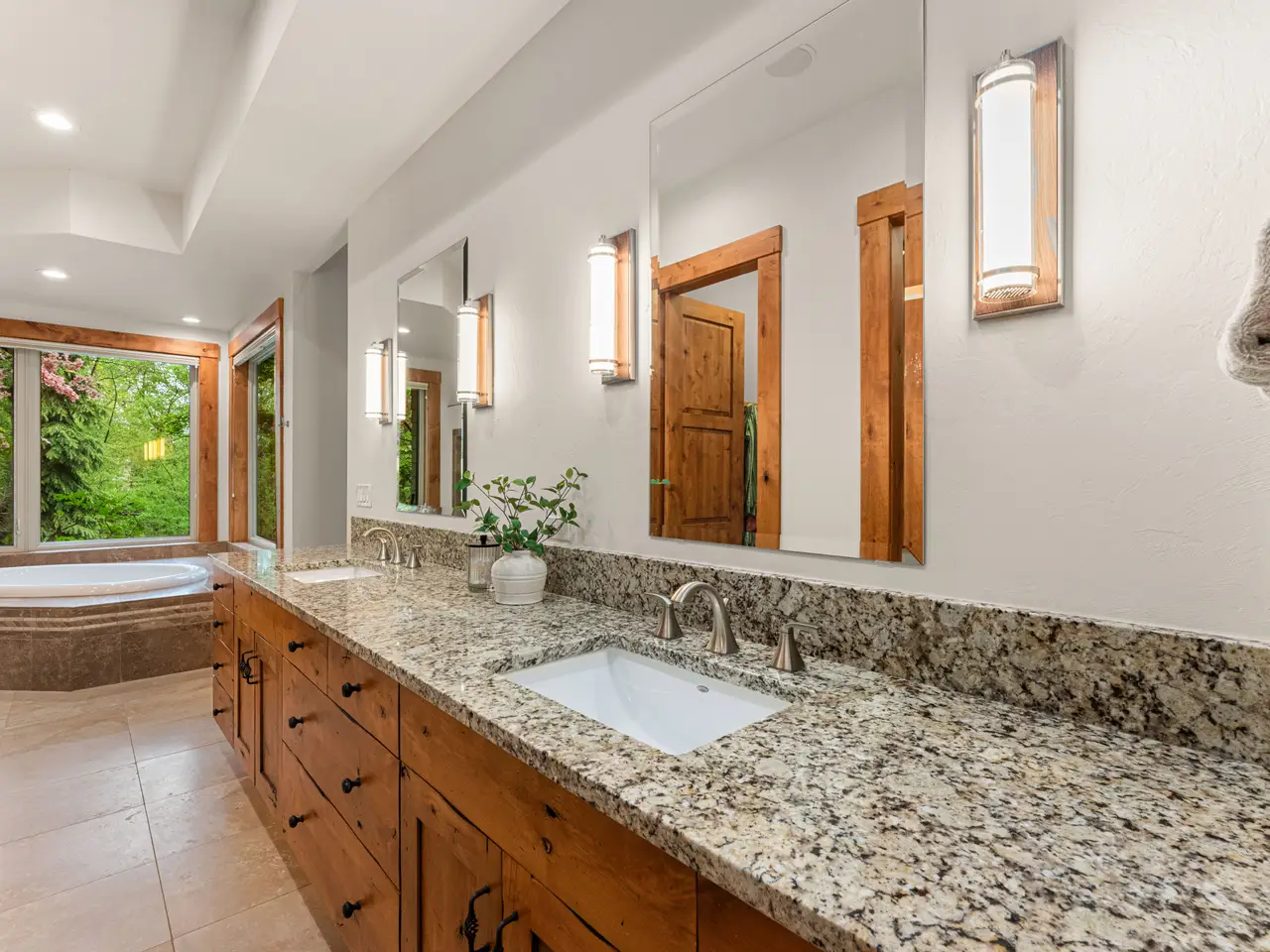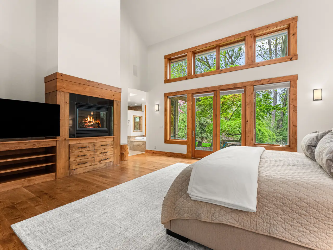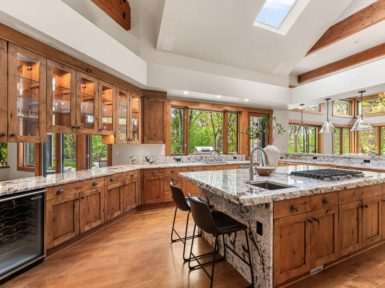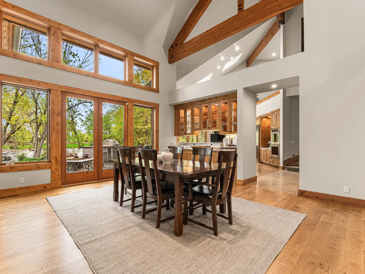 An extraordinary 1.5-plus-acre riverfront estate enveloped by water on both sides. Reminiscent of a Sun Valley cabin, the setting creates a rare sense of seclusion while a being only a stone’s throw from Banbury Golf Course, and minutes from premier Eagle living. The great room makes a striking first impression with soaring 22-foot ceilings, exposed beams and trusses, and exquisite custom woodworking. Seven sets of doors open to a wraparound patio, creating a seamless flow for indoor/outdoor entertaining right to the water’s edge. The gourmet kitchen is a chef’s dream, featuring marbled slab countertops, custom alder cabinetry, and a premium suite of stainless steel appliances. The main level master is set on a wing of its own with a lavish en suite bathroom. Upper level has a private, fully equipped studio with exterior access, kitchenette, and full appliance suite—ideal for guests or extended stays. The grounds feature an outdoor kitchen, multiple patios, firepit and hot tub deck that nearly touches the river.