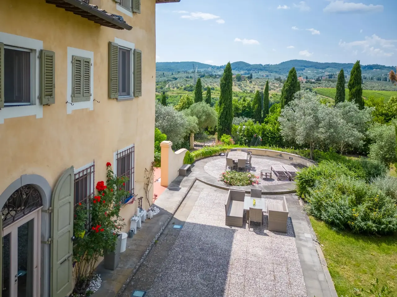 Portion of a villa on the hills of Scandicci, surrounded by lush countryside, with a panoramic view of the surrounding hills. The property combines classic elegance with a modern twist, offering a comfortable and refined place to live.The property is accessed through an exclusive gate that opens onto the well-kept garden with trees. The facade is embellished with windows and openings that offer a panoramic view of the surrounding picturesque countryside and allow you to experience the outdoor space as an extension of the interior spaces in the summer.The ground floor features an entrance hall with fireplace, a large living room, a dining room and a beautiful equipped and furnished kitchen designed by a prestigious Florentine interior designer. Service bathroom.The heart of this property is undoubtedly this welcoming living area with plenty of space for all the family's needs.Upstairs we find the master bedroom with bathroom and walk-in closet, two bedrooms and a second bathroom.On the second floor a large living room with exposed beams and four panoramic windows. This space can be used for various functions, lounge, study, gym or for a very large 4th bedroom.In the basement there is a large service area with storage room and laundry.The materials used for the renovation are of high quality and represent a synthesis between respect for the original materials used for this type of property and a contemporary touch.The resulting atmosphere is light, airy, very welcoming and comfortable. The colors used are neutral and blend perfectly with the modern and refined furnishings.The equipped garden is a great opportunity to experience the greenery and an opportunity to relax.The property includes a small outbuilding in the final part of the garden.Land with olive trees of about 2,500 square meters.For information 339 5356103