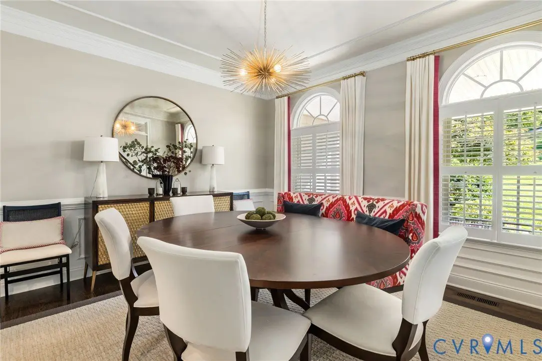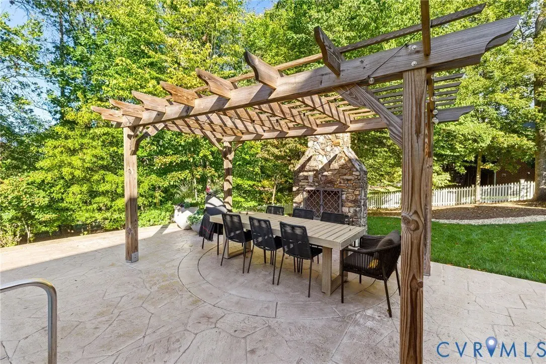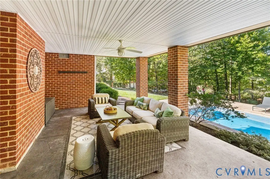Stunning Luxury Home in Sought-After River Downs Community! Welcome to this exquisite 5-bedroom, 3 full and 2 half bath home showcasing over 5,200 sq ft of beautifully designed living space. Home offers the perfect blend of elegance, comfort, and outdoor resort-style living. Step into the bright and inviting foyer, accented with double crown molding, gleaming HDWD, and plantation shutters. To your left, a private home office with a Palladian window provides the ideal work-from-home setting, while the formal dining room on the opposite side impresses with picture frame molding and timeless details. The 1st-floor primary suite is a true retreat, featuring vaulted ceilings, an accent wall, hardwood floors & WIC. The spa-inspired en suite bath showcases dual quartz vanities, a custom-tiled shower, and a freestanding soaking tub. The heart of the home is the expansive family room, centered around a double-sided stone fireplace that opens to a cozy additional living area, perfect for relaxing or entertaining. The gourmet kitchen is a chef's dream, offering quartz counters, large center island, tile backsplash, under-cabinet lighting, gas cooking, wall oven & walk-in pantry. The adjoining butler's pantry with a wine fridge, wet bar, and custom cabinetry makes entertaining effortless. Upstairs, find 4 spacious BRs, each with HDWD, generous closets & two Jack-and-Jill BAs. The finished third floor provides an incredible recreation room complete with skylights, recessed lighting, built-in storage, reading nook & 1/2 BA, perfect for a playroom, media space, or private retreat. Step outside to your own backyard paradise. Covered patio overlooks a sparkling in ground pool, stone fireplace, and pergola, an entertainer's dream & the ultimate spot to unwind after a long day. This exceptional home combines timeless craftsmanship, modern luxury & an unbeatable location close to shopping, dining, and top Chesterfield schools. Come experience this one-of-a-kind property in River Downs, where elegance meets everyday comfort.