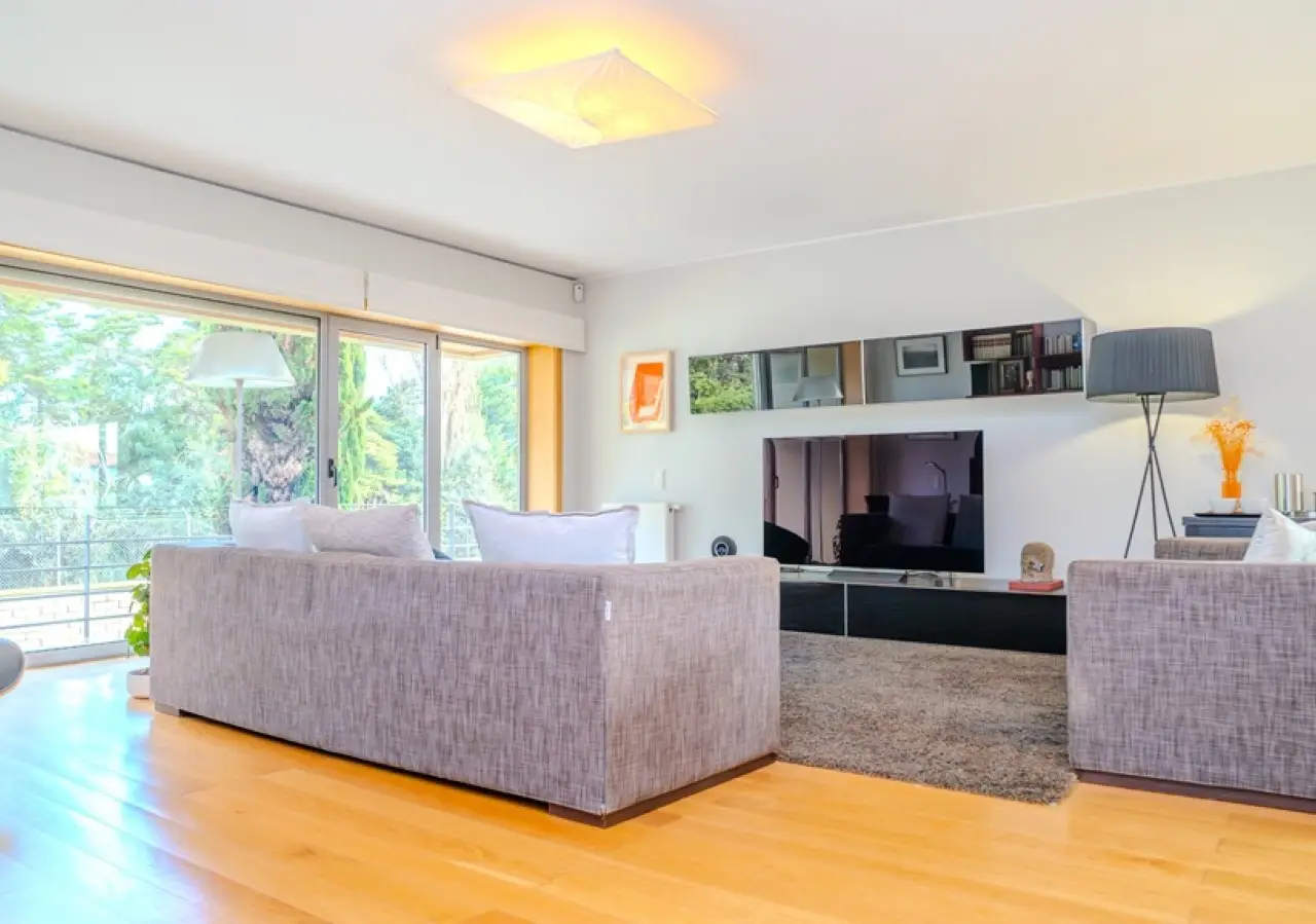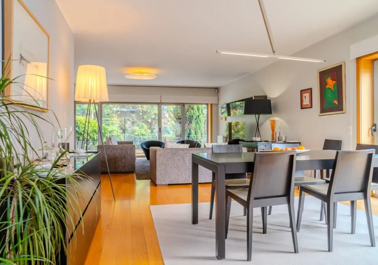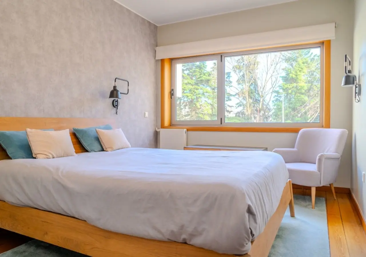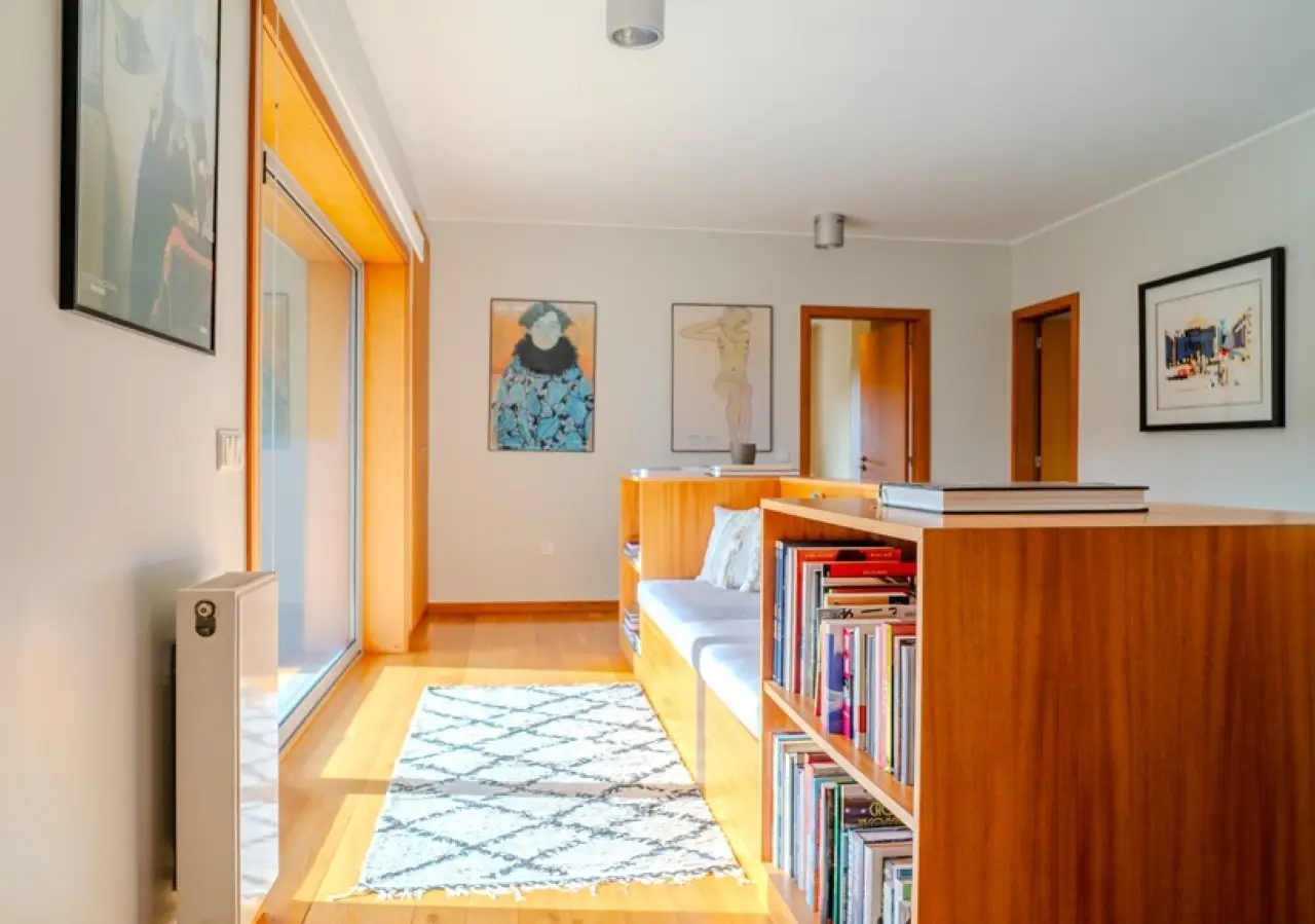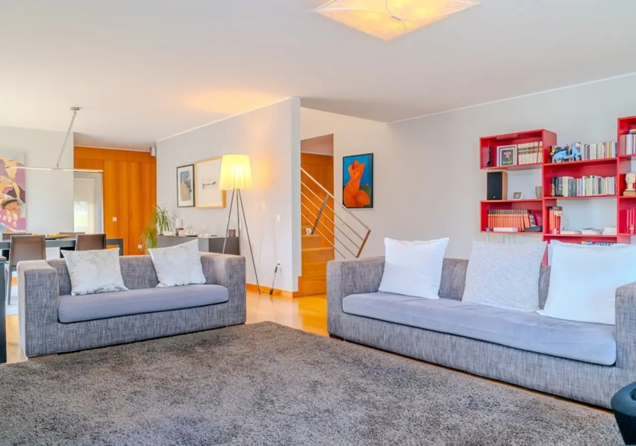 This magnificent 4-bedroom villa, situated in a privileged and very private location in Senhora da Hora, stands out for its spacious areas, modern design and strong connection to the outdoors, providing a balanced lifestyle between urban comfort and the serenity of nature.it is distributed in a functional and intelligent way over three floors, with three fronts, East-South-West. On the ground floor there is a 60m2 living room connected to the outside, a 40m2 storage area, a bathroom and a laundry room. The first floor houses a generous living room flooded with natural light, thanks to the large windows that let the sun illuminate every corner. On this floor, the space flows naturally into the dining area and the independent, modern and fully equipped kitchen, where refinement and functionality go hand in hand. On this floor there is also an office and a guest bathroom. The upper floor has four bedrooms, two of which are en suite, one of which is a master suite that stands out for the elegance of the separation between the dressing room and the sleeping area, while the others are served by a full bathroom. Finally, outside, the presence of green elements adds a touch of freshness and well-being, whether in the private garden or in the carefully planned outdoor spaces, such as the rooftop with 360-degree views. This property also has a closed garage for two cars, ready for charging electric vehicles. Strategically located in City Golf, close to services, transport and schools, this villa combines the best of residential tranquillity with the convenience of urban life. CHARACTERISTICS: Plot Area: 435 m2 | 4 682 sq ft Deployment Area: 126 m2 | 1 356 sq ft Building Area: 378 m2 | 4 069 sq ft Bedrooms: 4 Bathrooms: 5 Garage: 2 Energy efficiency: B-