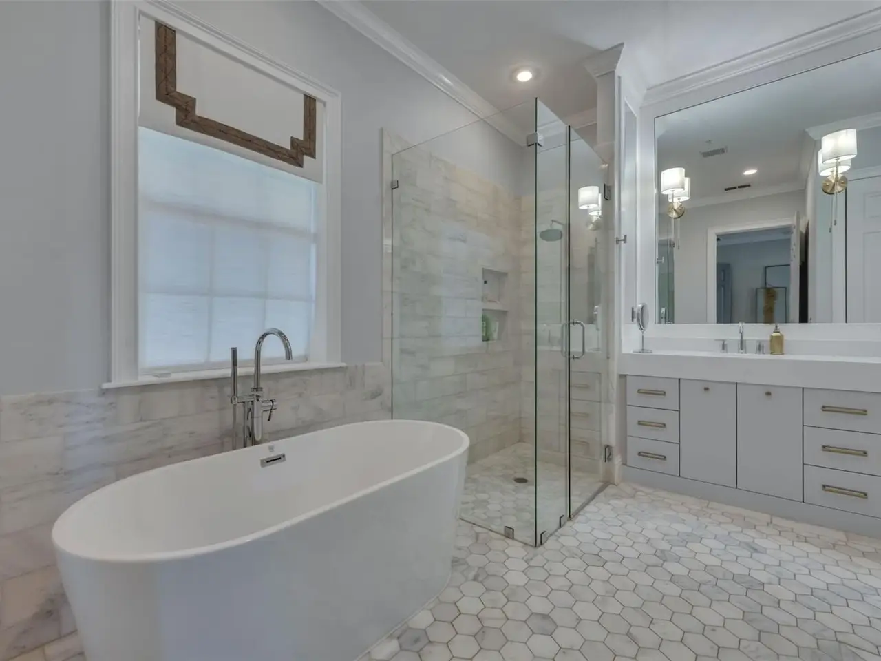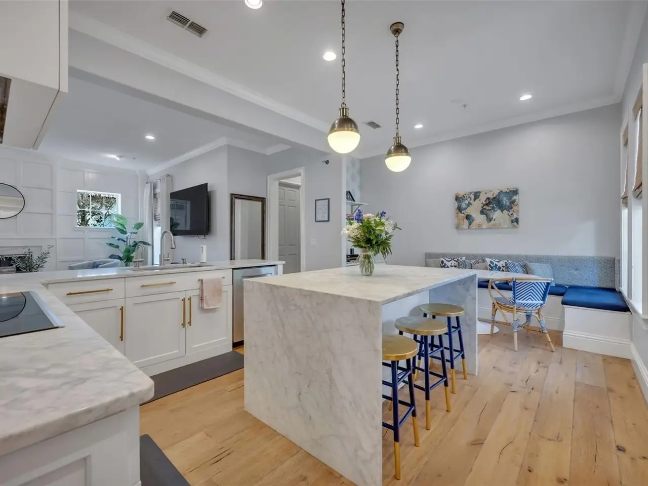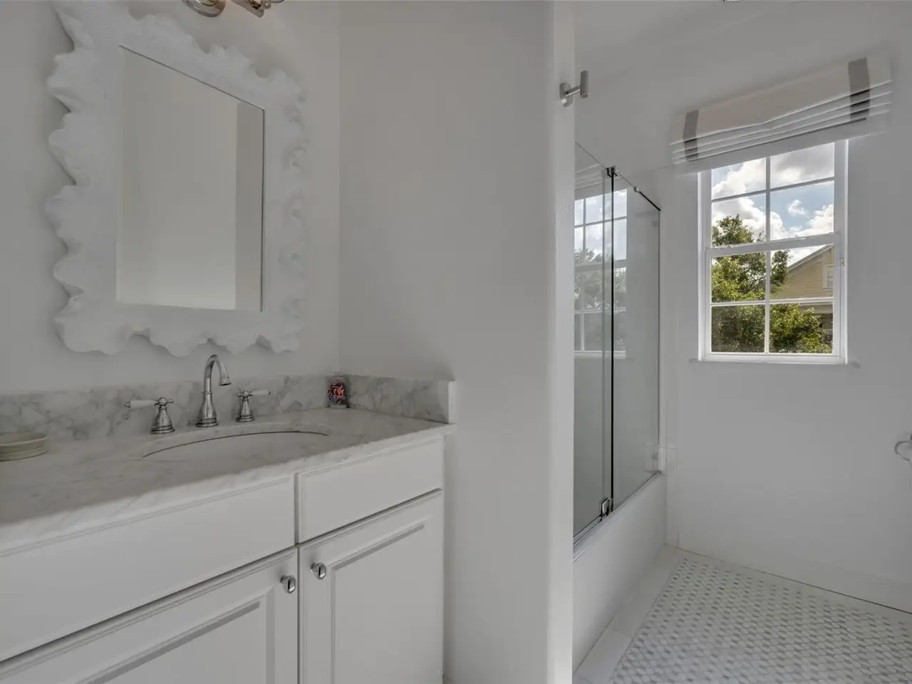 Under contract-accepting backup offers. Come see this stunning 5-bedroom, 4.5-bath, 3,811 sq ft home with a luxurious garage apartment, ideally situated on a prime corner lot in the heart of Baldwin Park. Inspired by the iconic style of Jonathan Adler, this home blends timeless sophistication with bold designer flair. Elegant details abound, including custom moldings, 8-inch wide French oak flooring, wainscoting in the office and dining room, and striking fixtures throughout. The light-filled great room features custom wall paneling, offering a refined yet welcoming space for relaxing or entertaining. The fully remodeled kitchen is a chef’s dream, boasting premium Bosch stainless steel appliances, custom marble countertops, and a show-stopping marble waterfall island with ample storage. Just off the kitchen, you’ll find a spacious walk-in pantry, a built-in office nook, and a custom banquette with hidden storage in the cozy eat-in area. The first-floor primary suite is a tranquil retreat, showcasing a beamed ceiling with tongue-and-groove paneling, crown molding, and French doors that open to a private side porch. The en suite bath feels like a spa, with marble floors and shower walls, a freestanding soaking tub, and a custom quartz-topped vanity. The second floor features two generously sized bedrooms connected by a shared Jack-and-Jill bathroom, an additional bedroom conveniently located next to a full hall bath, and a spacious, light-filled loft—perfect for use as a playroom, media room, or home office. Upstairs flooring has been recently upgraded with stylish laminate throughout, and all upstairs interior walls have been freshly repainted for a crisp, move-in-ready feel. Completing this exceptional property is a beautifully appointed garage apartment—ideal as a guest suite, home office, or rental opportunity—adding flexibility and value to an already incredible home. This is Baldwin Park living at its finest: elegant, functional, and effortlessly stylish. HVAC: 2021. Roof: 2021. New laminate floors and paint in the upstairs area of the main home.