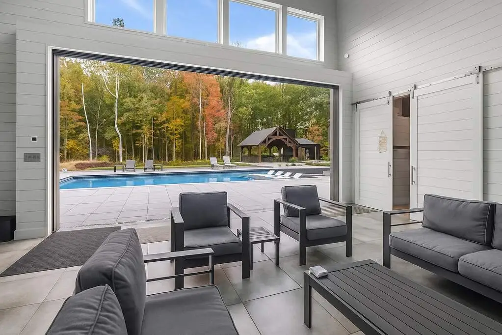 Nestled into seven wooded acres of complete privacy, this 9,828 sq ft architectural estate was designed and built as the personal residence of the Custom home builder, showcasing a level of craftsmanship rarely seen today. The 30 x 33 ft great room rises beneath 23-foot cedar ceilings wrapped with custom Cedar beams and illuminated by four circular LED fixtures. The chef's kitchen features a 17-foot island with three-inch-thick countertops, while the adjoining butler's pantry provides a second refrigerator, oven, microwave, and abundant storage. A striking live-edge Parota island conceals a hidden staircase leading to the wine cellar below. Two guest suites with private baths, an office with full bath, and a luxurious primary suite with heated floors in the bathroom, freestanding tub beside a fireplace, and steam shower complete the main level. Walls of motorized 20 x 10 ft Andersen pocket sliders connect the great room and 25 x 30 ft sunroom, extending to the 20 x 40 ft infinity-edge gunite pool with linear gas fireplace, illuminated putting green, bocce, and bean bag courts. The lower level includes a professional gym, billiard area, 4K theater with 160-inch screen and full bar. Outside, a hand-crafted Amish pavilion anchors the outdoor kitchen with pizza oven, multiple grills, bar island, and ambient lighting. A custom 18 x 36 ft pool house with full kitchen, bath, and Murphy bed completes this one-of-a-kind property.