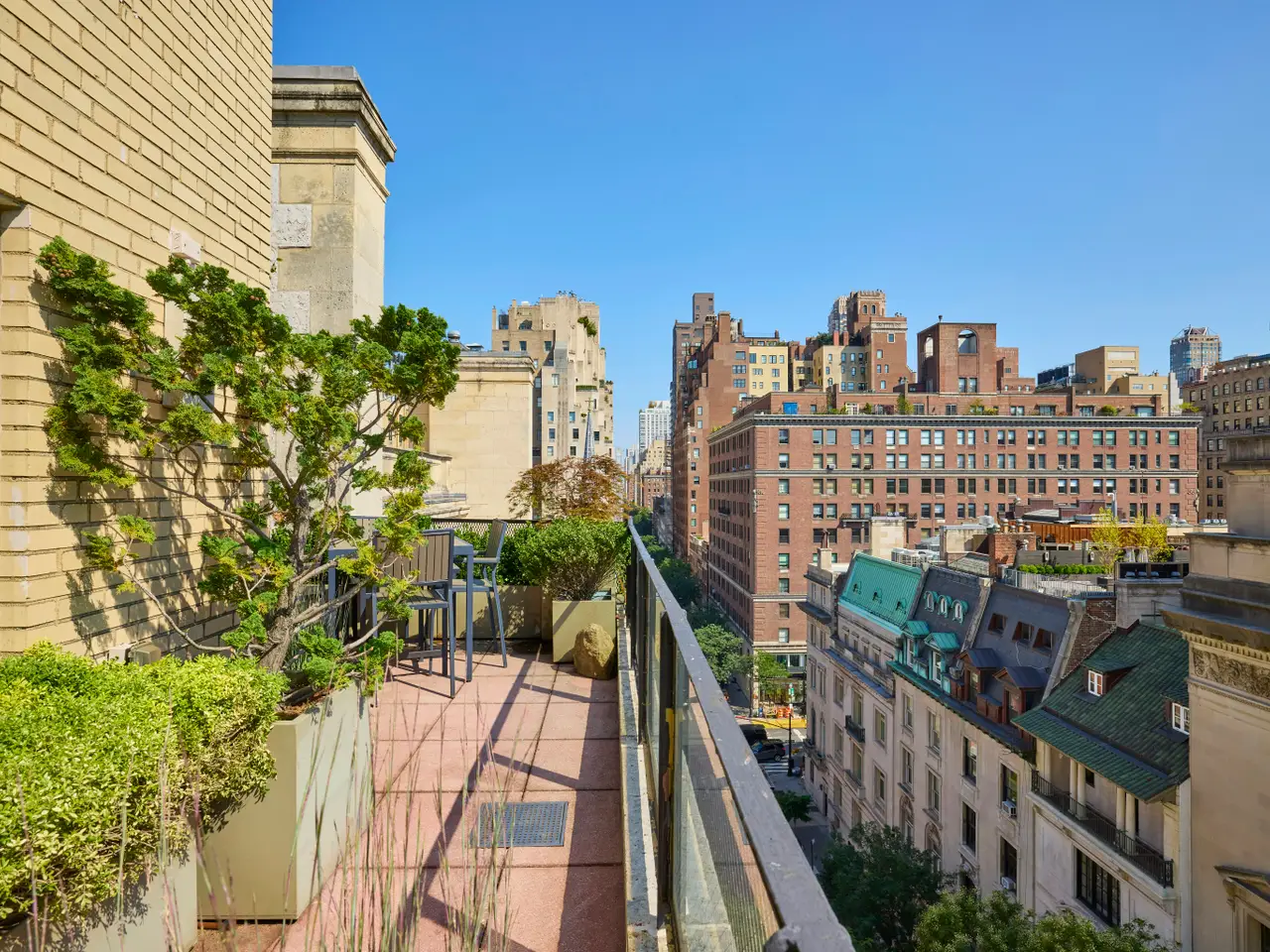 Elegant Duplex with Wrap Terrace Off Fifth Avenue This mint condition quiet, corner two-bedroom, 2.5 bath duplex off Fifth Avenue combines timeless custom design and bespoke finishes.  Surrounded by a serene wrap terrace, the apartment is bathed in sunlight and offers open views of Central Park and the Midtown skyline over the landmarked Frick Mansion. Beautifully designed and decorated by Jamie Herzlinger, this special home is both glamorous and comfortable. An attractive foyer with a hidden powder room leads to airy living and dining areas with buffed Venetian plaster walls, marble mantle, wood-burning fireplace, and oversized windows.  The sleek Allmilmo kitchen, with polished blue marble backsplash is equipped with Miele and Sub-Zero appliances, opens directly to the terrace-perfect for al fresco dining.  Up a graceful curved, Art Deco inspired staircase with a brushed chrome bannister, two bedrooms each feature  en-suite baths.  The primary suite enjoys both south and east exposures, the second bedroom, currently being used as a home office, has an Asko washer-dryer. The fully irrigated terrace offers seating and dining areas with iconic city and park views.  Additional highlights include automated lighting and shades, custom millwork throughout, excellent windows, and through-wall air conditioning. A windowed staff room on the lobby level trades with the apartment and every tenant has the use of an assigned large storage bin. Designed by Emery Roth and completed in 1948, 3 East 71st Street is an exceptionally well run, full-service, doorman coop with a live-in Resident Manager, fitness room, and pet-friendly policy.  Pieds-a-terre are welcome here.  Buyer pays 4% flip tax.  Please call or email for your private showing. Note: The maintenance includes both the apartment and staff room.