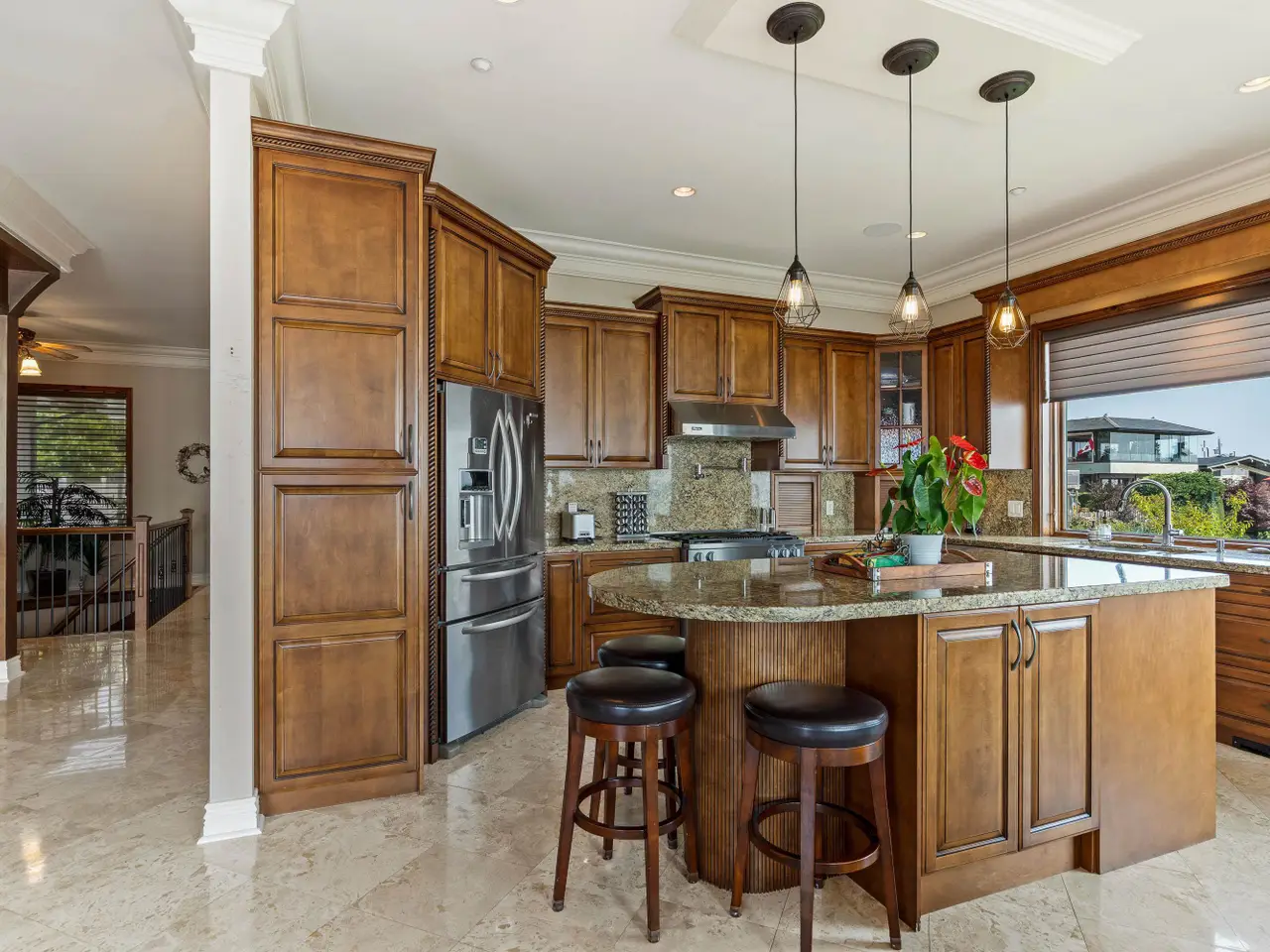 Sweeping ocean views from the moment you step inside the door. Very rare property with a fabulous 5653 sq. ft. home sitting on over a double lot of 8190 square feet next to parkland, with outstanding ocean views from all floors. Quality built with electric gate surrounding the level entrance & garage with excellent guest parking, 2x6 Douglas Fir construction, Pella wood windows with Low E, Travertine floors throughout main areas, dark stained Maple cabinets, granite counters, high end appliances, radiant in floor heat, control 4 lighting, sound system, butlers pantry, theatre room, hidden TV with remote, electric awnings, high ceilings on all floors. Bonus: legal 1 bedroom suite & separate area for guests. Gorgeous landscaping both front and back with water features. Outstanding home!
