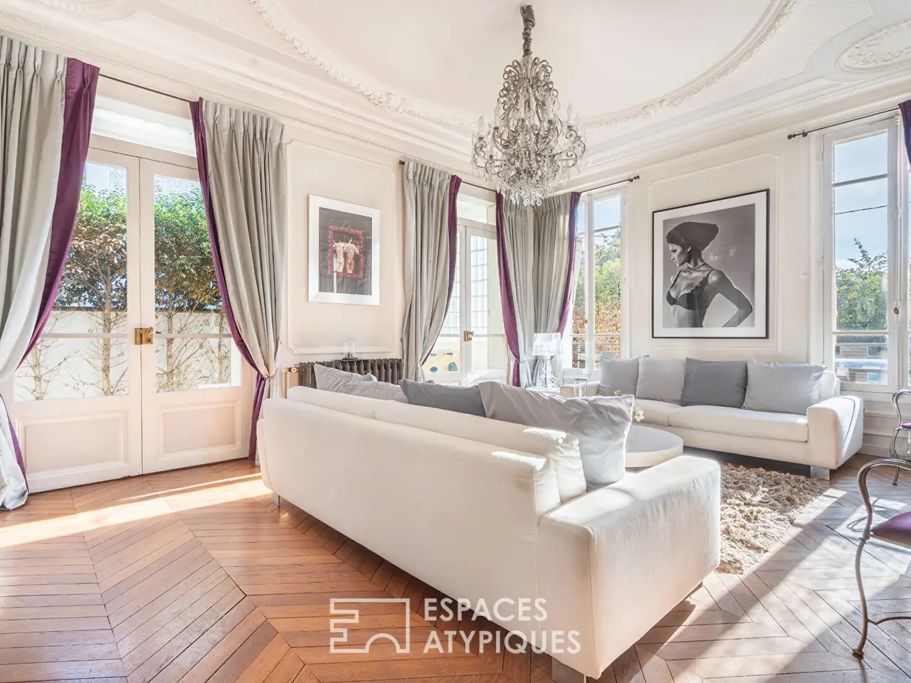 Located in the heart of Perreux-sur-Marne, this elegant and exceptional residence offers over 323 m2 of living space spread over four levels, set on a 480 m2 plot.Upon entering, the tone is set by a spacious hall adorned with superb antique tiles, in perfect harmony with the solid oak parquet flooring.A boudoir-like living room opens onto a lush garden, whose dense vegetation preserves a rare sense of privacy.The garden level captivates with its Haussmannian charm and majestic volumes, enhanced by remarkable architectural elements: period moldings, an authentic fireplace, herringbone parquet flooring, and generous ceiling heights give the space a refined and warm atmosphere.The double living room, bathed in natural light, is distinguished by its meticulous decoration, thoughtfully designed down to the smallest detail, providing a welcoming and elegant setting.Adjoining this reception area, a modern, independent kitchen, laid out lengthwise, extends into an intimate dining room, ideal for family meals.A custom-built, contemporary-style office offers direct access to a charming Art Deco terrace.The majestic period staircase leads to the first floor, where a vast landing leads to four bedrooms, one with a shower room and the other with a Byzantine-inspired bathroom adorned with colorful mosaics.A large dressing room, easily convertible into an additional bedroom, completes this sleeping area, along with a shower room, a laundry room, and a separate toilet.Upstairs, a spacious attic room with high ceilings is currently used as an office.The mezzanine floor houses a professional recording studio with high-end features and exceptional soundproofing.This level also includes two cellars and a boiler room. The property also benefits from two separate entrances, allowing for easy separation of a professional and living space.This rare configuration is ideal for a self-employed professional looking to set up their business from home, while maintaining the independence and tranquility of their family life.Outside, a large parking area can accommodate up to six vehicles, a rare asset in this sought-after area.This property elegantly combines old-world charm with contemporary comfort.Its generous volumes, light, and high-quality finishes make it a unique property on the market.It will appeal to lovers of unusual homes and those with a passion for classical architecture.Transportation: RER E 13-minute walkShops: 1-minute walkSchools: 5 to 10 minutes walkREF. 13358Additional information* 11 rooms* 6 bedrooms* 2 bathrooms* 1 bathroom* Floor : 3* 3 floors in the building* Outdoor space : 480 SQM* Property tax : 4 042 €Energy Performance CertificatePrimary energy consumptiond : 156 kWh/m2.yearHigh performance housing*A*B*C*156kWh/m2.year33*kg CO2/m2.yearD*E*F*GExtremely poor housing performance* Of which greenhouse gas emissionsd : 33 kg CO2/m2.yearLow CO2 emissions*A*B*C*33kg CO2/m2.yearD*E*F*GVery high CO2 emissionsEstimated average annual energy costs for standard use, indexed to specific years 2021, 2022, 2023 : between 4220 € and 5740 € Subscription IncludedAgency feesThe fees include VAT and are payable by the vendorMediatorMediation Franchise-Consommateurswww.mediation-franchise.com29 Boulevard de Courcelles 75008 ParisInformation on the risks to which this property is exposed is available on
