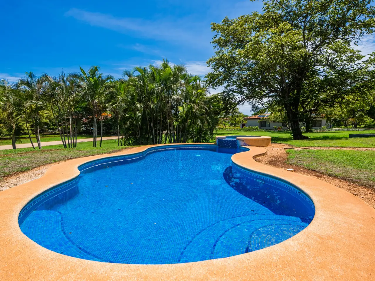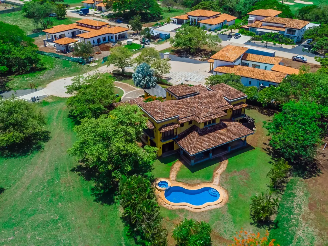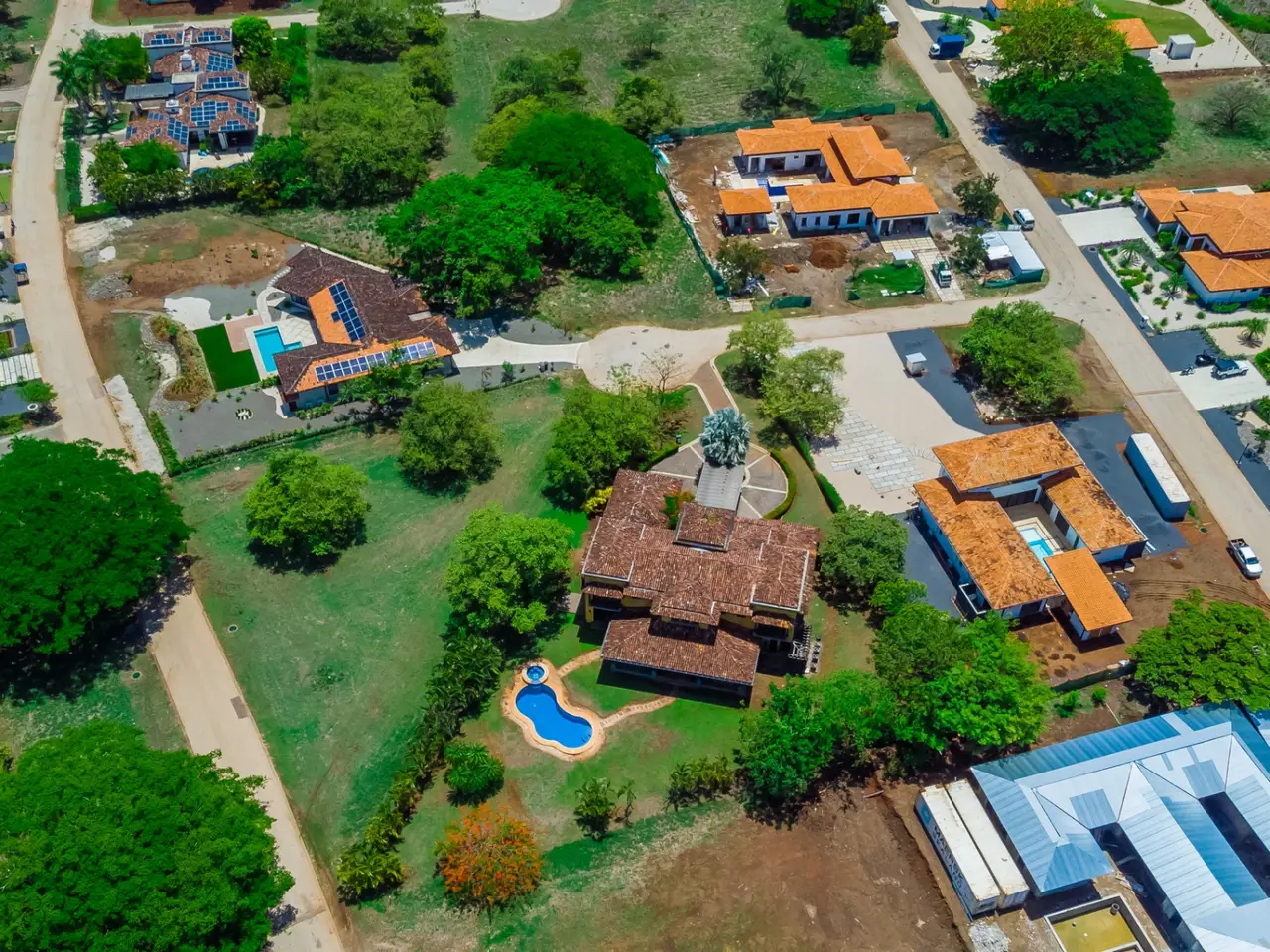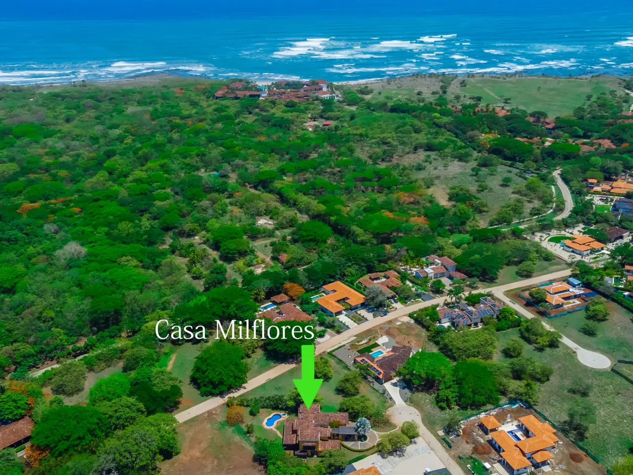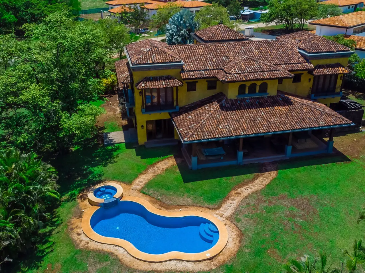 Welcome to Casa Miraflores, an exquisite colonial-style estate home located in the prestigious Reserva de Golf Community within Hacienda Pinilla. This luxurious property offers a captivating blend of elegance and comfort, with four bedrooms, five and a half bathrooms, a maids quarter, and an impressive total area of 6,500 square feet. Situated on a sprawling lot spanning 2,458.86m2, Casa Miraflores presents a truly remarkable living experience. As you approach the residence, you are greeted by a grand entrance adorned with colossal columns, creating a covered space that invites you into the house. The front of the property features a roundabout surrounded by mature landscaping, with a majestic silver Bismarck palm tree at its center, adding a touch of natural beauty. Upon entering the home, you will discover a two-story layout designed to provide ample space and comfort. The upper floor boasts two oversized master suites, each equipped with a king-sized bed, jacuzzi tub, walk-in closet, and a private balcony. These master suites offer a serene retreat, allowing you to unwind and enjoy the picturesque views. The main floor of Casa Miraflores features stone floors adorned with unique Spanish tile accents, adding a touch of charm to the living space. Designed with entertaining in mind, the home offers a main floor living room, an upstairs living room, and an outdoor living room, all capable of accommodating large groups comfortably. The main living room boasts two-story-high ceilings, creating an atmosphere of grandeur. For more intimate gatherings, curved wooden sliding doors can be closed, separating the kitchen from the living and dining room. The main floor also has 2 large bedrooms with ensuite bathrooms. One has a jacuzzi and the other has an outdoor shower with a volcanic rock wall. The residence offers four distinct dining areas, catering to different occasions. The private dining room showcases a striking brick feature wall and elegant teak floors, complemented by teak beams on the ceiling. Additionally, there are dining tables in the open living room, in the kitchen, and in the covered outdoor terrace. Throughout the home, you will find solid wood cabinetry, adding a touch of warmth and sophistication to both the kitchen and bathrooms. The kitchen itself is a chef's delight, boasting unique green-colored granite countertops and stainless steel Viking appliances including a six-burner gas stove. With its spacious layout and modern amenities, this culinary haven offers a delightful experience for cooking enthusiasts. Adjacent to the kitchen is a massive covered terrace, perfect for al fresco dining and relaxation. Featuring caña brava ceilings, this outdoor space creates a seamless connection between indoor and outdoor living. Out here you will find a billiards table, an outdoor living room and dining section. A standout feature of Casa Miraflores is its stunning curved teak wood staircase, enhanced by a wrought iron railing and an impressive wrought iron chandelier. Ascending to the second floor, you will find teak floors throughout and Spanish tile floors in the bathrooms. The bathrooms themselves are adorned with elegant marble countertops and two-person jacuzzi tubs, providing a luxurious bathing experience. The second floor also features an open living room with two leather couches, a balcony overlooking the outdoors, and a connection to the living room below. Perfect for relaxation and entertainment, this space includes a television for your viewing pleasure. To ensure comfort throughout the year, the home is equipped with central air conditioning. The backyard, surrounded by palms, has a large pool and outdoor family-sized jacuzzi to cool off in. Also included is a deep two-car garage, offering ample space for storage, including golf carts and beach toys, in addition to accommodating two cars. Casa Miraflores in the Reserva de Golf Community of Hacienda Pinilla is a remarkable colonial-style estate home that seamlessly combines luxurious living with timeless charm. With its spacious interiors, elegant features, and stunning outdoor areas, this property invites you to experience the epitome of refined living in a tropical paradise. We would love to show you this beauty! Please reach out for a live or virtual showing.