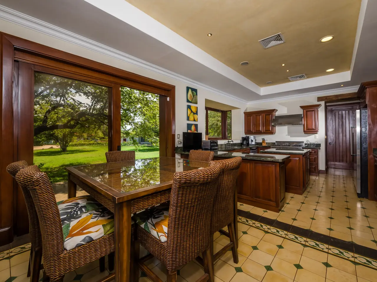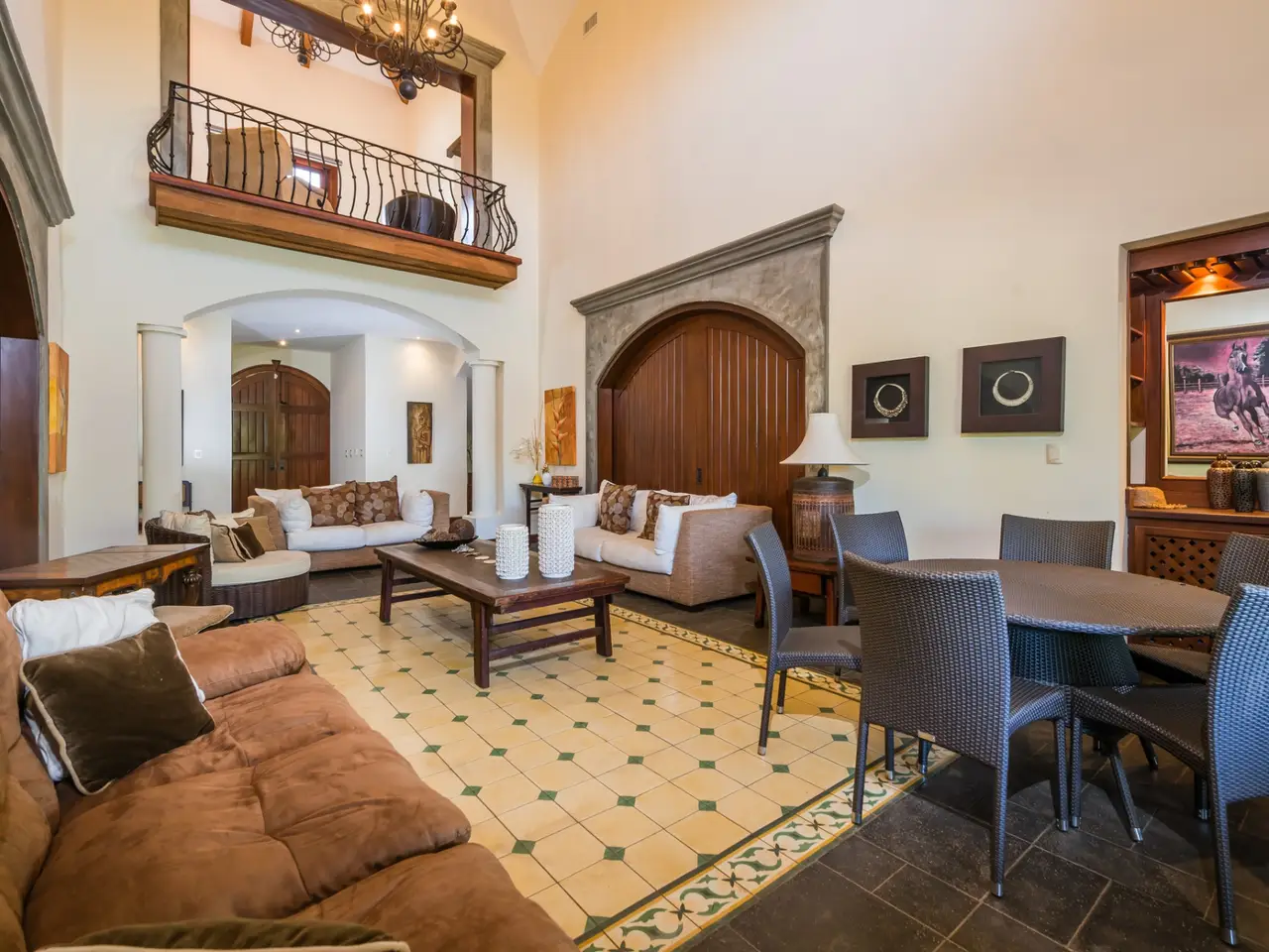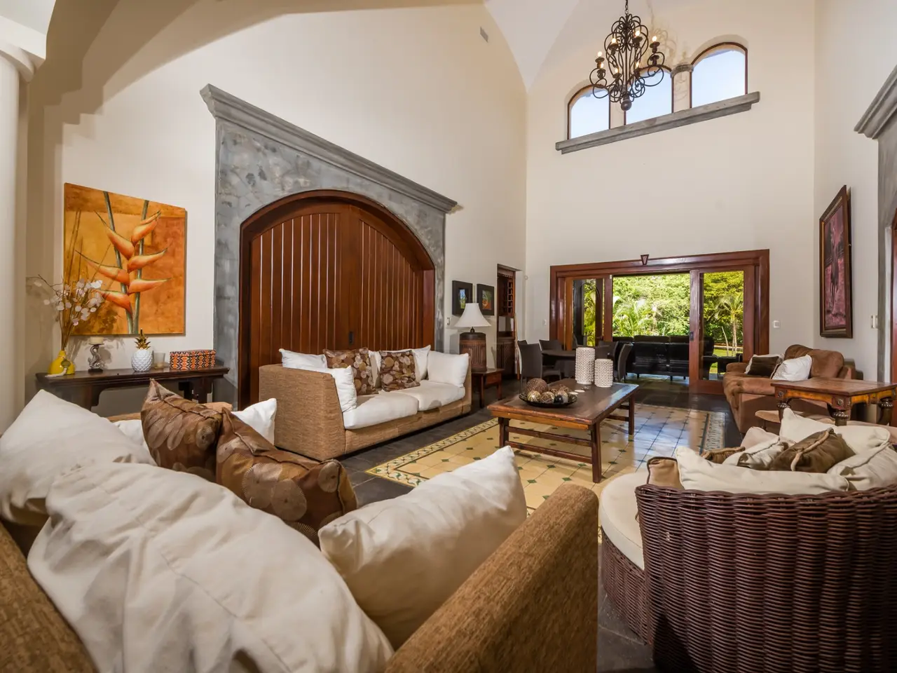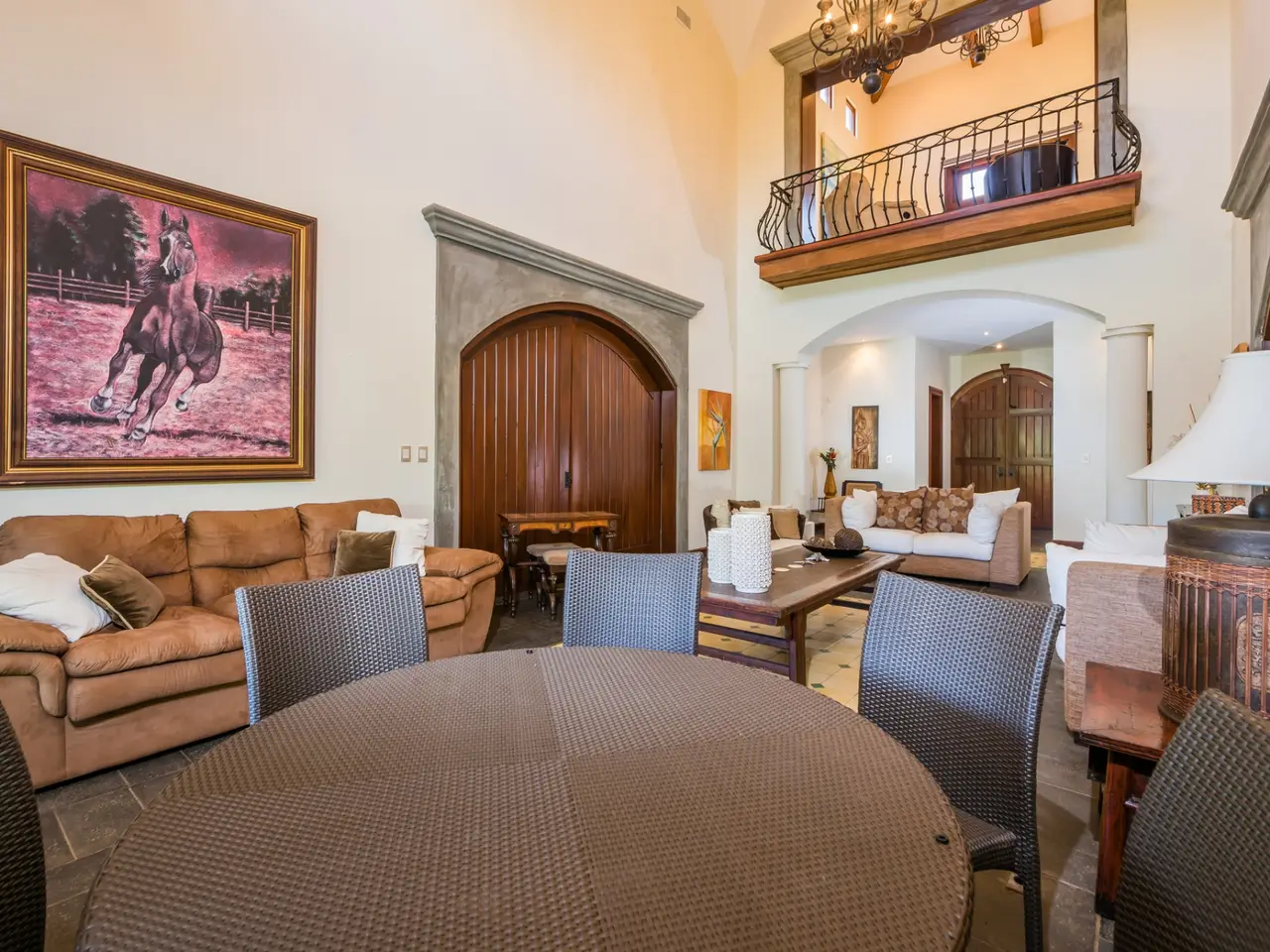 Welcome to Casa Miraflores, an exquisite colonial-style estate home located in the prestigious Reserva de Golf Community within Hacienda Pinilla. This luxurious property offers a captivating blend of elegance and comfort, with four bedrooms, five and a half bathrooms, a maids quarter, and an impressive total area of 6,500 square feet. Situated on a sprawling lot spanning 2,458.86m2, Casa Miraflores presents a truly remarkable living experience. As you approach the residence, you are greeted by a grand entrance adorned with colossal columns, creating a covered space that invites you into the house. The front of the property features a roundabout surrounded by mature landscaping, with a majestic silver Bismarck palm tree at its center, adding a touch of natural beauty. Upon entering the home, you will discover a two-story layout designed to provide ample space and comfort. The upper floor boasts two oversized master suites, each equipped with a king-sized bed, jacuzzi tub, walk-in closet, and a private balcony. These master suites offer a serene retreat, allowing you to unwind and enjoy the picturesque views. The main floor of Casa Miraflores features stone floors adorned with unique Spanish tile accents, adding a touch of charm to the living space. Designed with entertaining in mind, the home offers a main floor living room, an upstairs living room, and an outdoor living room, all capable of accommodating large groups comfortably. The main living room boasts two-story-high ceilings, creating an atmosphere of grandeur. For more intimate gatherings, curved wooden sliding doors can be closed, separating the kitchen from the living and dining room. The main floor also has 2 large bedrooms with ensuite bathrooms. One has a jacuzzi and the other has an outdoor shower with a volcanic rock wall. The residence offers four distinct dining areas, catering to different occasions. The private dining room showcases a striking brick feature wall and elegant teak floors, complemented by teak beams on the ceiling. Additionally, there are dining tables in the open living room, in the kitchen, and in the covered outdoor terrace. Throughout the home, you will find solid wood cabinetry, adding a touch of warmth and sophistication to both the kitchen and bathrooms. The kitchen itself is a chef's delight, boasting unique green-colored granite countertops and stainless steel Viking appliances including a six-burner gas stove. With its spacious layout and modern amenities, this culinary haven offers a delightful experience for cooking enthusiasts. Adjacent to the kitchen is a massive covered terrace, perfect for al fresco dining and relaxation. Featuring caña brava ceilings, this outdoor space creates a seamless connection between indoor and outdoor living. Out here you will find a billiards table, an outdoor living room and dining section. A standout feature of Casa Miraflores is its stunning curved teak wood staircase, enhanced by a wrought iron railing and an impressive wrought iron chandelier. Ascending to the second floor, you will find teak floors throughout and Spanish tile floors in the bathrooms. The bathrooms themselves are adorned with elegant marble countertops and two-person jacuzzi tubs, providing a luxurious bathing experience. The second floor also features an open living room with two leather couches, a balcony overlooking the outdoors, and a connection to the living room below. Perfect for relaxation and entertainment, this space includes a television for your viewing pleasure. To ensure comfort throughout the year, the home is equipped with central air conditioning. The backyard, surrounded by palms, has a large pool and outdoor family-sized jacuzzi to cool off in. Also included is a deep two-car garage, offering ample space for storage, including golf carts and beach toys, in addition to accommodating two cars. Casa Miraflores in the Reserva de Golf Community of Hacienda Pinilla is a remarkable colonial-style estate home that seamlessly combines luxurious living with timeless charm. With its spacious interiors, elegant features, and stunning outdoor areas, this property invites you to experience the epitome of refined living in a tropical paradise. We would love to show you this beauty! Please reach out for a live or virtual showing.