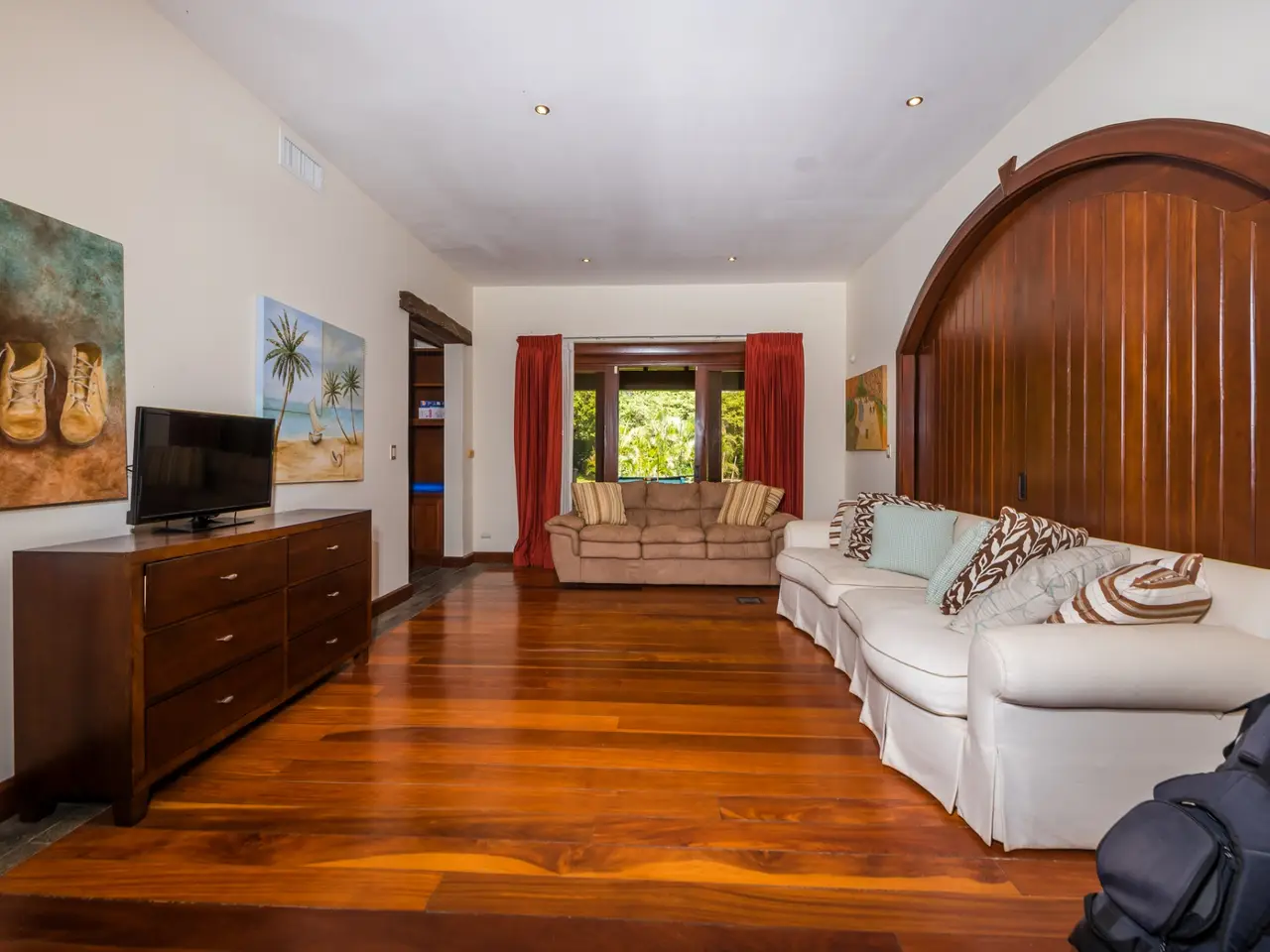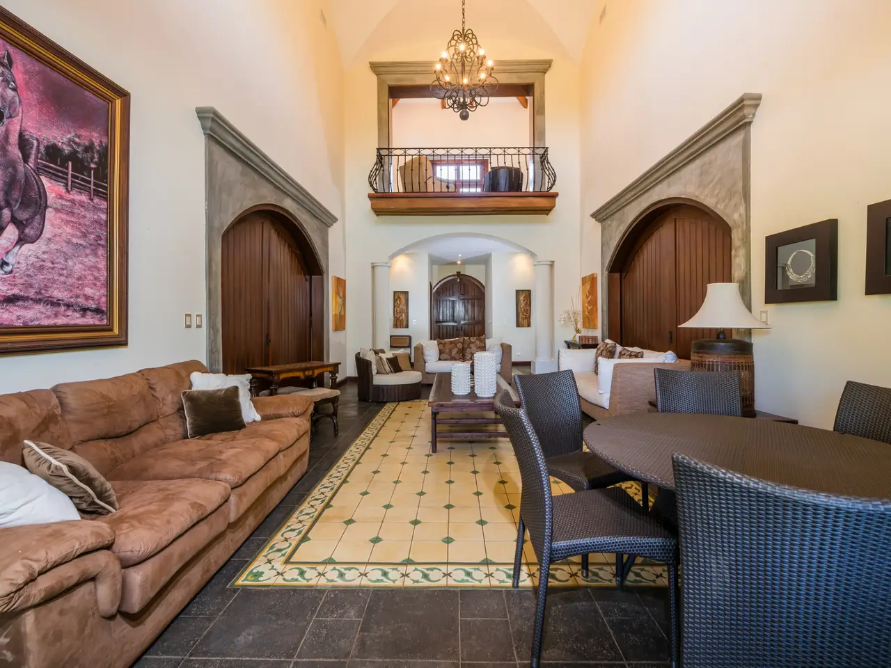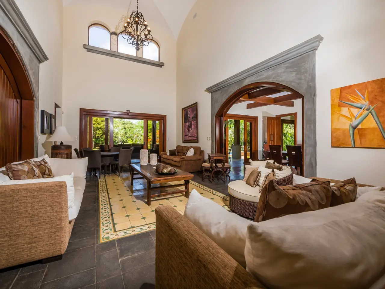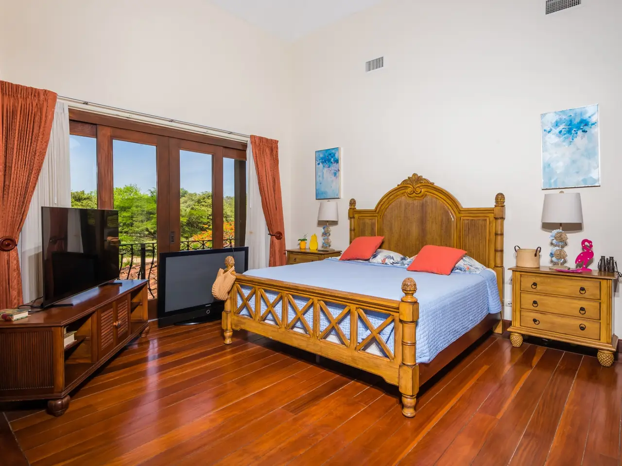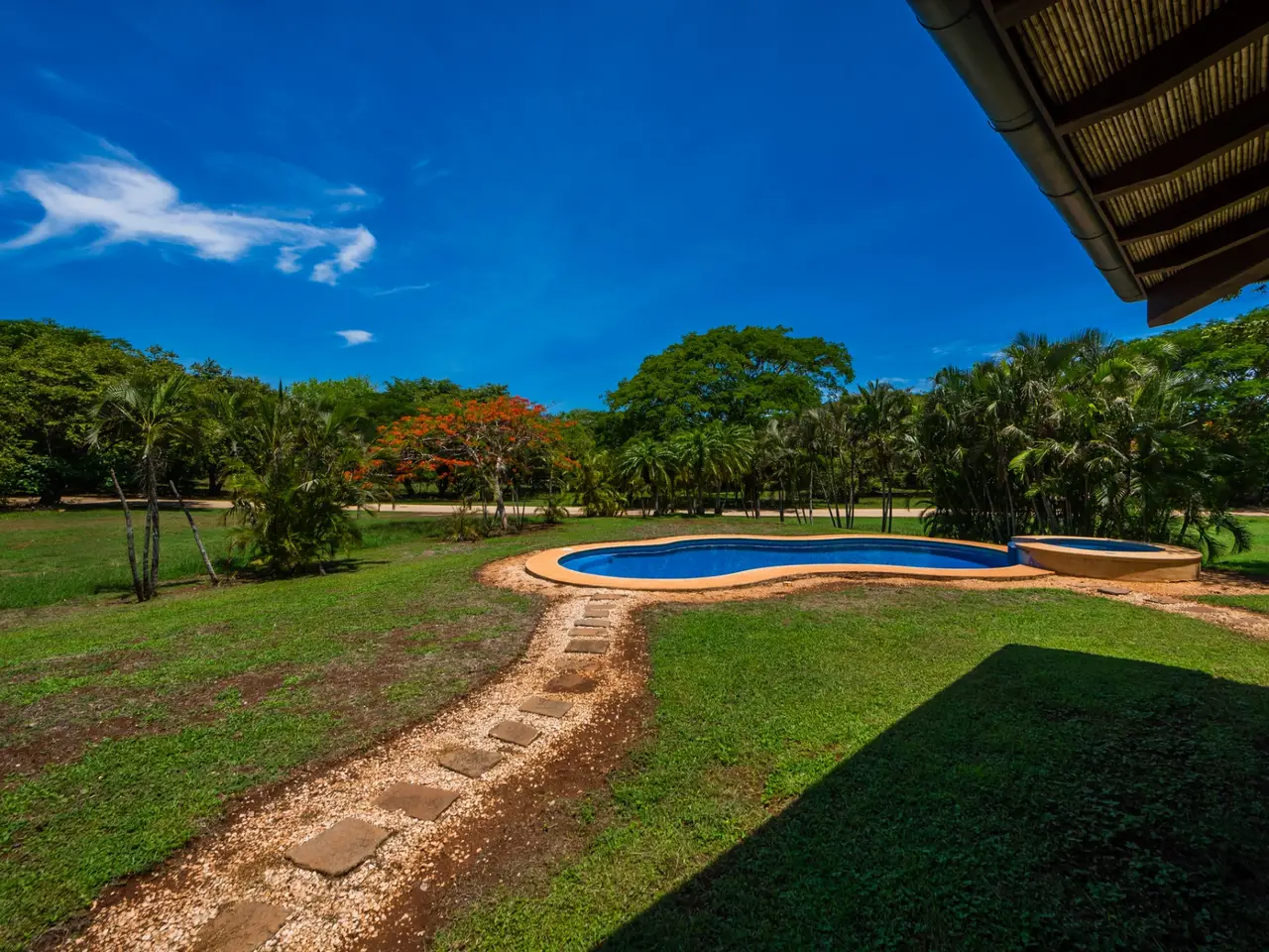 Welcome to Casa Miraflores, an exquisite colonial-style estate home located in the prestigious Reserva de Golf Community within Hacienda Pinilla. This luxurious property offers a captivating blend of elegance and comfort, with four bedrooms, five and a half bathrooms, a maids quarter, and an impressive total area of 6,500 square feet. Situated on a sprawling lot spanning 2,458.86m2, Casa Miraflores presents a truly remarkable living experience. As you approach the residence, you are greeted by a grand entrance adorned with colossal columns, creating a covered space that invites you into the house. The front of the property features a roundabout surrounded by mature landscaping, with a majestic silver Bismarck palm tree at its center, adding a touch of natural beauty. Upon entering the home, you will discover a two-story layout designed to provide ample space and comfort. The upper floor boasts two oversized master suites, each equipped with a king-sized bed, jacuzzi tub, walk-in closet, and a private balcony. These master suites offer a serene retreat, allowing you to unwind and enjoy the picturesque views. The main floor of Casa Miraflores features stone floors adorned with unique Spanish tile accents, adding a touch of charm to the living space. Designed with entertaining in mind, the home offers a main floor living room, an upstairs living room, and an outdoor living room, all capable of accommodating large groups comfortably. The main living room boasts two-story-high ceilings, creating an atmosphere of grandeur. For more intimate gatherings, curved wooden sliding doors can be closed, separating the kitchen from the living and dining room. The main floor also has 2 large bedrooms with ensuite bathrooms. One has a jacuzzi and the other has an outdoor shower with a volcanic rock wall. The residence offers four distinct dining areas, catering to different occasions. The private dining room showcases a striking brick feature wall and elegant teak floors, complemented by teak beams on the ceiling. Additionally, there are dining tables in the open living room, in the kitchen, and in the covered outdoor terrace. Throughout the home, you will find solid wood cabinetry, adding a touch of warmth and sophistication to both the kitchen and bathrooms. The kitchen itself is a chef's delight, boasting unique green-colored granite countertops and stainless steel Viking appliances including a six-burner gas stove. With its spacious layout and modern amenities, this culinary haven offers a delightful experience for cooking enthusiasts. Adjacent to the kitchen is a massive covered terrace, perfect for al fresco dining and relaxation. Featuring caña brava ceilings, this outdoor space creates a seamless connection between indoor and outdoor living. Out here you will find a billiards table, an outdoor living room and dining section. A standout feature of Casa Miraflores is its stunning curved teak wood staircase, enhanced by a wrought iron railing and an impressive wrought iron chandelier. Ascending to the second floor, you will find teak floors throughout and Spanish tile floors in the bathrooms. The bathrooms themselves are adorned with elegant marble countertops and two-person jacuzzi tubs, providing a luxurious bathing experience. The second floor also features an open living room with two leather couches, a balcony overlooking the outdoors, and a connection to the living room below. Perfect for relaxation and entertainment, this space includes a television for your viewing pleasure. To ensure comfort throughout the year, the home is equipped with central air conditioning. The backyard, surrounded by palms, has a large pool and outdoor family-sized jacuzzi to cool off in. Also included is a deep two-car garage, offering ample space for storage, including golf carts and beach toys, in addition to accommodating two cars. Casa Miraflores in the Reserva de Golf Community of Hacienda Pinilla is a remarkable colonial-style estate home that seamlessly combines luxurious living with timeless charm. With its spacious interiors, elegant features, and stunning outdoor areas, this property invites you to experience the epitome of refined living in a tropical paradise. We would love to show you this beauty! Please reach out for a live or virtual showing.