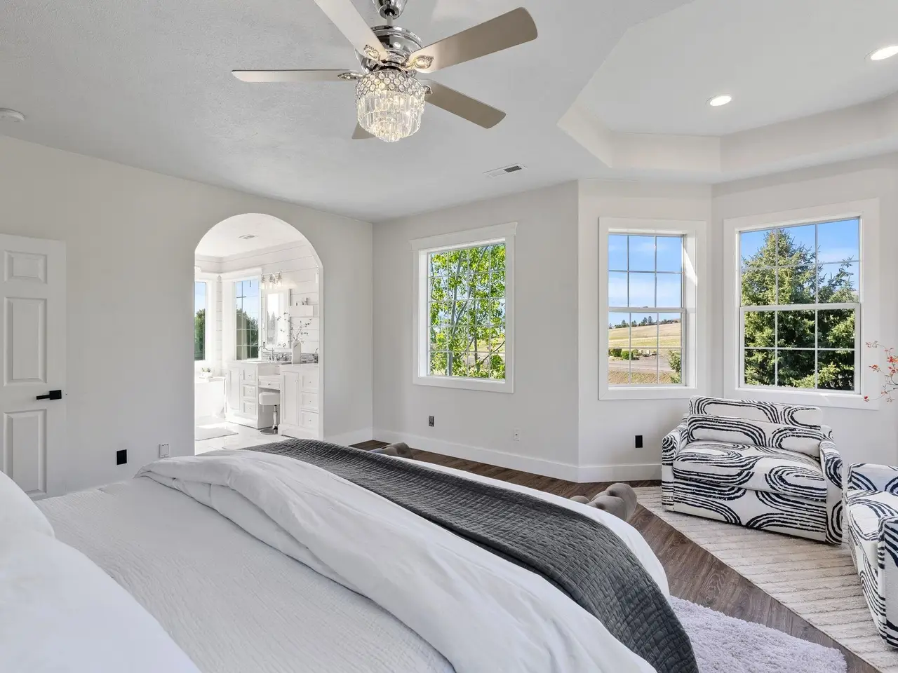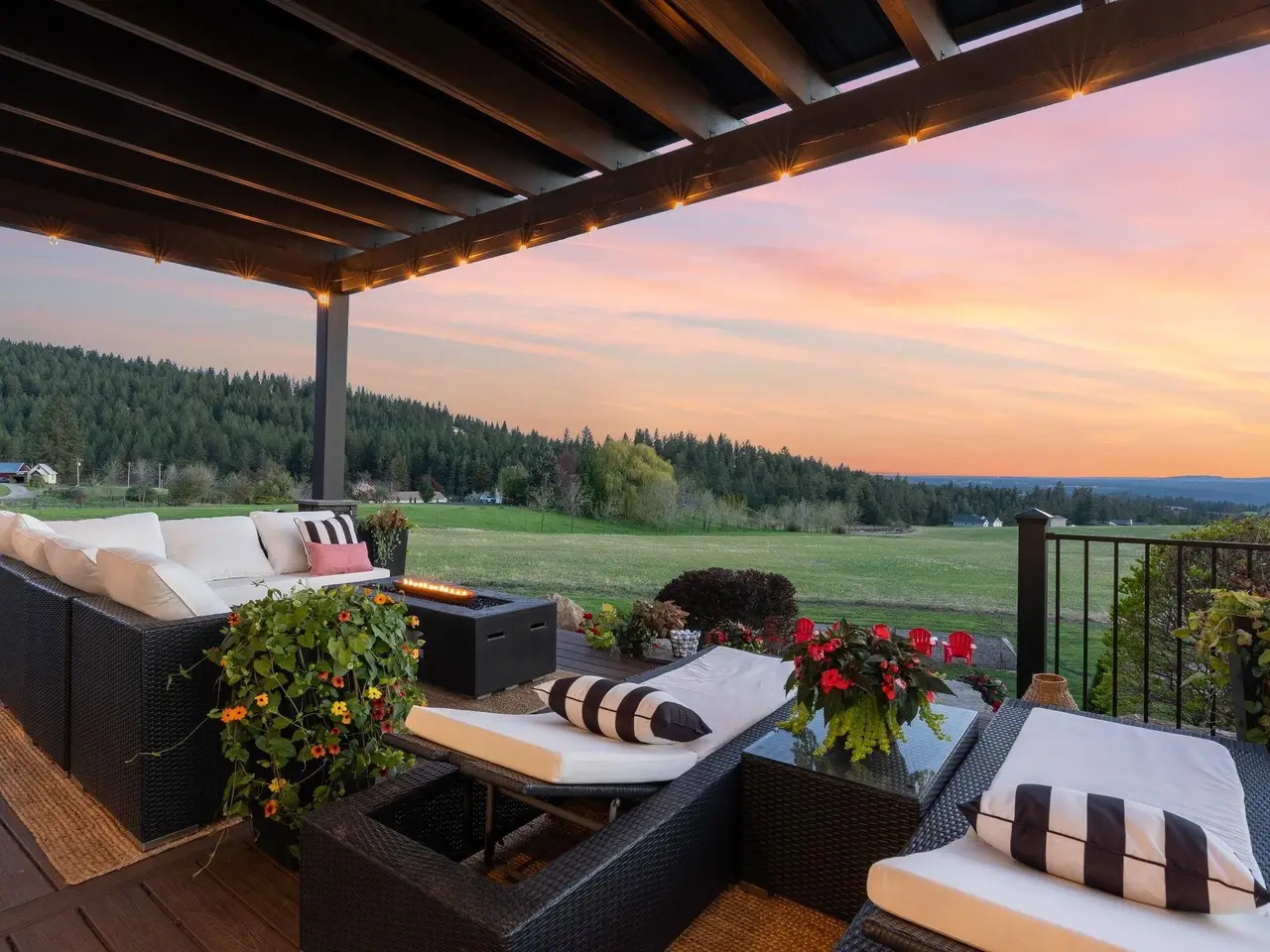 Do you like sunsets? Don't miss this exquisite estate providing a lifestyle of rural privacy, with a breathtaking panoramic view of the Palouse, while being close to schools, shopping and restaurants. Custom built with an open and elegant floor plan, including tall ceilings and windows bringing in much light and the stunning view. Ceilings are adorned with crown moldings, the living room features a majestic fireplace with built-ins, and granite countertops are throughout the main floor. The spacious kitchen includes high cabinets and dark wood, accented with white tile. The double stairway leads you up to a primary suite which has been updated to include Italian tile, heated floors, a walk-in shower, and beautifully designed California Closets. 4 additional bedrooms and a bath make up the second floor. Walk-out basement shows the love of sports, with a large family room, two bedrooms (1 non-egress), full bath and storage. The pristine landscaping enhances the accompanying views.