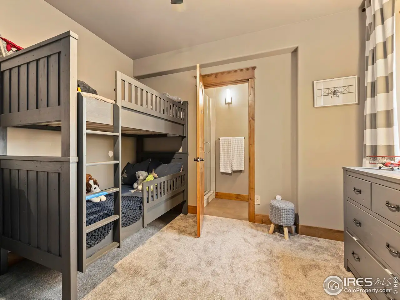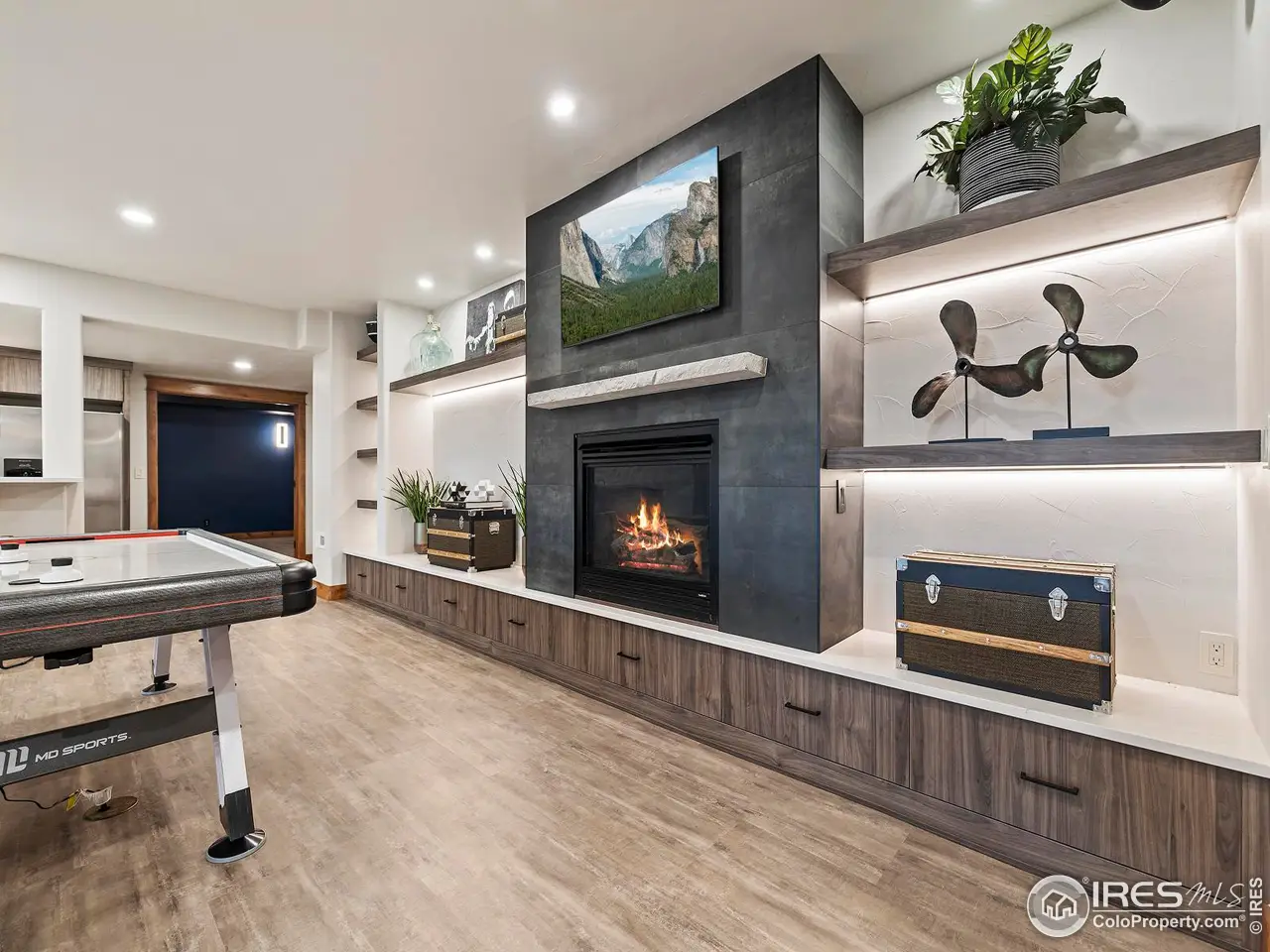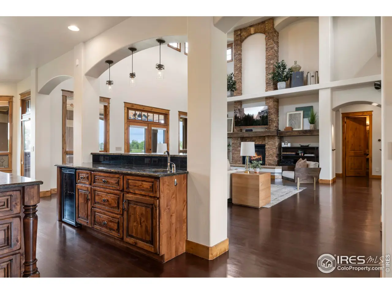 This luxury home at 863 Riparian Way in Fort Collins is a modern masterpiece. The gourmet kitchen includes granite countertops, a spacious island, and premium appliances: six-burner Viking range, double oven, wine fridge, ice maker, Samsung Smart Refrigerator, and pot filler. With under-cabinet lighting and a large walk-in pantry, breakfast nook with a custom wood-lined ceiling and bay window offers panoramic foothill views. The formal dining room has a 12' coffered ceiling, designer lighting, and a pass-through buffet perfect for entertaining. In the great room, 23' ceilings, hand-troweled walls, and a stone fireplace framed by reclaimed wood shelves create a stunning focal point. The primary suite features a gas fireplace, coffee bar, walk-in closet, bathroom with steam shower, heated floors, and access to a private patio wired for a hot tub. The main floor study doubles as a fifth bedroom with vaulted ceilings, built-in cabinetry, and an adjacent 3/4 bath. Upstairs, the ensuite has a gas fireplace, wet bar, vaulted ceilings, and 3/4 bath. Secondary bedrooms have new carpet (2022), walk-in closets, and remodeled ensuites with custom cabinets and designer fixtures. The remodeled basement (2022) includes a wet bar with quartz counters, luxury vinyl flooring, a wine cellar with copper ceiling, a theater room with projector, and ample storage. A stone gas fireplace and built-in shelving add warmth to the game room. From coffered ceilings to high-end finishes, this home showcases impeccable craftsmanship. Enjoy Colorado foothill views from the upper Trex deck with a built-in grill, heaters, sun shades, and fans. The walkout lower level has a wood-burning fireplace, water feature, and outdoor kitchen with grill, mini fridge, sink, granite island, and beverage sink. An aggregate patio leads to a garden, horseshoe pit, and fire pit. This property backs to HOA open space, with forever views and a temperature-controlled 4-car garage with electric car charger hookups.