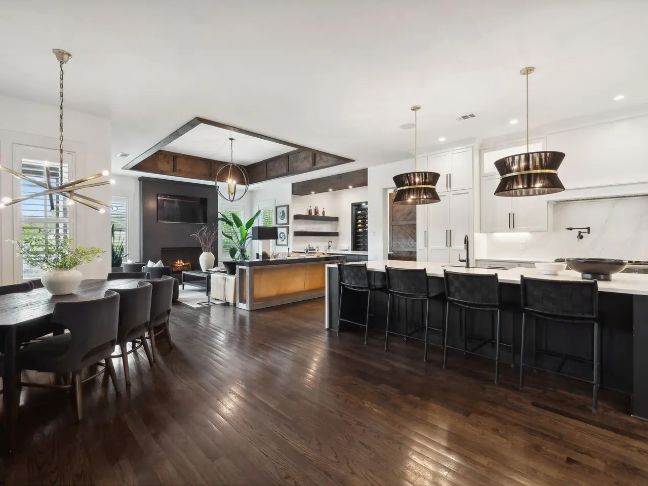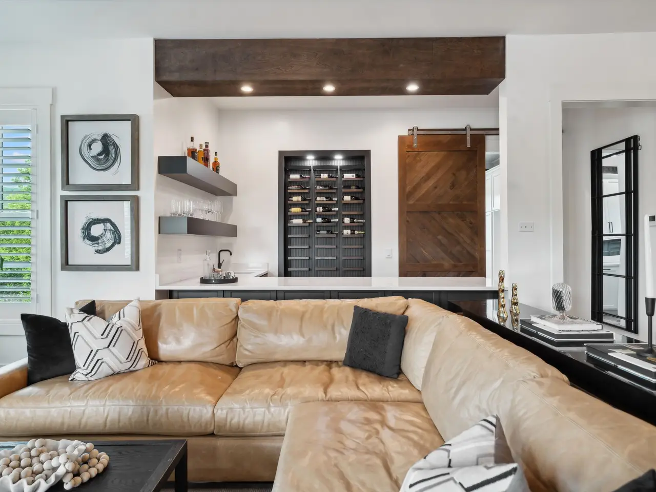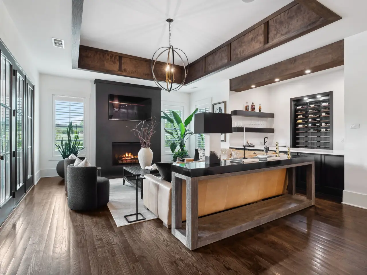 Step inside to an open-concept living room with floor-to-ceiling tile fireplace, gas logs, and expansive golf course views. The gourmet chef's kitchen is a centerpiece, boasting a quartz waterfall island, stainless steel appliances, ceiling-height custom cabinetry, pot filler, under-cabinet lighting, and hidden walk-in pantry. A second living area with wood-accented tray ceiling flows into a designer wet bar with wine display and dual beverage coolers--ideal for entertaining.