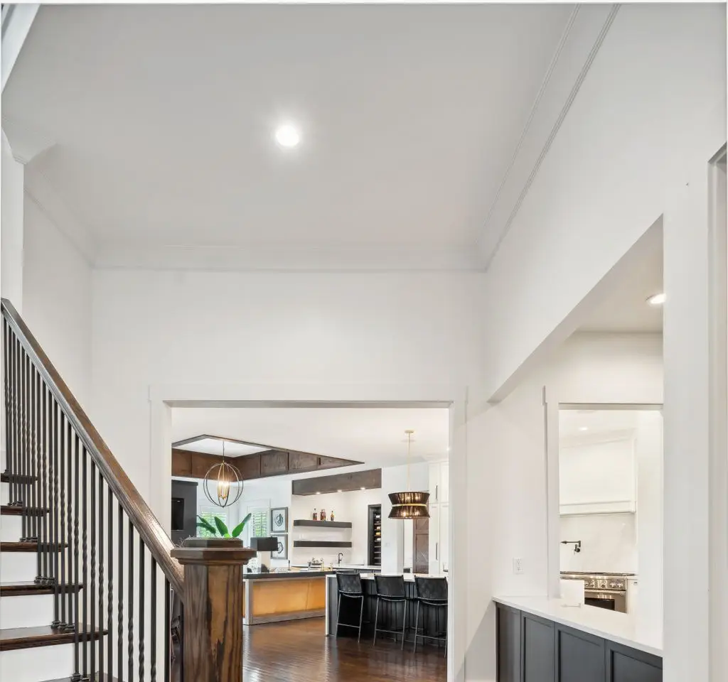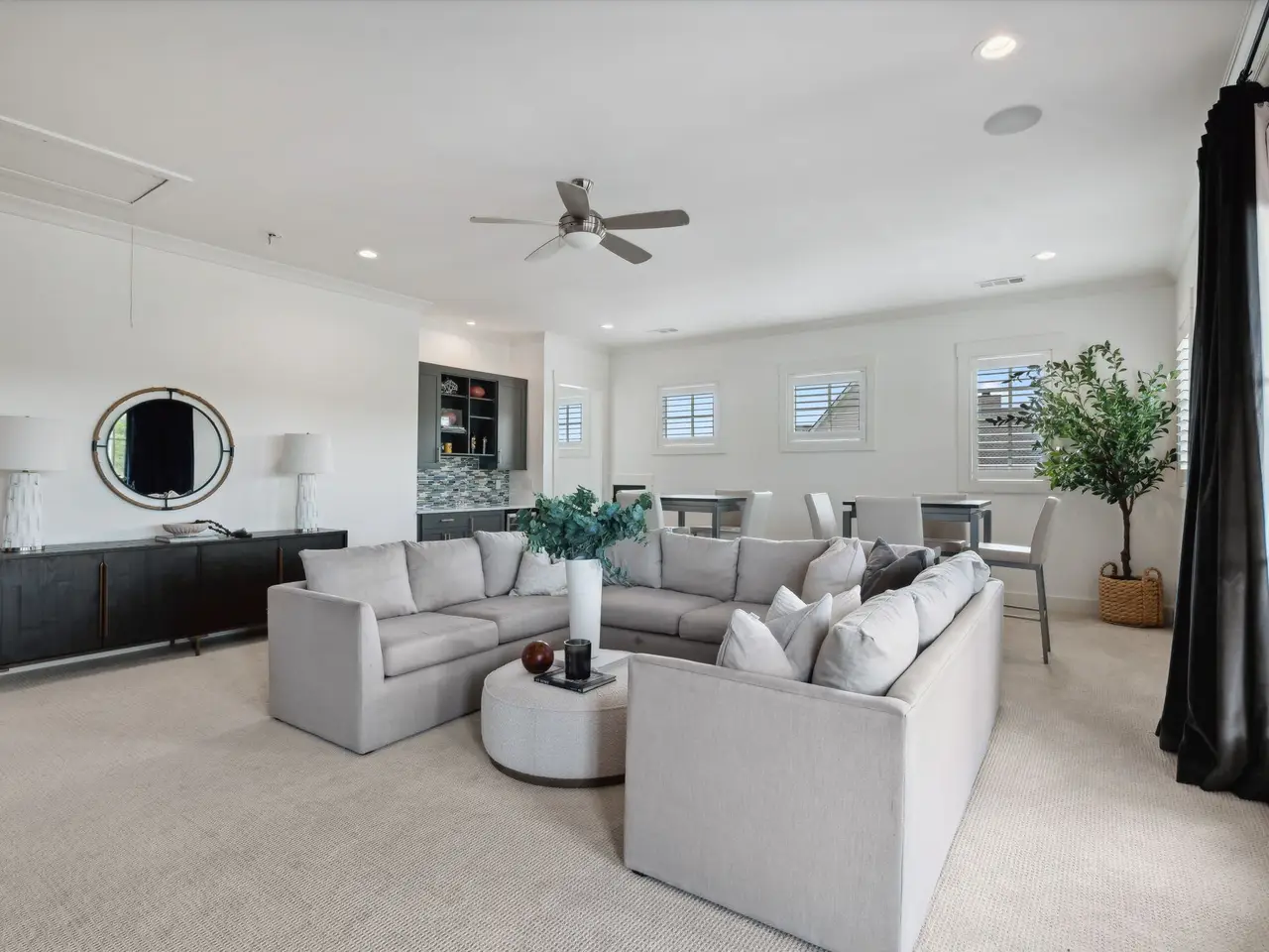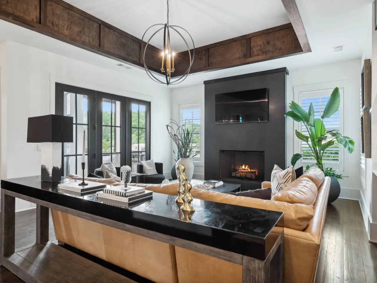 Step inside to an open-concept living room with floor-to-ceiling tile fireplace, gas logs, and expansive golf course views. The gourmet chef's kitchen is a centerpiece, boasting a quartz waterfall island, stainless steel appliances, ceiling-height custom cabinetry, pot filler, under-cabinet lighting, and hidden walk-in pantry. A second living area with wood-accented tray ceiling flows into a designer wet bar with wine display and dual beverage coolers--ideal for entertaining.