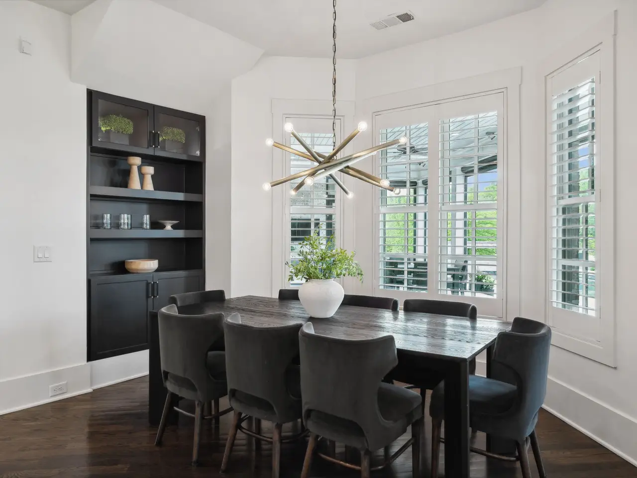 The main level also features a formal dining room with butler's pantry, private office with custom built-ins, spacious laundry room with island, and drop zone. The primary suite retreat overlooks the golf course with white brick accents, spa-inspired bath, soaking tub, dual vanities, and oversized dual-entry shower. Two additional en-suite bedrooms plus a powder room complete the main floor.