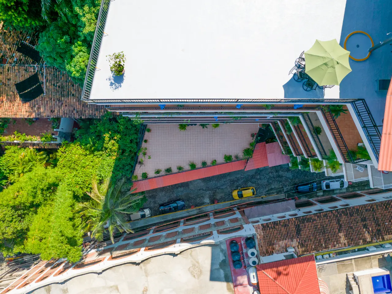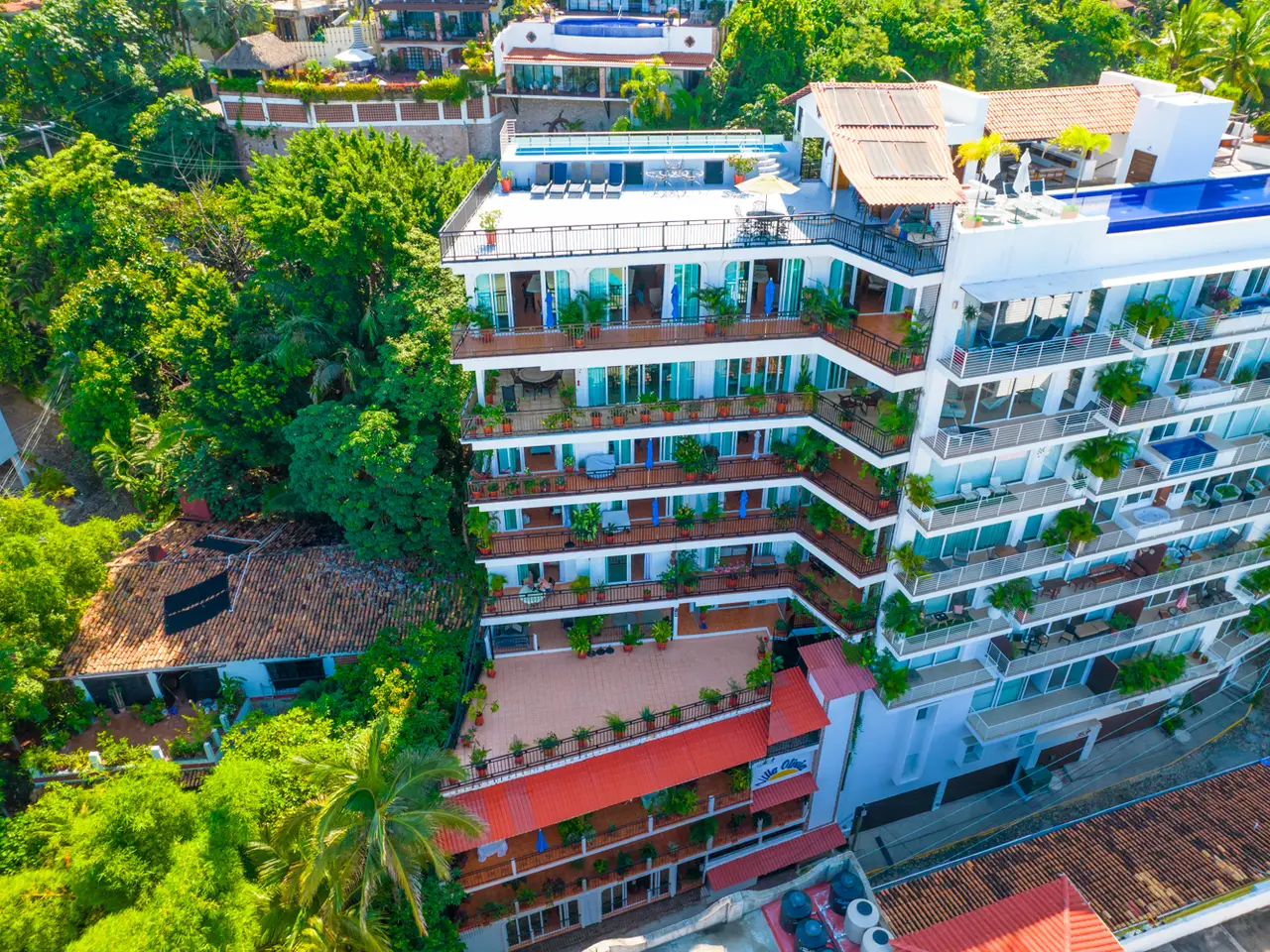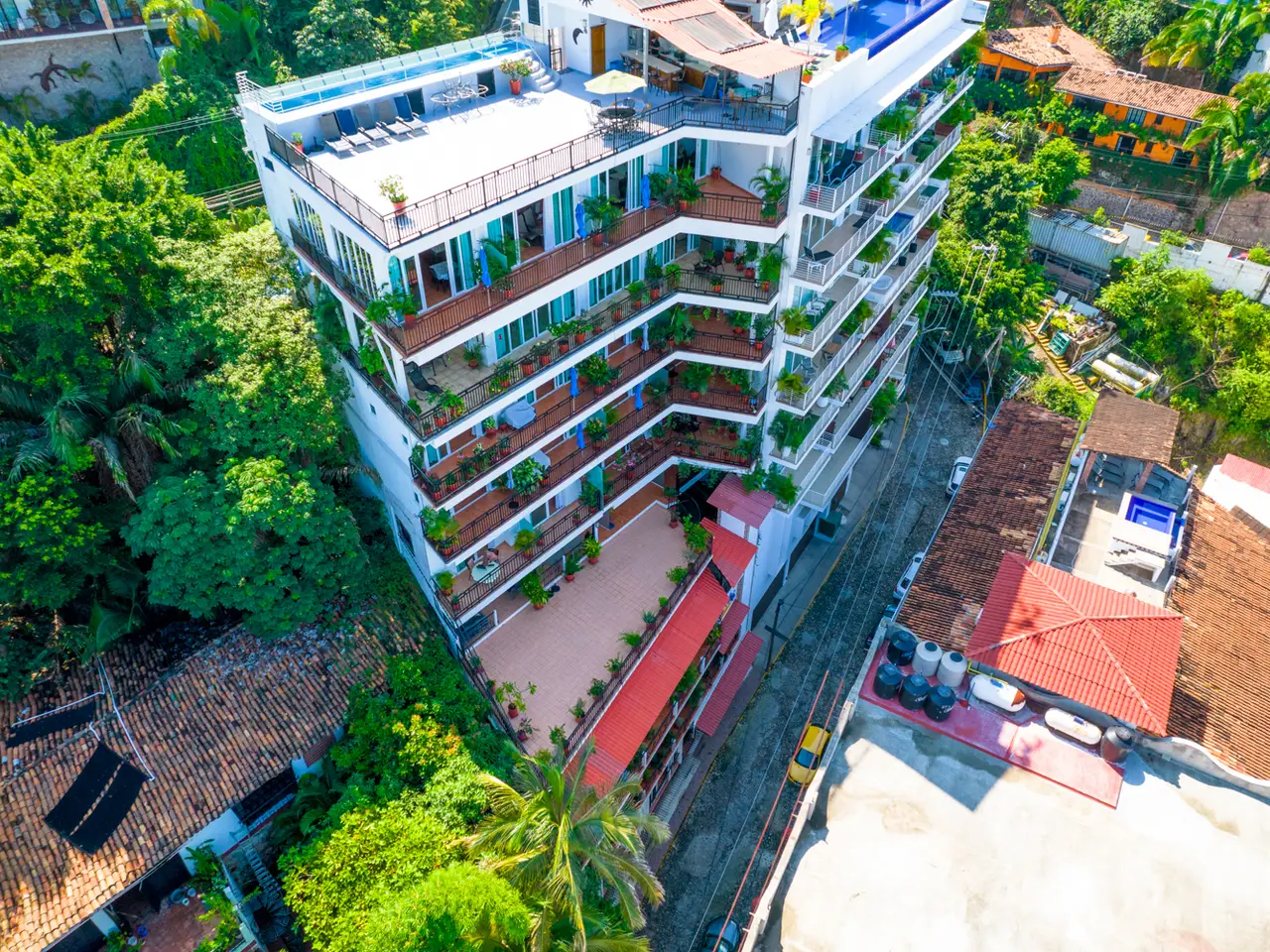 Villa Olivia is an investor’s dream on the Southside of the Romantic Zone ready to be turned into a boutique hotel, B&B; corporate retreat or a family building with income suites. It comprises 22 large studios, 2-2 bedroom apartments; a large 2 bedroom Penthouse; rooftop terrace with pool, bar area and covered sitting spaces; large kitchen breakfast/dining area; reading lounge; professional laundry; gym; sauna and additional sundeck terrace. Gated upper parking. A block away from Playa Los Muertos and Blue Chairs.