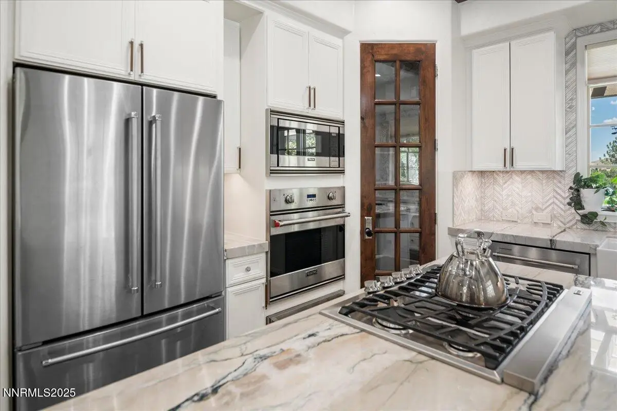 Stunning Renovation in The Cottages at Montreux! Nearly every inch has been exquisitely transformed with a fresh, contemporary aesthetic. The soaring ceilings, immense natural sunlight, and a fresh open layout beckon comfortable and sophisticated living. This exceptional residence is the true the definition of "turn-key" - it comes fully-furnished and the Cottage HOA provides all exterior and landscaping maintenance. Stay awhile, or come and go as you please! The generous floor plan features an open and connected Living/Family Room, Dining Area w/ Wet Bar, Kitchen, Pantry, Office (which could be converted to a 4th Bedroom), Full Bath, and Laundry on the main floor. Upstairs, the expansive Master Suite offers a private sitting area and balcony, while two additional Bedrooms (one currently designed as a Home Theater/Media Room) and a Full Bath complete the upper level. The Gourmet Kitchen features quartzite slab countertops, and top-of-the-line Viking and KitchenAid appliances. The Wet Bar is fully equipped with a Uline beverage refrigerator and EdgeStar ice maker. Located within the exclusive 24-hour guard-gated golf community of Montreux, The Cottages are renowned for their excellent construction quality, with R-50+ ARXX insulated concrete form walls, abundant stonework, copper gutters, and extensive paver driveways and patios. This Cottage at 6360 Wetzel also includes a water softener and an oversized 2-car garage. Conveniently situated just a short stroll (or golf cart ride!) from the heart of Montreux's world-class Clubhouse amenities, this home allows you to indulge in a variety of activities at your leisure. Just 15 minutes from Mt. Rose Ski Resort, 20 minutes to Reno-Tahoe International Airport, and a scenic 30-minute drive to the stunning shores of Lake Tahoe.