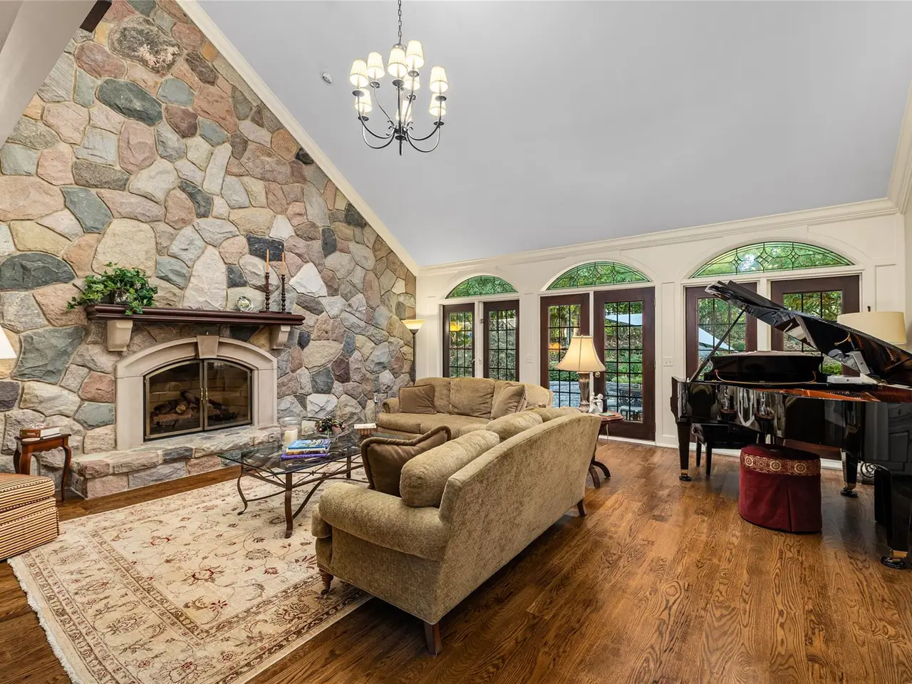 Vaulted ceiling with fieldstone fireplace