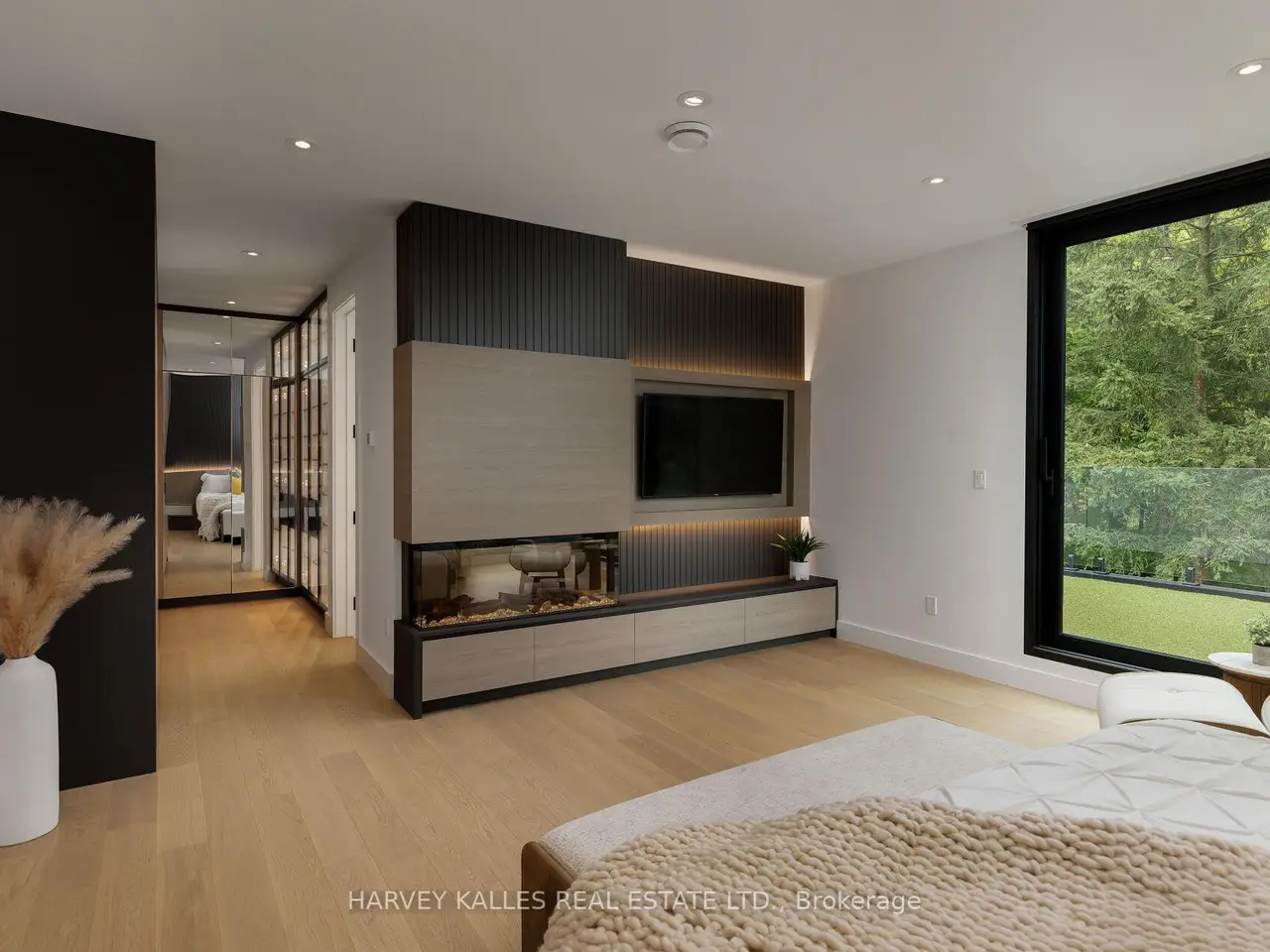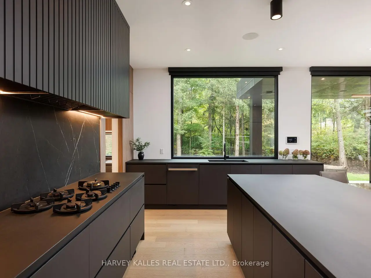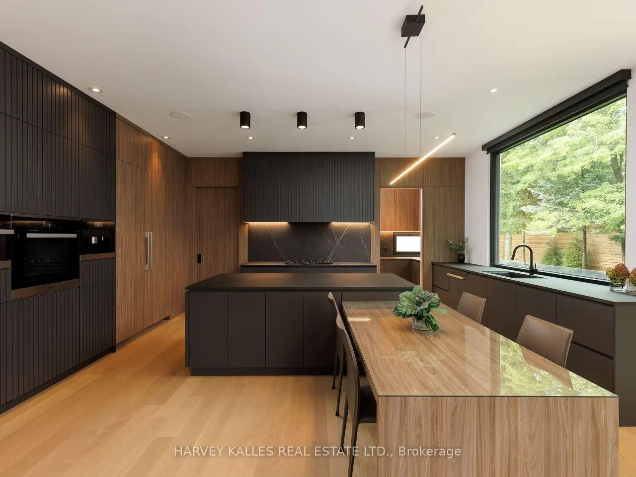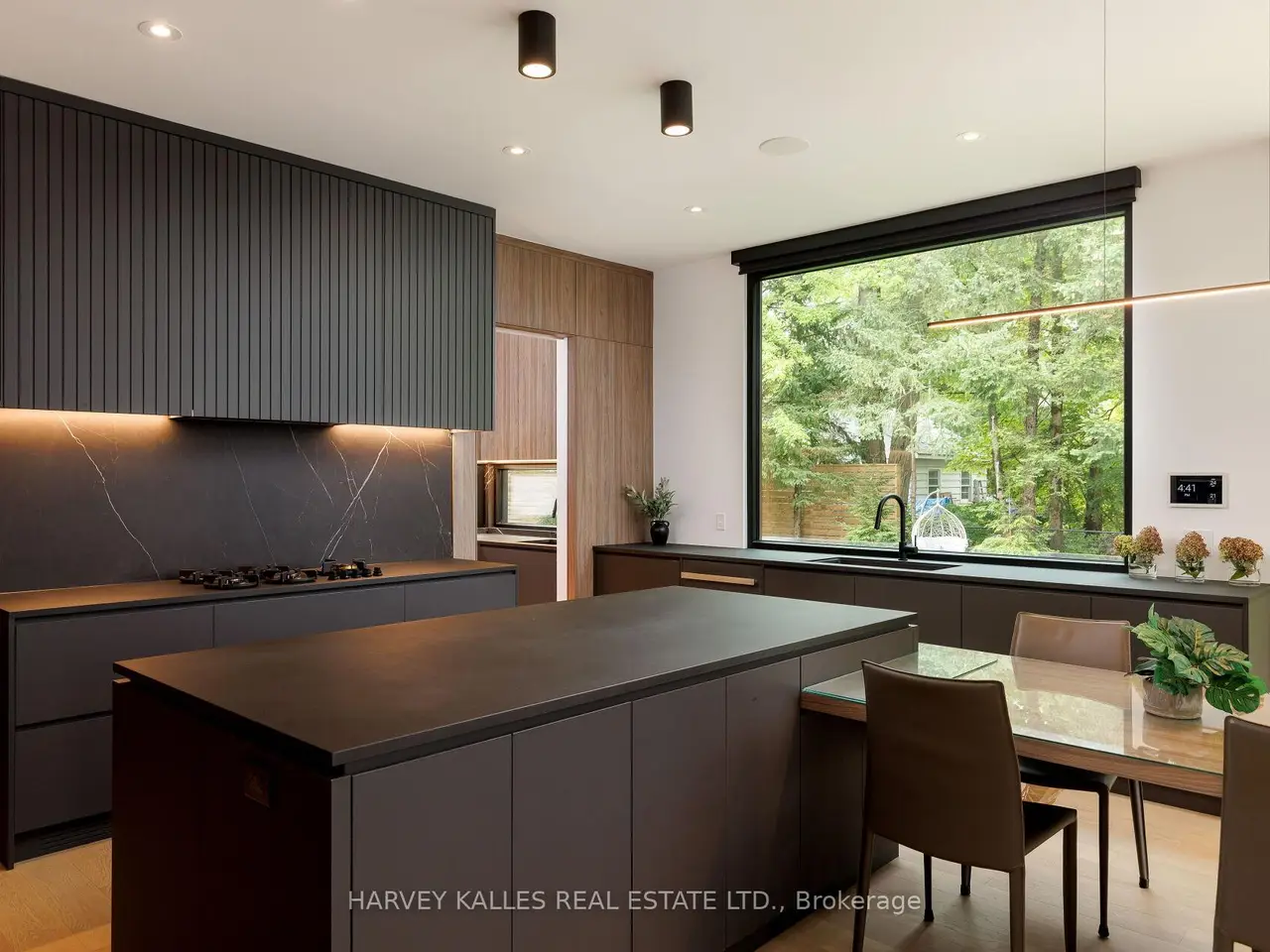 Exceptional custom residence with a masterful fusion of contemporary design with serene Zen influences. 6600+ sq. ft. of finished living space, carefully crafted over four years. Dramatic 20-foot foyer with its illuminated glass pivot door, with expansive light-filled spaces highlighted by a floating staircase, architectural feature panel walls, and warm custom millwork. On the main level, a modern family room with a striking two-sided linear fireplace provides both comfort and sophistication, while the bespoke executive office offers custom millwork and gorgeous treetop views. The chef's kitchen is a true showpiece, featuring Miele appliances, a PITT gas counter range, and a separate catering kitchen. A stylish powder room, skylights, heated floors, and refined cabinetry complete the main level. The primary suite is your private retreat with a spa-inspired ensuite, custom walnut and glass walk-in closets, and a cozy lounge complete with 3-sided fireplace ambiance. Additional bedrooms feature en-suite baths and built-in cabinetry, with a flexible fourth bedroom suite that provides versatility. Your laundry room with full custom millwork completes the upper level. The lower level is an entertainment and wellness oasis: 15-seat soundproof theatre, glass-walled temperature-controlled wine cantina, open-concept gym, and a sleek wet bar create the ultimate space for relaxation and hosting. A nanny or guest suite with a spa-like ensuite and direct walkout to the landscaped grounds ensures comfort and privacy for extended stays. The exterior showcases modern brick and aluminum cladding, beautifully landscaped grounds with irrigation, and sleek architectural lighting. Technology is seamlessly integrated with a Control4 smart home automation system, delivering comfort, convenience, and efficiency at your fingertips. This is more than a home, it is a contemporary Zen oasis, where design, technology, and tranquility converge to create a sanctuary for modern living.