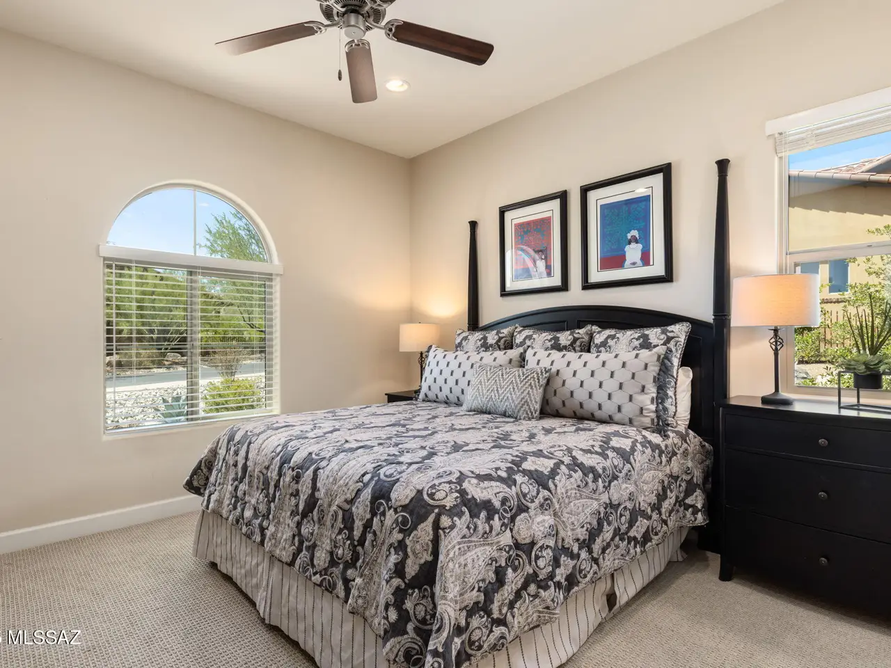 Fabulous 1,942 SF (3BD, 3BA) golf casita with Catalina Mtn views and lovely fully fenced yard in The Stone Canyon Club one of the USA's most desirable residential golf communities! Available mostly furnished, this delightful villa is highly upgraded and customized. Open great room design also enjoys a large covered patio that can be fully enclosed with auto rolling shades for cooler summer and warmer winter enjoyment. Beautifully landscaped and snake proofed yard includes gas firepit, artificial turf area, lovely landscaping and extensive paver patio areas. You'll appreciate the close location to the Clubhouse (marvelous restaurant) and Fitness Center (2 pools, spa, pickle ball & tennis courts, plus great exercise equipment). Ideal winter home with championship golf! Golf Membership Req'd