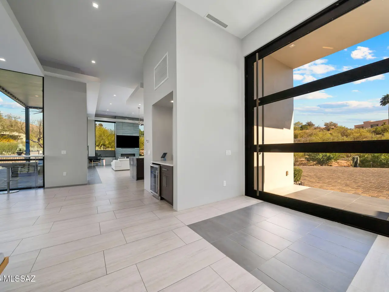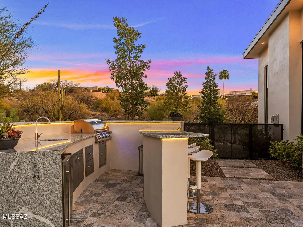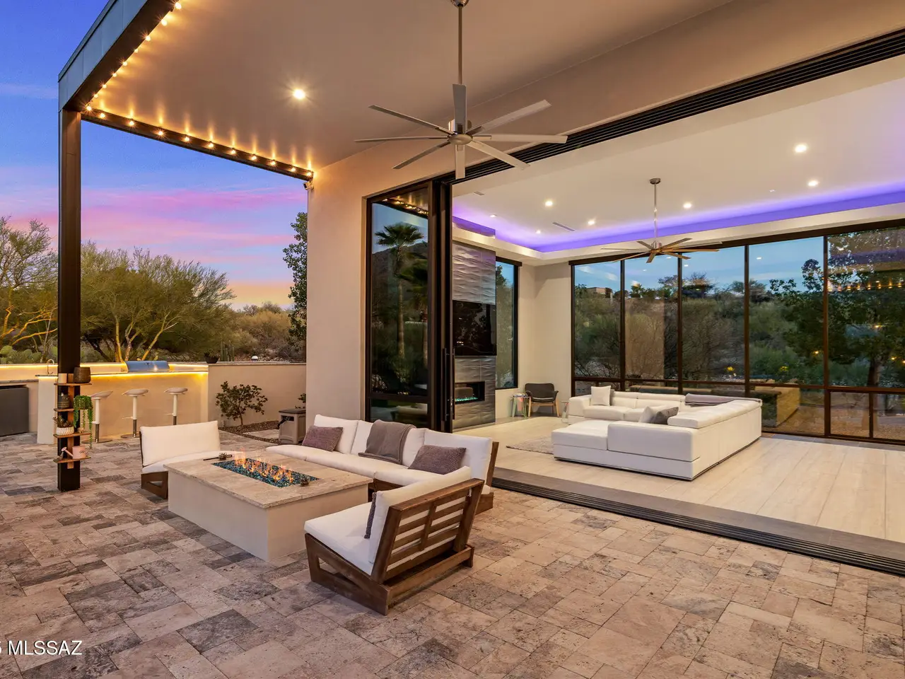 Experience the perfect blend of modern luxury and seamless indoor-outdoor living in this stunning TF Robertson-designed home, situated on 1.17 acres within the prestigious, 24-hour guard-gated Skyline Country Club Estates. Designed to impress, this 3,228 sq. ft. contemporary masterpiece offers four en-suite bedrooms, each featuring tray ceilings and custom lighting. From the moment guests arrive, they'll be captivated by the grand 12 ft-high, 9 ft-wide front door, offering a breathtaking view that extends through to the majestic Catalina Mountains beyond. Exceptional Design for Entertaining - the great room is an entertainer's dream, boasting soaring ceilings and a 12-ft multi-slide glass door that opens to an expansive patio. Here, you'll find a fire table, outdoor kitchen, and a heated pool and spa (built in 2023) with a self-cleaning system, all set against a panoramic Catalina mountain backdrop. A minimalist fence encloses the patio, ensuring unobstructed views while maintaining privacy. Serene Owner's Retreat - wake up to stunning mountain views from the spacious primary suite, which features a walk-in closet with built-ins and direct access to the patio for effortless indoor-outdoor relaxation. Sustainable Luxury & Smart Features - equipped with a 12.75 kW Tesla Solar System and three Powerwall battery backups (40 kW total), this home embraces energy efficiency. The oversized three-car garage includes a Tesla charger, while a whole-house water filtration system ensures optimal water quality. The smart home system connects indoor/outdoor accent lighting, motorized shades, and pool/spa features. Resort-Style Community Amenities - Skyline Country Club Estates offers exclusive access to golf, lighted tennis and pickleball courts, a swimming pool, spa, and a state-of-the-art fitness center (membership required for certain amenities, inquire for more details). Don't miss the opportunity to own this exceptional modern home with unparalleled views and luxury living.