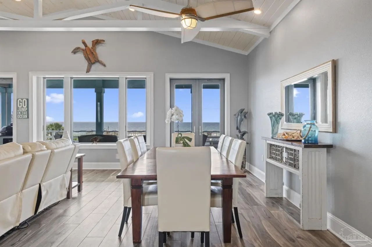 This luxury beach retreat offers breathtaking Gulf views from nearly every room. Located on the top floor, the main living area features soaring tongue-and-groove ceilings, wood-look tile flooring, and expansive windows that flood the space with natural light and frame stunning water vistas. Modern coastal finishes create a clean, sophisticated aesthetic. The chef's kitchen includes custom cabinetry, mosaic tile backsplash, granite countertops, dual dishwashers, and bar seating with a view. The spacious living room-anchored by a fireplace with granite tile surround-flows onto a covered deck, perfect for alfresco dining or unwinding after a day at the beach. Outdoor spaces include generous balconies that invite relaxation to the sound of the waves, a rooftop deck with panoramic island views, and a hot tub just off the game room deck. The expansive primary suite offers balcony access, a large walk-in closet, and a luxurious en suite bath with double vanities, granite countertops, a Thermasol steam shower, and its own washer/dryer. Four additional en suite bedrooms on the second level provide private, light-filled retreats. A custom bunk area, kitchenette, and two more laundry stations add comfort and flexibility. Constructed with concrete pilings, ICF concrete walls, and ICF concrete floors on the second level, this home offers exceptional strength and energy efficiency. All windows are impact-rated Anderson. The home also features geothermal HVAC, an elevator to all levels, two attics for storage, and garages that accommodate up to five vehicles. A lock-out door can be added at the bottom of the stairs-framed and ready-offering potential for rental income or multigenerational living. At sand level, enjoy a fire pit, grilling area, and a gunite pool with tanning ledge and waterfall. Whether a primary residence, second home, or rental, this property is thoughtfully designed for an exceptional coastal lifestyle.