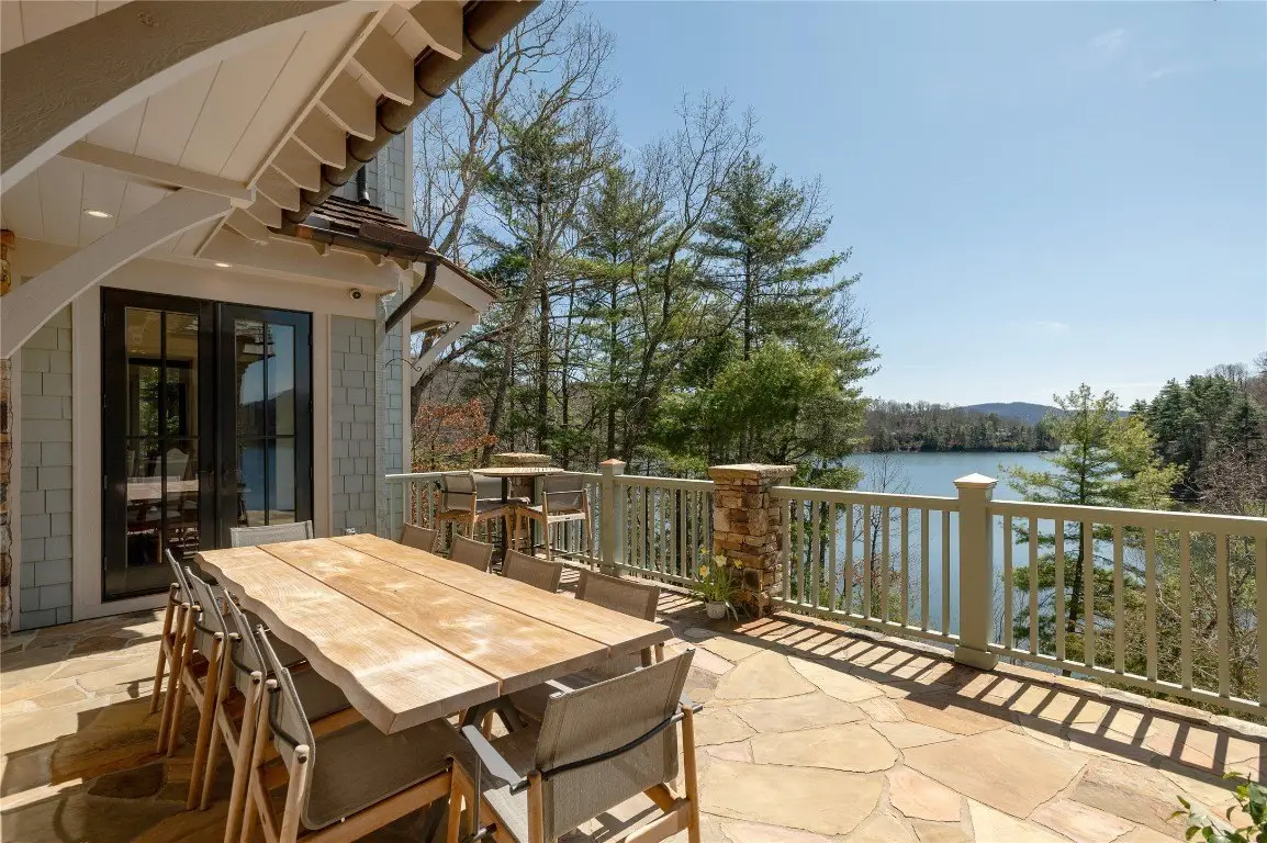 Experience an architectural masterpiece by Tim Greene with this exceptional property on Lake Glenville. Situated on a premier lot with breathtaking panoramic lake views, this home offers an unparalleled combination of thoughtful design, superior craftsmanship, and effortless living. From its 18-inch foundation walls to the massive beams and beautifully crafted stacked stone, both inside and outside, the residence is as enduring as it is stunning. Shiplap walls, wood ceilings, and hardwood floors throughout most of the home add timeless character. The open floor plan is designed for both daily living and entertaining. Expansive windows showcasing the lake bring sunlight into the spacious living, dining, and kitchen areas. The main-level primary suite features serene views and a beautifully appointed bathroom, while upstairs there are three private ensuite guest bedrooms, creating a welcoming haven for friends and family, plus abundant storage throughout the property. The outdoor areas are thoughtfully designed with expansive stone patios, green spaces, and a custom fire pit that invites gatherings and relaxation, while multiple screened porches— including one with a wood-burning fireplace — offer panoramic views and cozy nooks for quiet moments. The private dock provides easy access to activities on Lake Glenville. Start the day with coffee while enjoying long-range southerly views, watch waterfowl gliding across the lake, or paddleboard to a nearby waterfall. Cruise across the water to visit a bald eagle nest, or host guests for July 4th fireworks over the lake, creating unforgettable memories. Located in the gated enclave of Stone Pointe with just eight exclusive lakefront lots, this property delivers both privacy and a welcoming sense of community. Meticulously cared for and updated by the current owners, the move-in ready home offers a perfect space for lakeside living.
