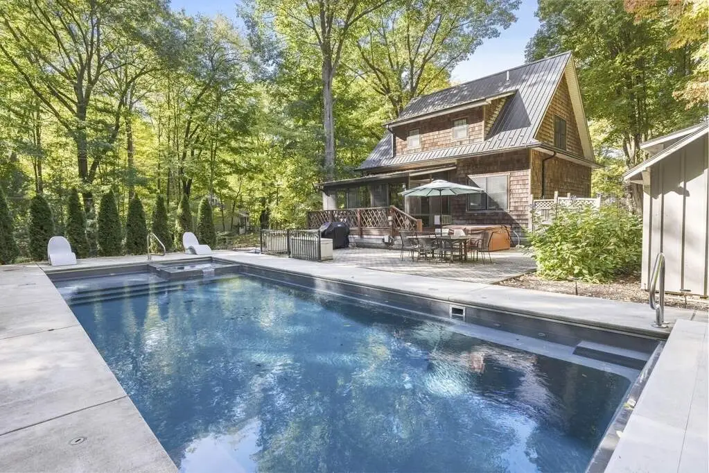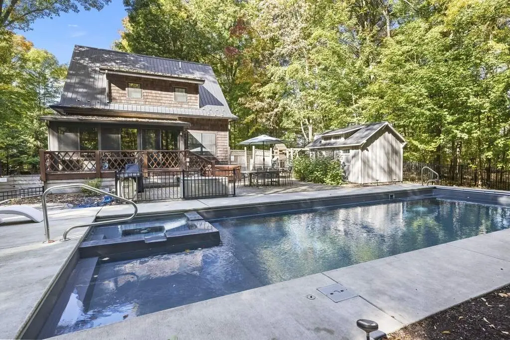 Steps to Cherry Beach, this Harbert retreat with private resort-style pool, spa, and the timeless rhythm of Harbor Country living, offers four bedrooms, four full baths, and warm, light-filled gathering spaces that capture the essence of lake living. The main level welcomes you with a gracious living room centered on a classic fireplace, leading to a beautifully proportioned kitchen designed for both cooking and connection. The gorgeous fenced yard with hot tub and built-in pool and spa provides a welcome oasis for those that prefer to cool off or lounge in the sun at home. With a current short-term rental license, this home has become a sought-after retreat for guests drawn to the charm of Cherry Beach-renowned for its wide, sandy shoreline and timeless beauty. Don't miss the opportunity to call this sought-after short-term rental and timeless personal getaway your private haven near Lake Michigan.