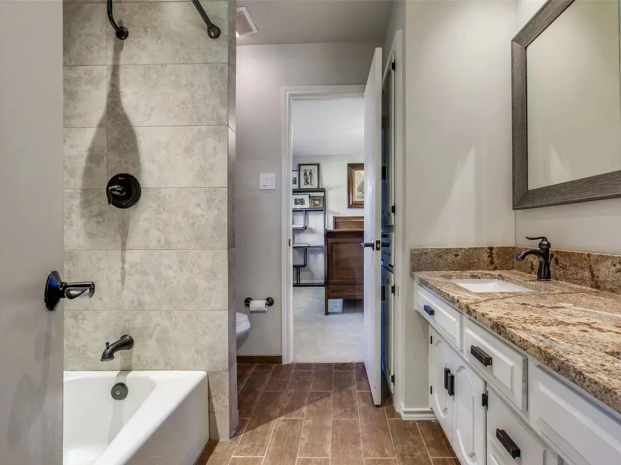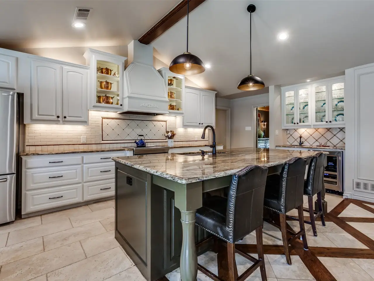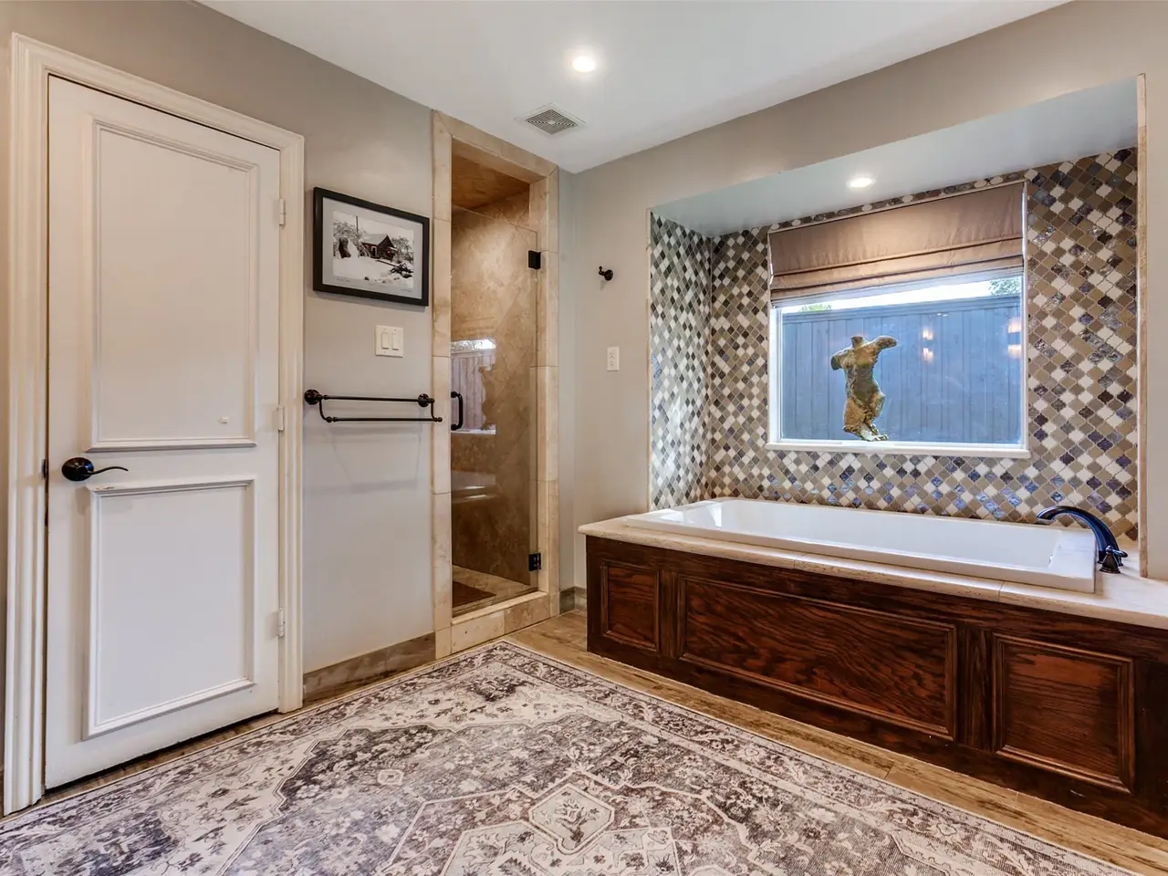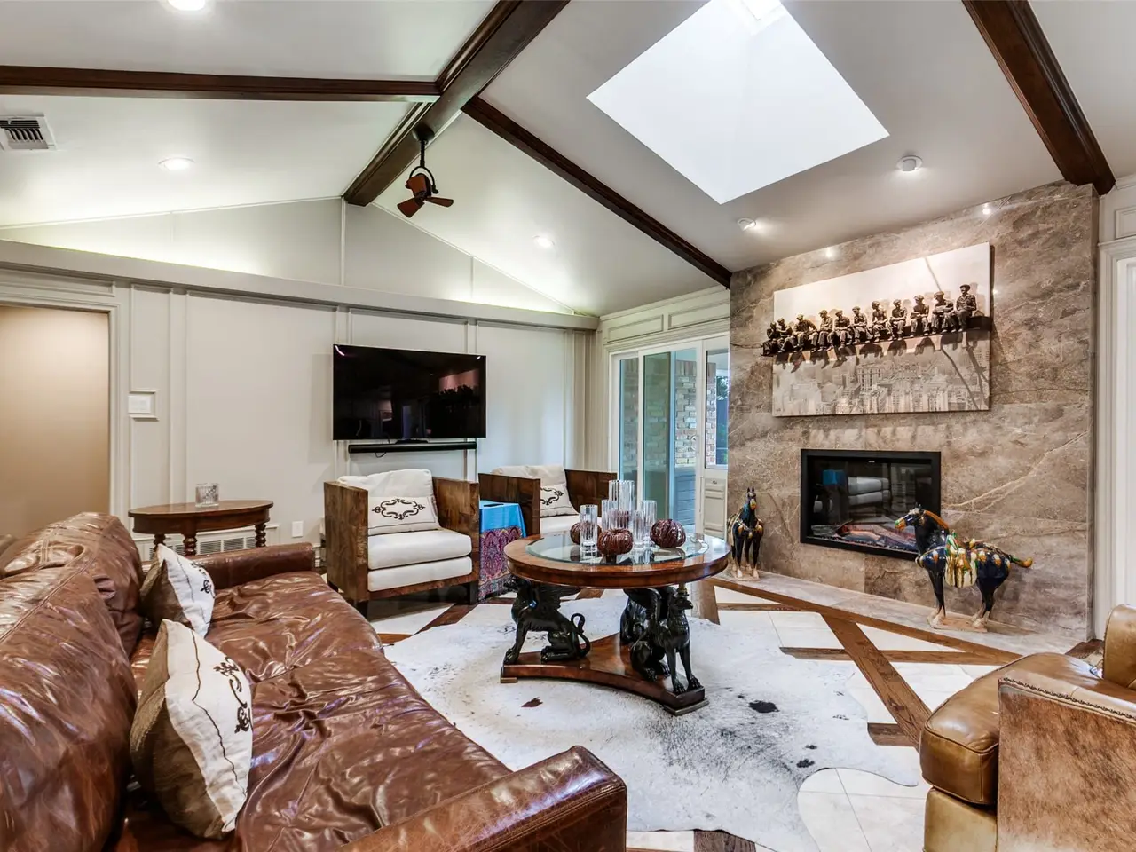 Wonderfully updated, elegant, traditional home with huge rooms on a large, private, corner lot, on its own little island! Cast iron plumbing has been replaced! Spacious living room is open to kitchen, with a fireplace, skylight, vaulted ceiling & 2 glass double doors leading to the back yard. Kitchen has a large island, granite countertops, wet bar, tons of storage & a breakfast room overlooking the pool. The primary bedroom has a raised ceiling, wood flooring, access to the back yard & ensuite bath, with separate shower & jetted tub. Second and third bedrooms have a Jack & Jill bath. Fourth bedroom is split & could be a game room or in-law suite with its own entry & full bath. Large utility room with sink, built-in cabinets & room for freezer. Back yard has a patio, grass, built-in grill & pool with waterfall & fire features. The garage is oversized & ample room for parking on private drive or circle drive. Recent updates & upgrades include: Kitchen, den, pantry remodel (2025), French Drain installed (2024), Art Studio built (2024), Fence perimeter & pool gate installed, including electric security gate, driveway replaced (2024), Artificial grass installed in back yard (2024), Lifetime doors & front windows replaced (lifetime guarantee) (2023), Replacement of soffit & fascia for entire house (2023), Water heater replaced (2020), Carpet in 3 secondary bedrooms replaced (2020), Water shutoff & sprinkler underground control replaced (2020), Critter Control: removal & installation of attic insulation, critter retardant, repairs to HVAC systems, electric temperature controlled attic turbines (2020). Complete update list available upon request. Located in the Private School Corridor, ON the Northaven Trail, walking distance to the Town North YMCA and Northaven Park offering a playground, tennis courts & baseball field! Significant Tax Break allowed due to location!