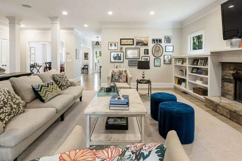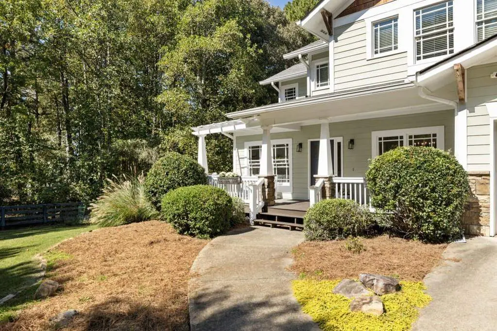 • Craftsman-style architecture with wide front porch and stone fireplace