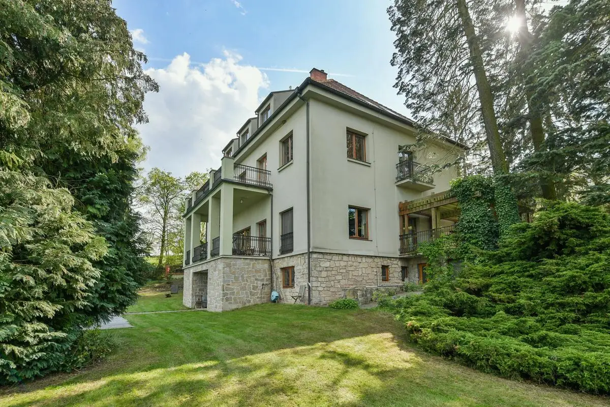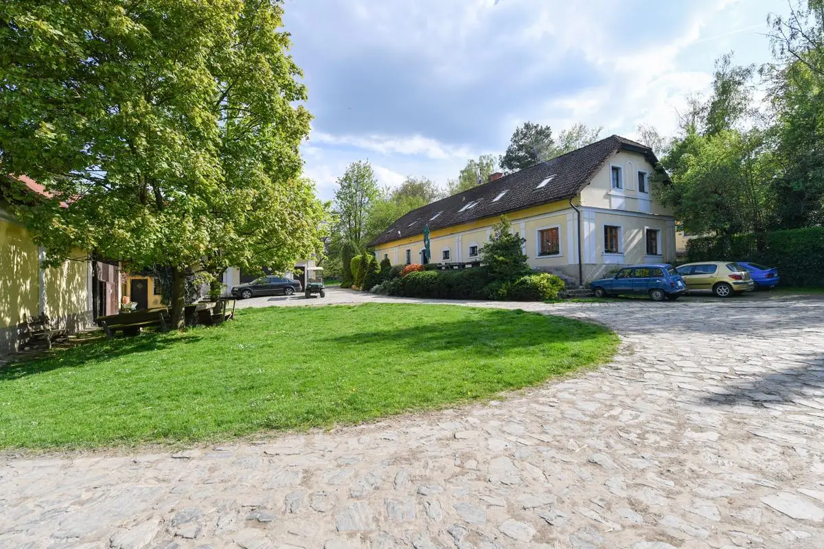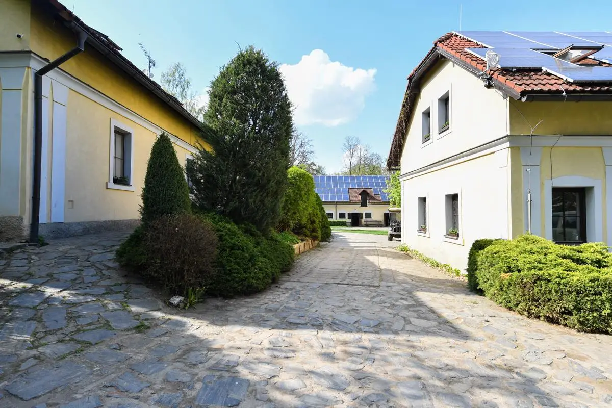 Unique homestead 50 km from Prague consisting of a villa with a garden, a farm complex, a sports hall and land (meadows, pastures and forest) for sale. The total area is approximately 65 hectares and is located in the Benešov district. The total area of ??the lockable area is 30,000 sq.m.. The total amount of land, of which most pastures is about 65 hectares. Golf lovers will enjoy using the nearby Panorama Golf Resort and the Ceský Šternberk Castle or the surroundings of the Sázava River. The sale price includes: Villa with a garden and swimming pool, which was built as a summer residence in1938 by the head of the law firm of President Masaryk. Impressive villa offers four floors with a total usable area of ??720 sq.m.. It is located in a quiet park garden with an area of ??10,000 square meters. All floors are connected by a staircase and a personal elevator. The 1st floor offers a basement, technical and sports facilities, laundry, sauna, gym and two showers with toilet. The ground floor has an entrance hall, hallway, toilet with washroom, living room and kitchen with access to the terrace. On the 1st floor of the villa we find two bedrooms with access to the terrace, dressing room, study, two bathrooms and three toilets. The second floor offers two bedrooms and two bathrooms with toilets. There is also an attic gallery. The villa has two balconies and three terraces, of which the main east terrace offers breathtaking views of the surrounding countryside, garden and pool. The farm area consists of stables, a shepherd’s house, accommodation house and a guest house with garages. Accommodation capacity 20-30 people. The total area of ??this set of buildings and landscape is 20,000 square meters. It includes: • Shepherd’s house with two floors is used as a guest house and has a total usable area of ??294 square meters. On the ground floor there is an apartment for administrators, a multifunctional room for public events, a bathroom with washroom and two toilets. In the underground part there is a wine cellar. On the 1st floor is a residential attic with three bathrooms. • Guest house with a total area of ??154 square meters and two floors serves as additional accommodation for guests. There are two separate apartments with a kitchen with two bathrooms. Heating: wood boiler. • Accommodation house with a total usable area of ??210 square meters serves as accommodation for staff working in the area. The ground floor has a kitchen, bedroom, and bathroom. On the first floor is a habitable attic. Heating: central connected to the wood boiler of the Safar House. • The barn with a total area of ??384 square meters serves as a parking space for agricultural machinery and the land as a hay warehouse for horses. • Stable for horses has six boxes 3 x 4 meters for stables of six horses. Outside this building, there are another six built boxes outside. Behind the back of the barn is also a free stable for horses, which allows stables of about 15 horses in the wild. From here, the horses have a paddock on the spacious pastures. • Sports hall with a total area of ??1,200 square meters.