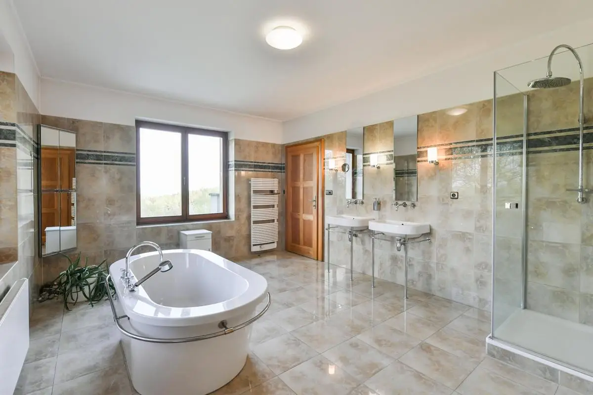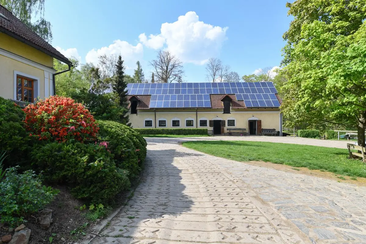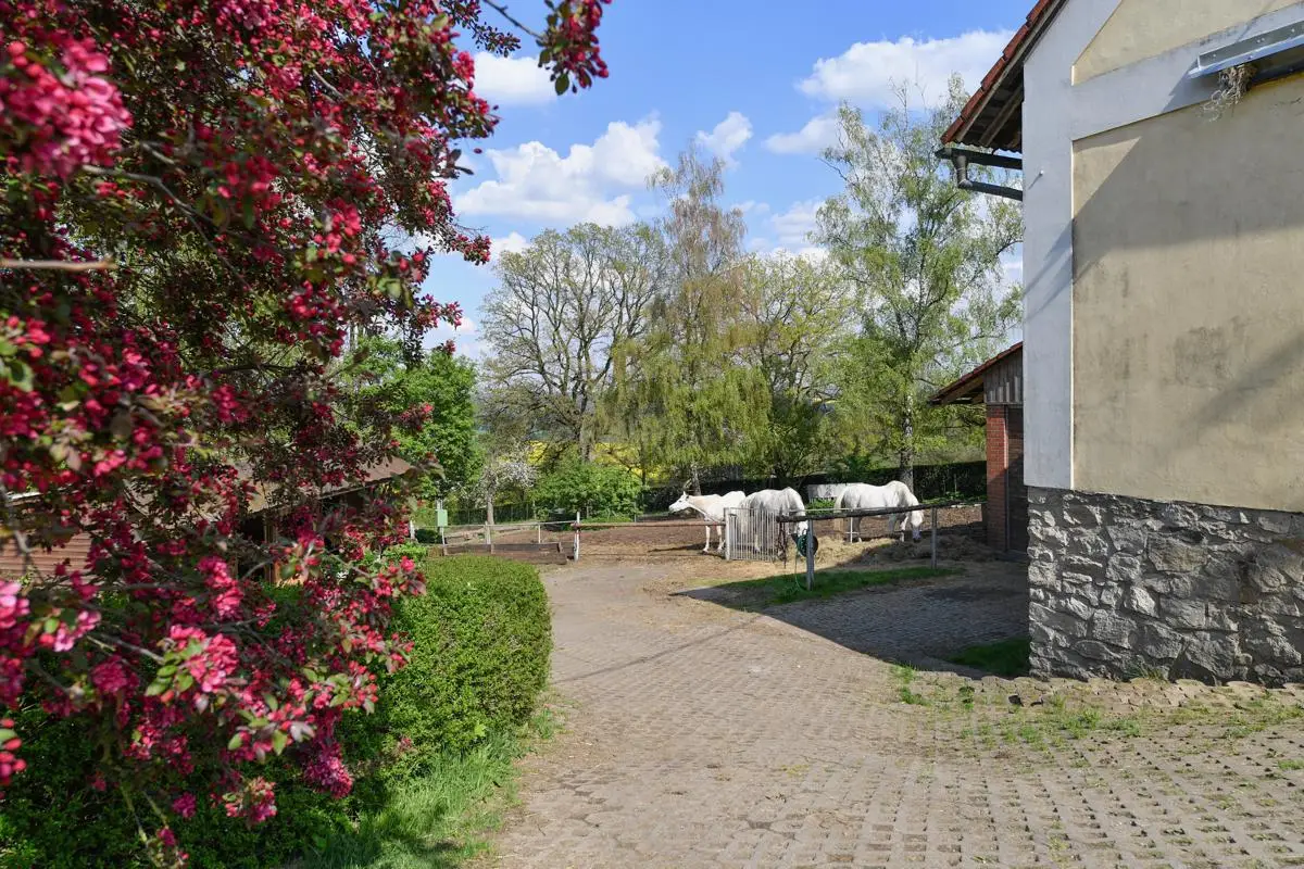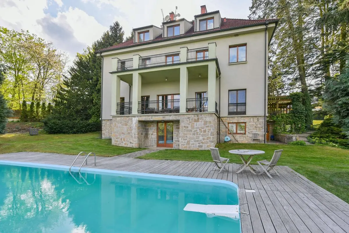 Unique homestead 50 km from Prague consisting of a villa with a garden, a farm complex, a sports hall and land (meadows, pastures and forest) for sale. The total area is approximately 65 hectares and is located in the Benešov district. The total area of ??the lockable area is 30,000 sq.m.. The total amount of land, of which most pastures is about 65 hectares. Golf lovers will enjoy using the nearby Panorama Golf Resort and the Ceský Šternberk Castle or the surroundings of the Sázava River. The sale price includes: Villa with a garden and swimming pool, which was built as a summer residence in1938 by the head of the law firm of President Masaryk. Impressive villa offers four floors with a total usable area of ??720 sq.m.. It is located in a quiet park garden with an area of ??10,000 square meters. All floors are connected by a staircase and a personal elevator. The 1st floor offers a basement, technical and sports facilities, laundry, sauna, gym and two showers with toilet. The ground floor has an entrance hall, hallway, toilet with washroom, living room and kitchen with access to the terrace. On the 1st floor of the villa we find two bedrooms with access to the terrace, dressing room, study, two bathrooms and three toilets. The second floor offers two bedrooms and two bathrooms with toilets. There is also an attic gallery. The villa has two balconies and three terraces, of which the main east terrace offers breathtaking views of the surrounding countryside, garden and pool. The farm area consists of stables, a shepherd’s house, accommodation house and a guest house with garages. Accommodation capacity 20-30 people. The total area of ??this set of buildings and landscape is 20,000 square meters. It includes: • Shepherd’s house with two floors is used as a guest house and has a total usable area of ??294 square meters. On the ground floor there is an apartment for administrators, a multifunctional room for public events, a bathroom with washroom and two toilets. In the underground part there is a wine cellar. On the 1st floor is a residential attic with three bathrooms. • Guest house with a total area of ??154 square meters and two floors serves as additional accommodation for guests. There are two separate apartments with a kitchen with two bathrooms. Heating: wood boiler. • Accommodation house with a total usable area of ??210 square meters serves as accommodation for staff working in the area. The ground floor has a kitchen, bedroom, and bathroom. On the first floor is a habitable attic. Heating: central connected to the wood boiler of the Safar House. • The barn with a total area of ??384 square meters serves as a parking space for agricultural machinery and the land as a hay warehouse for horses. • Stable for horses has six boxes 3 x 4 meters for stables of six horses. Outside this building, there are another six built boxes outside. Behind the back of the barn is also a free stable for horses, which allows stables of about 15 horses in the wild. From here, the horses have a paddock on the spacious pastures. • Sports hall with a total area of ??1,200 square meters.