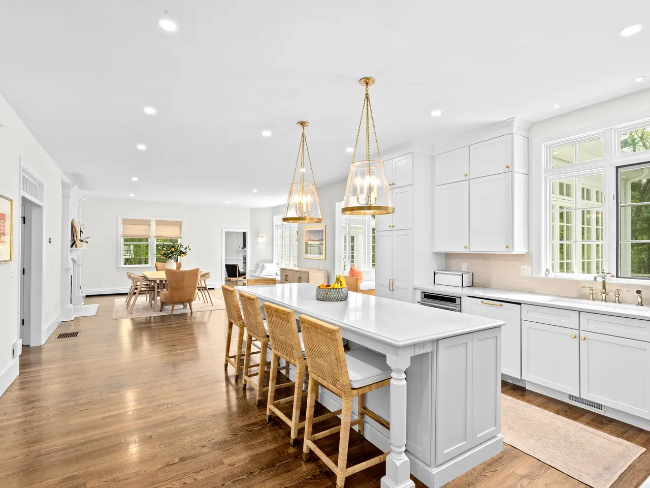 Just moments from downtown Hingham and the library, this exceptional residence is privately sited on a beautifully landscaped lot abutting Wompatuck State Park and Triphammer Pond. A sunlit kitchen with an oversized island flows effortlessly into the dining area and fireplaced family room. The vaulted primary suite, accessed by a private staircase, features walk-in closets and a luxurious bath. Each additional bedroom enjoys en-suite or direct bath access. The third-floor loft with wet bar captures stunning views over the gardens. Outdoors, a heated pool and expansive stone patio provide a resort-like setting in one of Hingham’s most coveted locations.