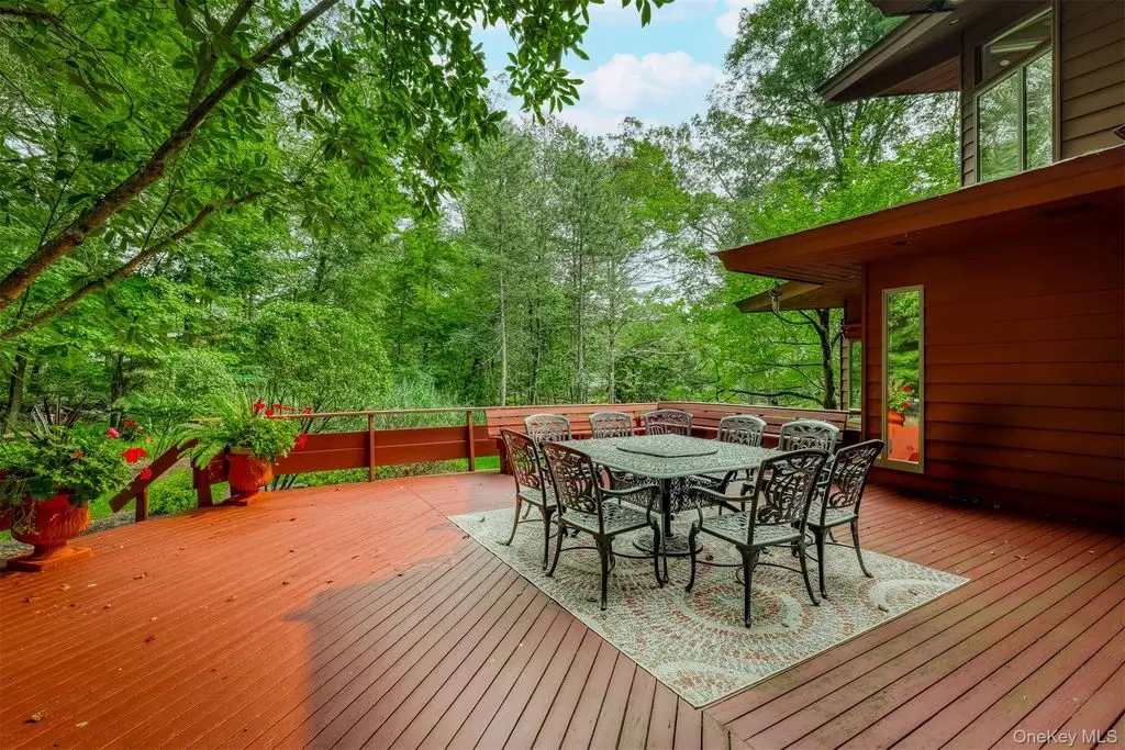 Stunning Mid-Century Modern Masterpiece Inspired by the iconic style of Frank Lloyd Wright, this home showcases timeless horizontal lines, an open floor plan, and seamless integration with the natural surroundings. Set on 1.84 acres of park-like property with a beautiful pond, this private retreat is located in the heart of New City with easy access to the Palisades Parkway. The dramatic sun-filled entry opens to 5 bedrooms and four baths, including an expansive primary suite with gas fireplace, spa-like bath with steam shower, and Jacuzzi tub. Walls of windows flood the chef's kitchen, breakfast area, and butlers pantry with light, framing serene backyard views. Enjoy multiple fireplacesincluding one in the living room and a wood-burning stove in the basementplus a finished walk-out lower level featuring a home gym, billiard room, bedroom, full bath, cedar closet, storage room and private patio. Outdoor living is elevated with a wraparound deck, circular driveway, whole-house generator, and two-car garage. Come visit and thoroughly enjoy this absolutely gorgeous home!