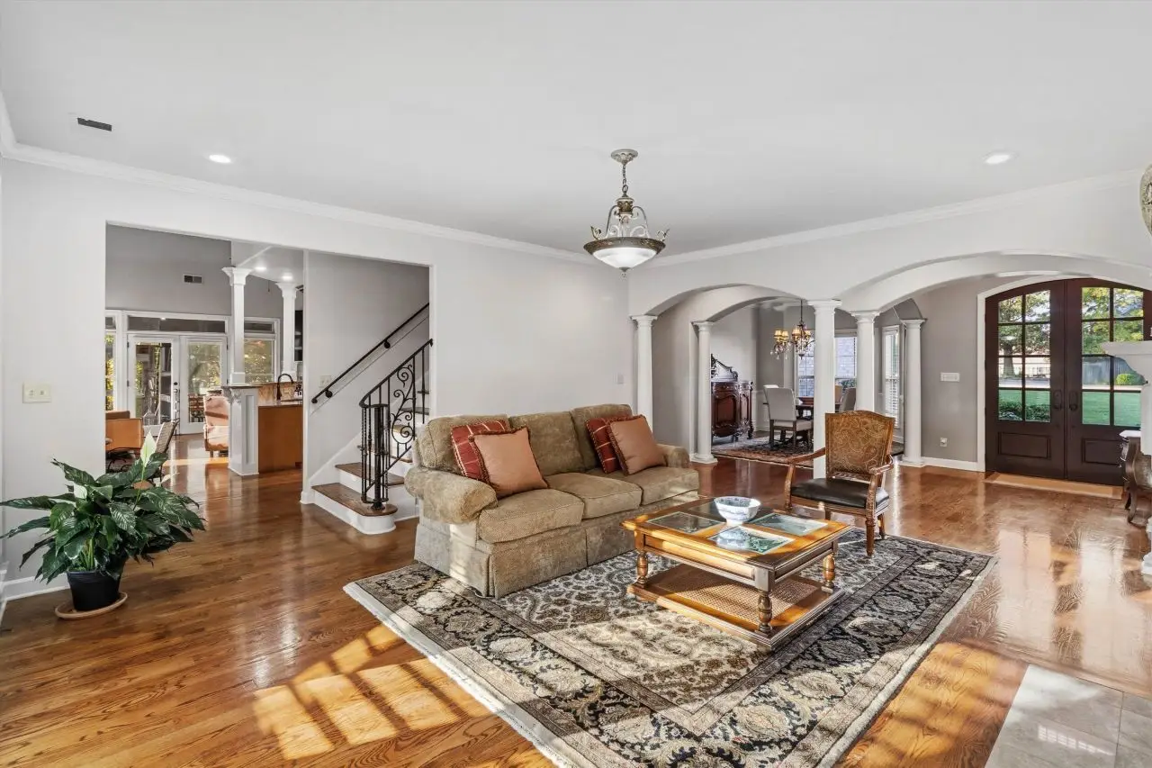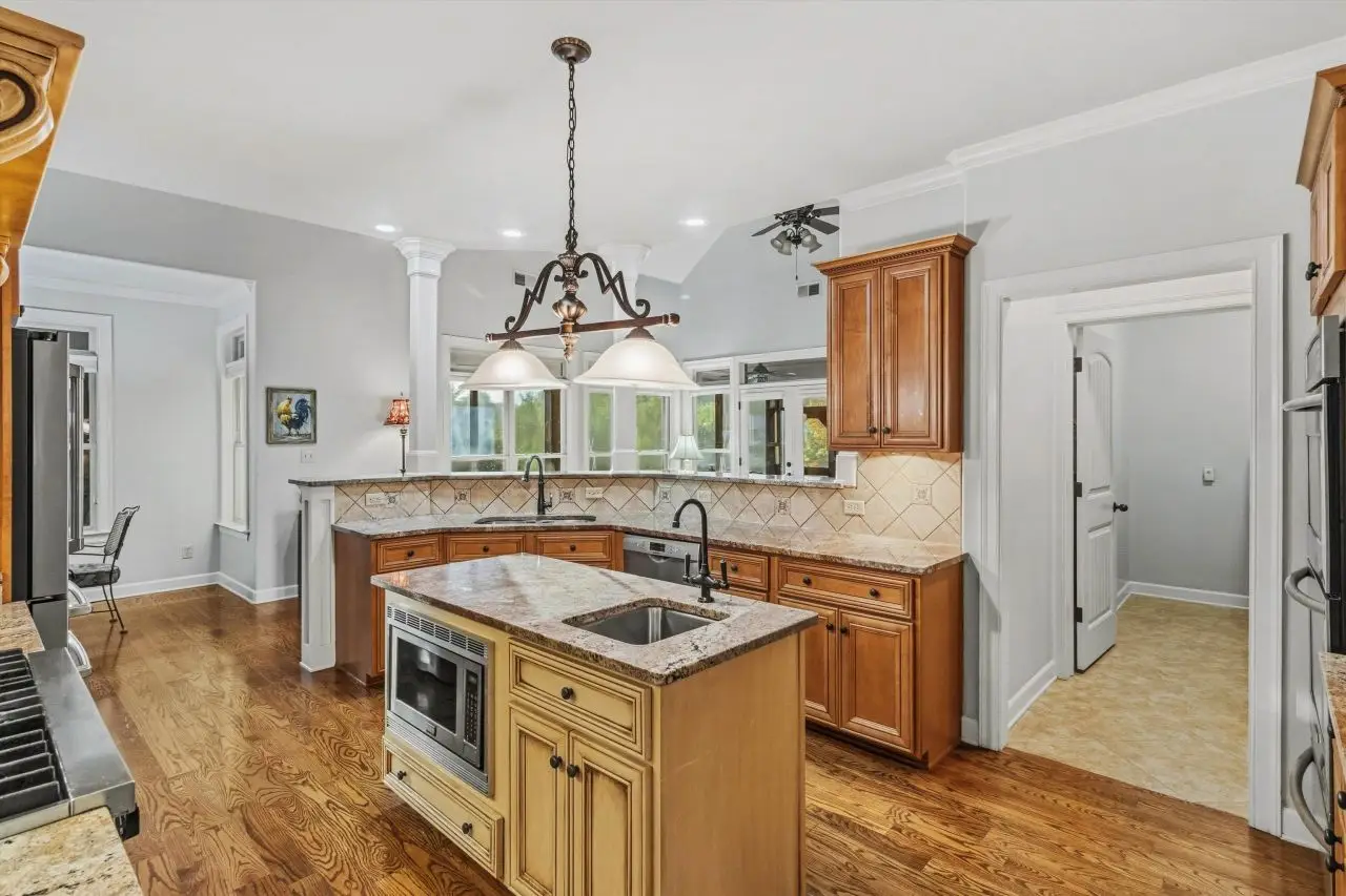 Whoo-Hoo - this is the one! A rare opportunity to live on highly sought-after Garner Lake in a custom-built 4BR, 4BA masterpiece loaded with upgrades and thoughtful design. Step through the impressive front entry into a grand two-story foyer wrapped in elegant wrought iron railing. Gorgeous wide-plank hardwoods flow throughout the first floor. Enjoy two primary suites down, including a luxurious owner's retreat with a spa-inspired bath. The spacious living room features custom cabinetry and one of two fireplaces, opening to a sunroom and wraparound screened porch with breathtaking lake views. The chef's kitchen is a showstopper with commercial-grade gas range, expansive counters, and an open hearth room surrounded by windows. Upstairs offers two oversized bedrooms, a bonus room with wet bar and custom pool table, plus a private office and sitting area. Homes like this don't come along often - see it today before it's gone!