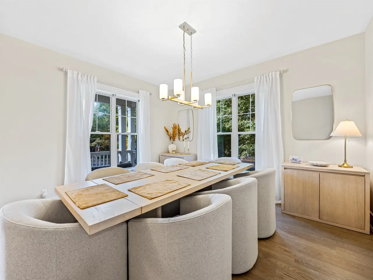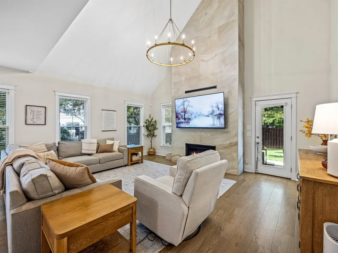 This stunning home was recently remodeled and is nestled in the desirable Heathbrook section of Biltmore Park. This beautifully updated residence boasts a modern yet warm design, featuring an open-concept living area with a cozy fireplace, plush sectional sofa, and elegant chandelier. The gourmet kitchen shines with white cabinetry, a stylish backsplash, stainless steel appliances, and a spacious island perfect for entertaining. The luxurious primary bathroom offers a freestanding soaking tub, dual vanities, and a sleek glass-enclosed shower with gold fixtures. Additional highlights include a well-appointed laundry room, a serene screened porch with outdoor dining, and a charming backyard with a fire pit area. Conveniently located near Biltmore Park's amenities, this home combines comfort, style, and accessibility in one perfect package.