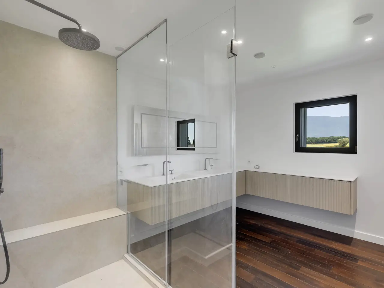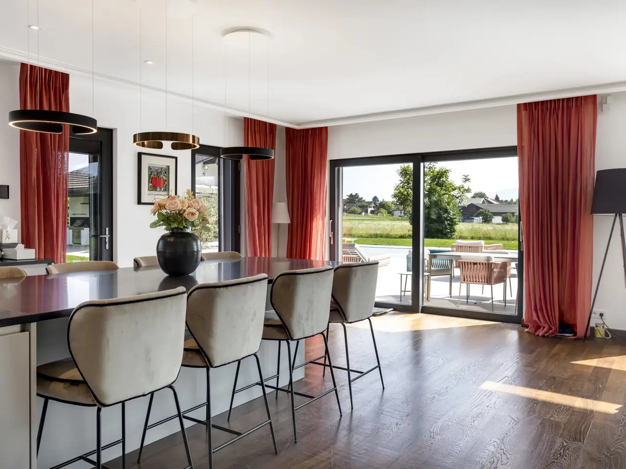 Just a few minutes from customs and 20 minutes from the center of Geneva, discover this sublime contemporary villa with over 400 m² of living space, nestled in a peaceful, verdant setting on a plot of over 3,000 m². This exceptional property features 5 spacious bedrooms, including a magnificent master suite, as well as a large independent studio on the first floor, ideal for accommodating family, guests or staff. Entirely renovated with top-of-the-range materials (Boffi kitchen and bathrooms, Corian washbasins), it combines contemporary design with top-of-the-range amenities. Comfort is ensured by a geothermal heating system and integrated home automation that controls the entire house. Outside, the charm is just as strong, with a superb 12x4 m heated swimming pool and pool house. The perfectly manicured landscaped garden is enhanced by meticulous exterior lighting and an automatic watering system. A finished basement with a wine cellar and two double garages complete this rare property. What we like: - Top-of-the-range features down to the smallest detail; - An ideal location, just a stone's throw from Switzerland; - A harmonious living environment, combining modernity, comfort and nature.