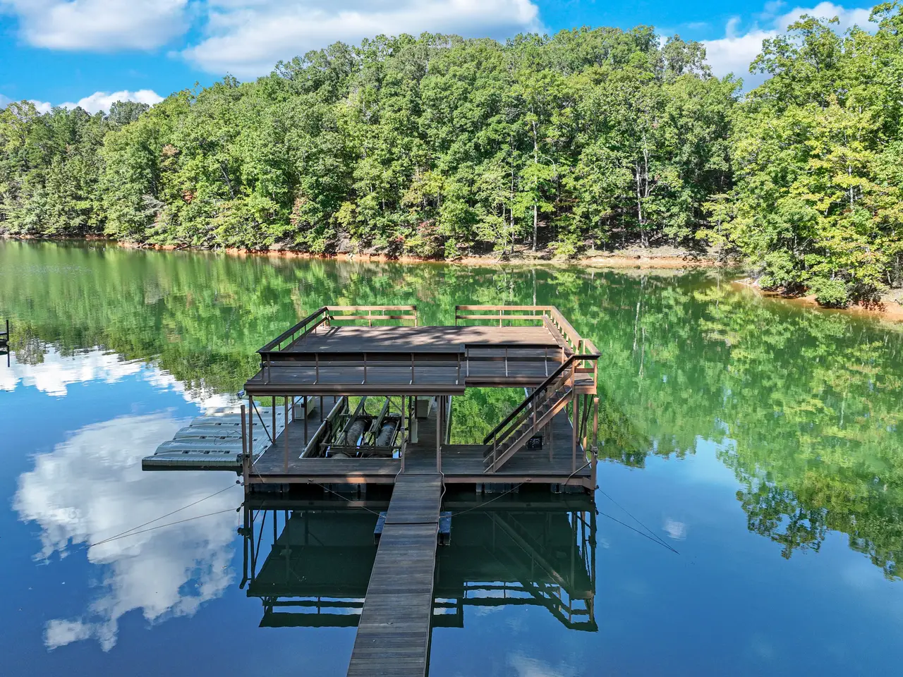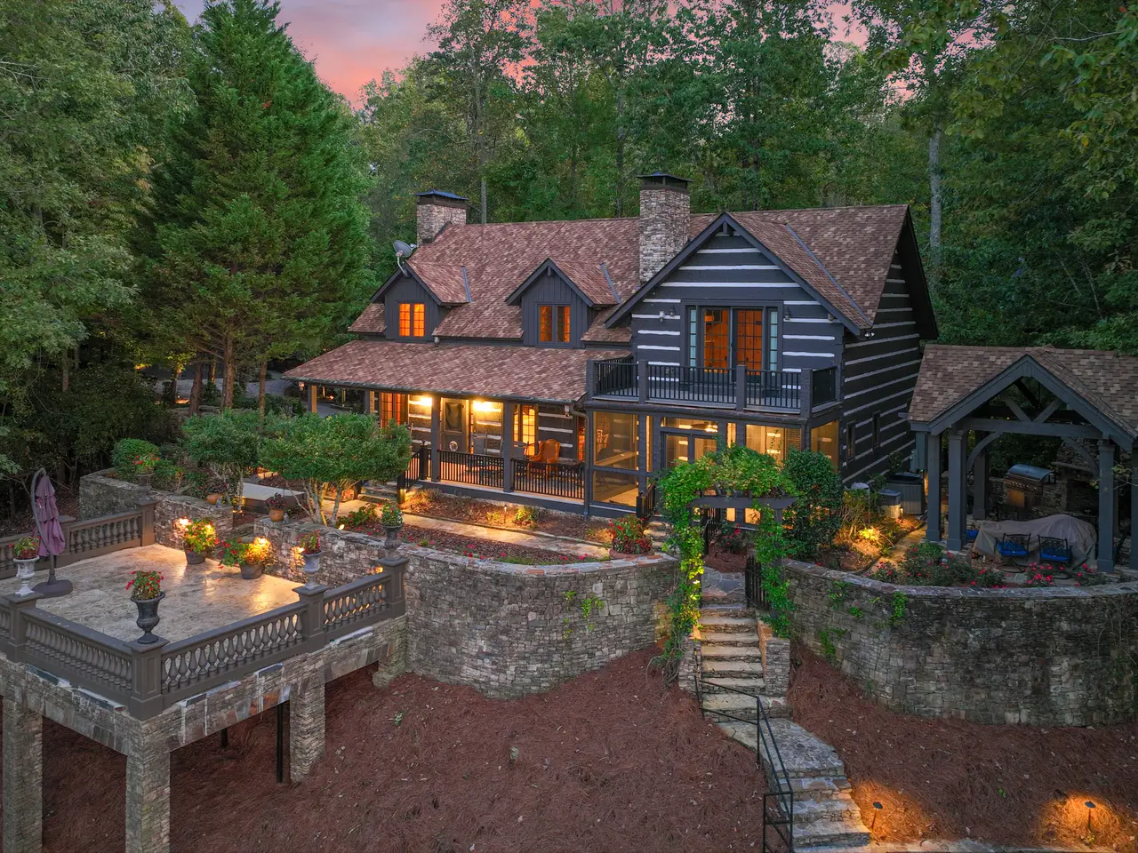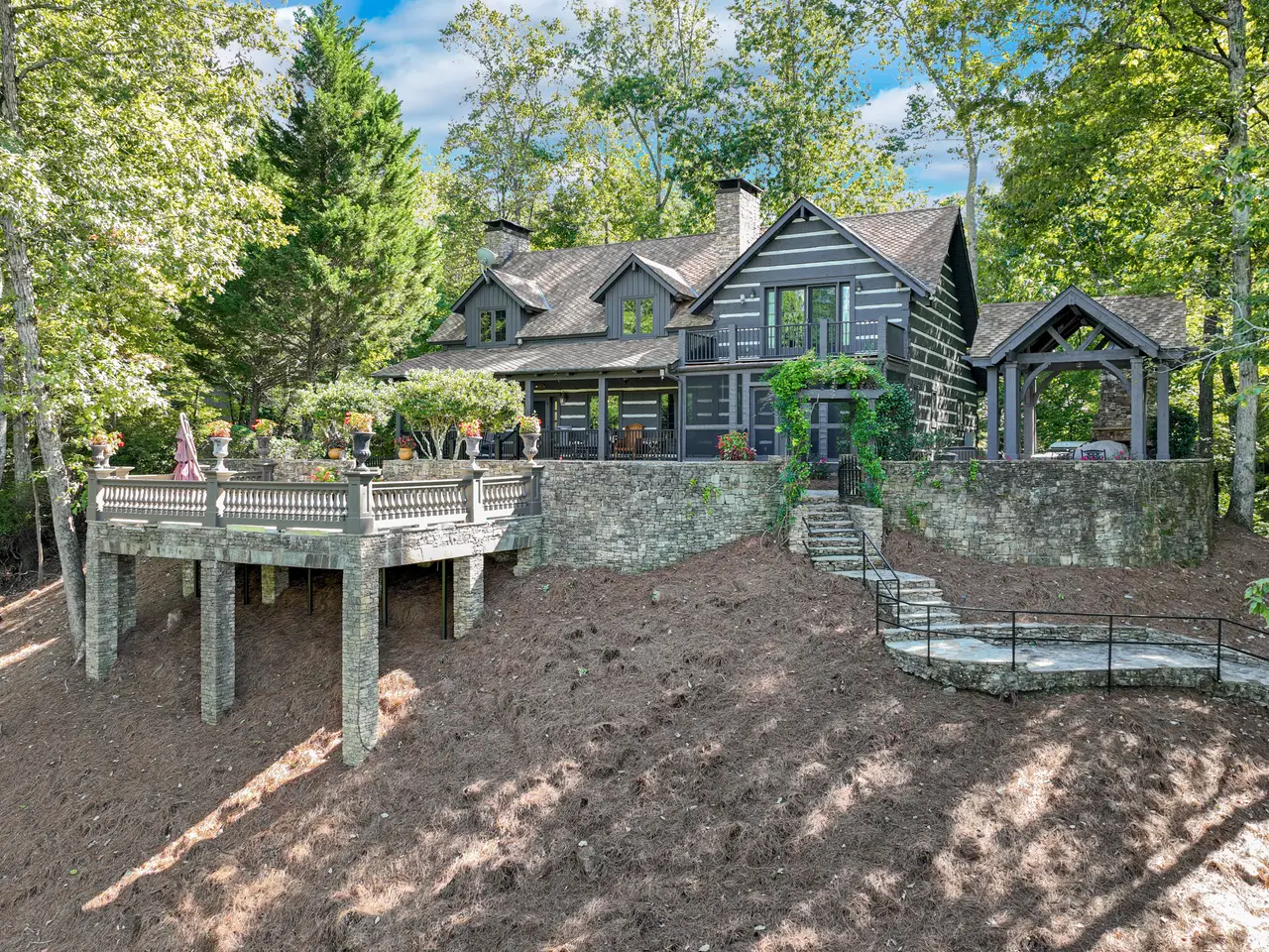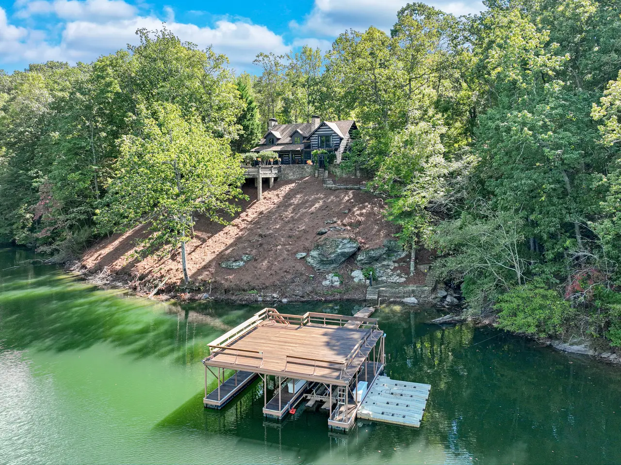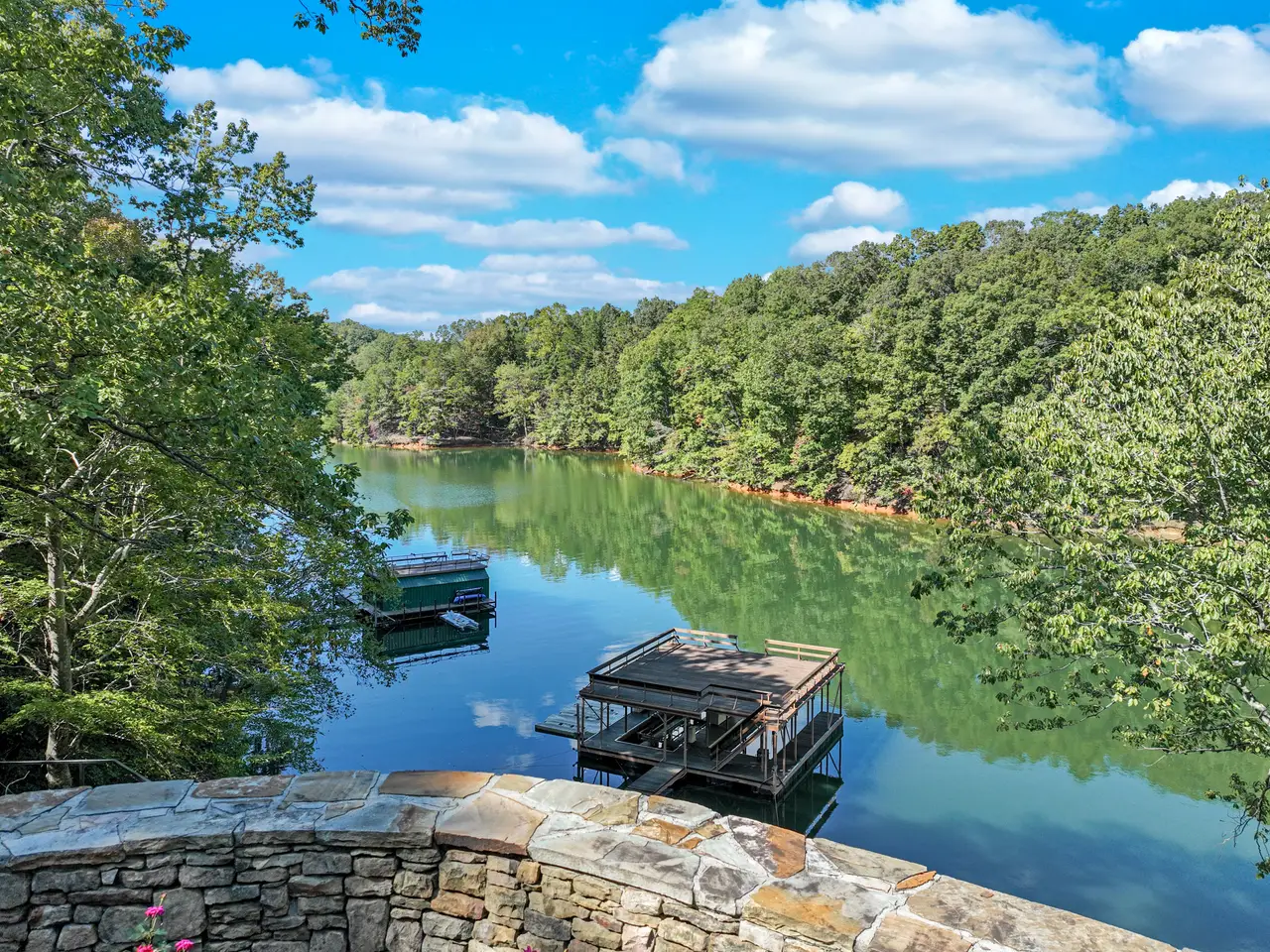This magnificent, elegantly rustic, custom built Lake Lanier estate on 6.78 acres includes a Main Home, a Carriage House, and 2 attached Guest Houses on deep water with a double slip party dock, along with a stream, multiple waterfalls and water features, covered gazebo, and stone walking paths, is like no other property you've experienced! It could easily function as a private estate, investment opportunity, or corporate retreat. A refined gated entrance and tree lined drive over the stream welcomes you to the main home reminiscent of a log home in the mountains. Once inside, you'll appreciate the family room with gorgeous, hand hewn logs and beams, pine floors taken from an 1800's cabin, both joined with wood pegs, wood ceiling, stone fireplace, and an open porch leading to a stone patio that captures beautiful lake views. The kitchen boasts a stone backsplash, Viking appliances of a 4 burner with griddle gas range and refrigerator, a Bosch dishwasher, built-in pantry, a second stone fireplace in the dining area, and lake views. Just off the kitchen is a laundry room, and a hall full bath with a SteaMist shower. Walk past a spiral staircase (reclaimed from a ship) and you'll find a generous guest bedroom with ensuite offering a third stone fireplace, built-ins, lake views and French doors to a private screened porch. The bathroom includes a gorgeous stone accent wall and a huge, dual head shower. Upstairs, the primary bedroom with ensuite offers a cozy sitting/office area featuring a wood burning stove against a stone accent wall. Built-ins and a spacious morning bar lead into the luxurious bath with a makeup area, SteaMist shower, and stone floors. Within the bedroom, a fourth stone fireplace, huge walk-in closet with built-in storage, and French doors leading to your private deck overlooking the lake, combine to enhance the beginning or ending of your day. An additional bedroom/office with 3 closets, a sitting area and a fifth stone fireplace will warmly welcome guests. Two hall closets and a hall full bath complete the upper floor. The Carriage House features a 2 bay, heated and cooled garage with an interlocking tiled floor. Upstairs... you'll enjoy the convenience of a full kitchen with a Thermador 4 burner gas range, 2 Subzero under counter refrigerators, a Bosch dishwasher, granite counters, stained cabinets, wood walls and ceilings, and wide board pine flooring. A spacious dining and living area focuses on a stacked stone accent wall with a wood burning stove. A full bath, linen closet, and closet, along with a loft bedroom makes a perfect space for your guests. Should there be a power loss, a Generac generator supports the Main Home and the Carriage House. The Guest Homes allow for additional family or guests to feel right at home. Each home features 2 garage bays that are heated and cooled with separate thermostats, with 1 bay hosting an EV charger. Upon entering the homes, you'll find a laundry room with glazed cabinets, travertine tile floors, granite countertops and a sink. Before you walk upstairs, look up! You won't want to miss the stunning, light-filled, wood ceiling. Once upstairs, you'll find that both living spaces are private, yet conveniently connected. Each offers kitchenettes with Kitchen Aid refrigerators, drawer dishwashers and microwaves. The family and dining areas are intimate, and both have ample bedrooms with ensuites. Stone paths from the main home and the guest home lead past the stream, waterfall, and pond to a covered gazebo with beautiful lake views. The 32x32 double slip, covered dock is teak and has been recently pressure washed and oiled. Included in the dock are a boat hoist and 4 jet ski ports. The dock electrical was also recently rewired. This amazing property also features stone accent walls. A walkable paved cart path that leads to the adjacent vacant lot with a concrete drive allows for overflow parking, an RV or trailer for your watercraft, and a separate gated entrance.