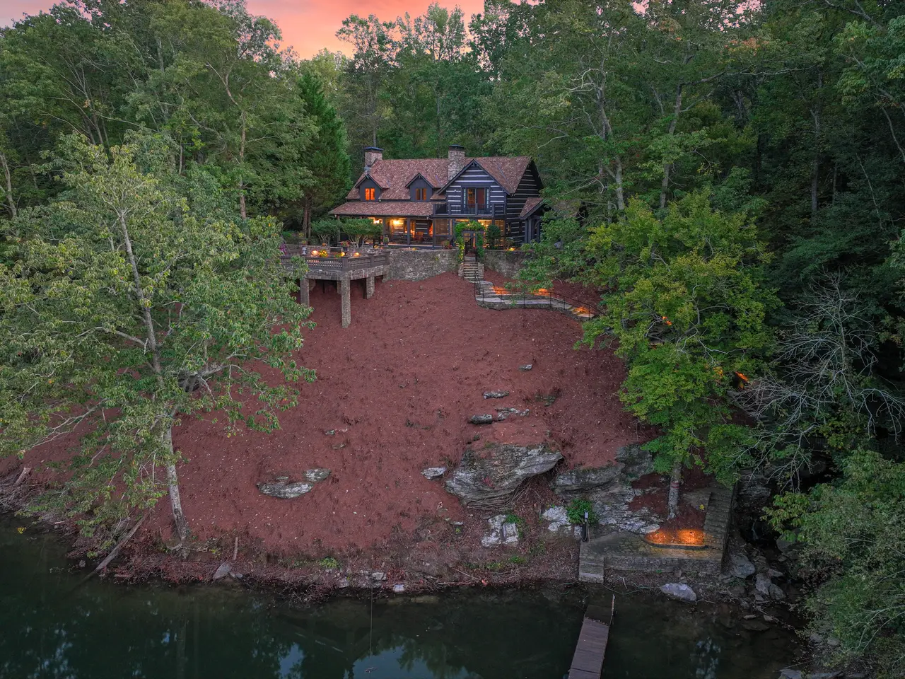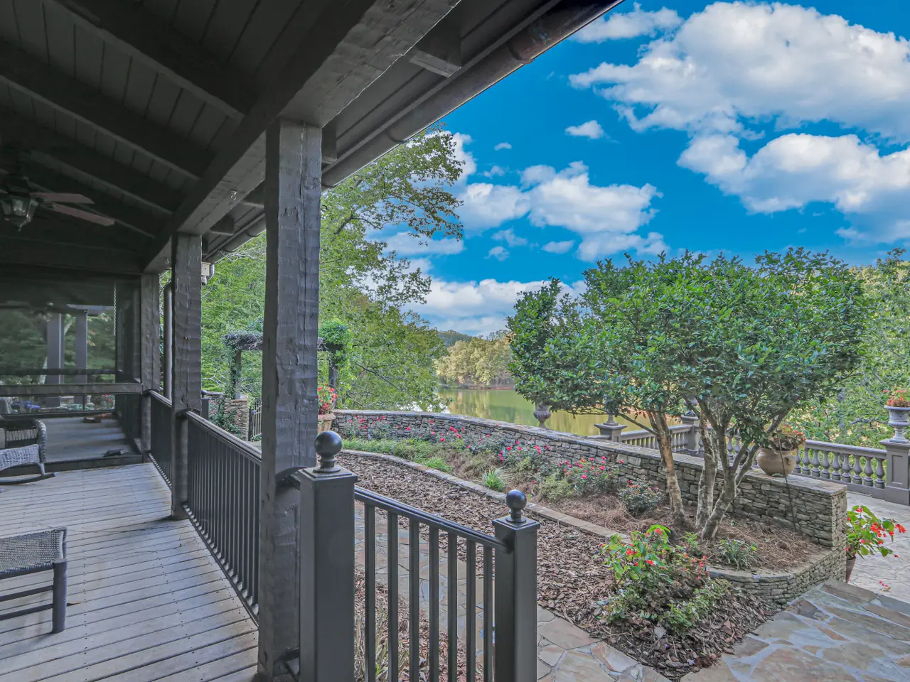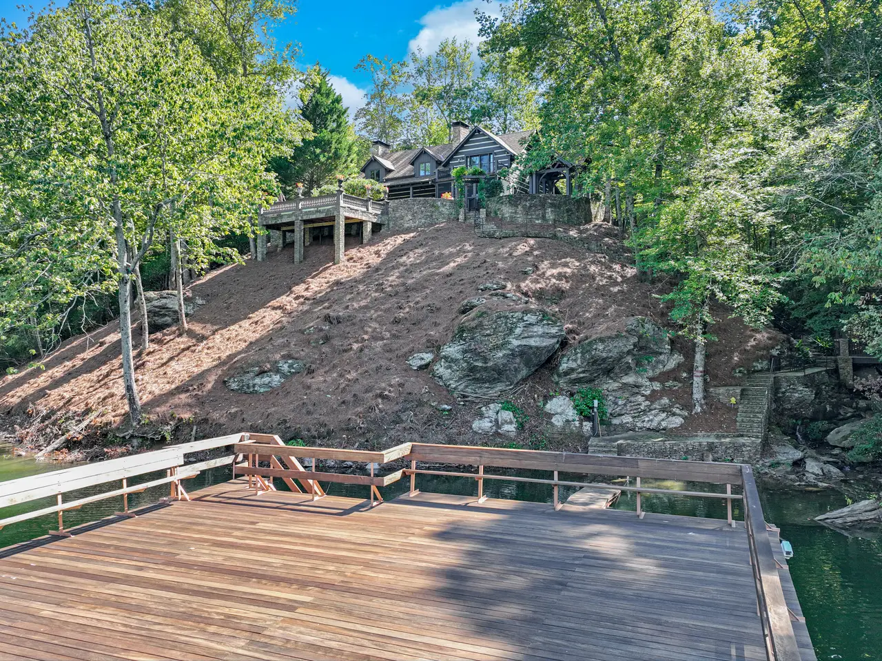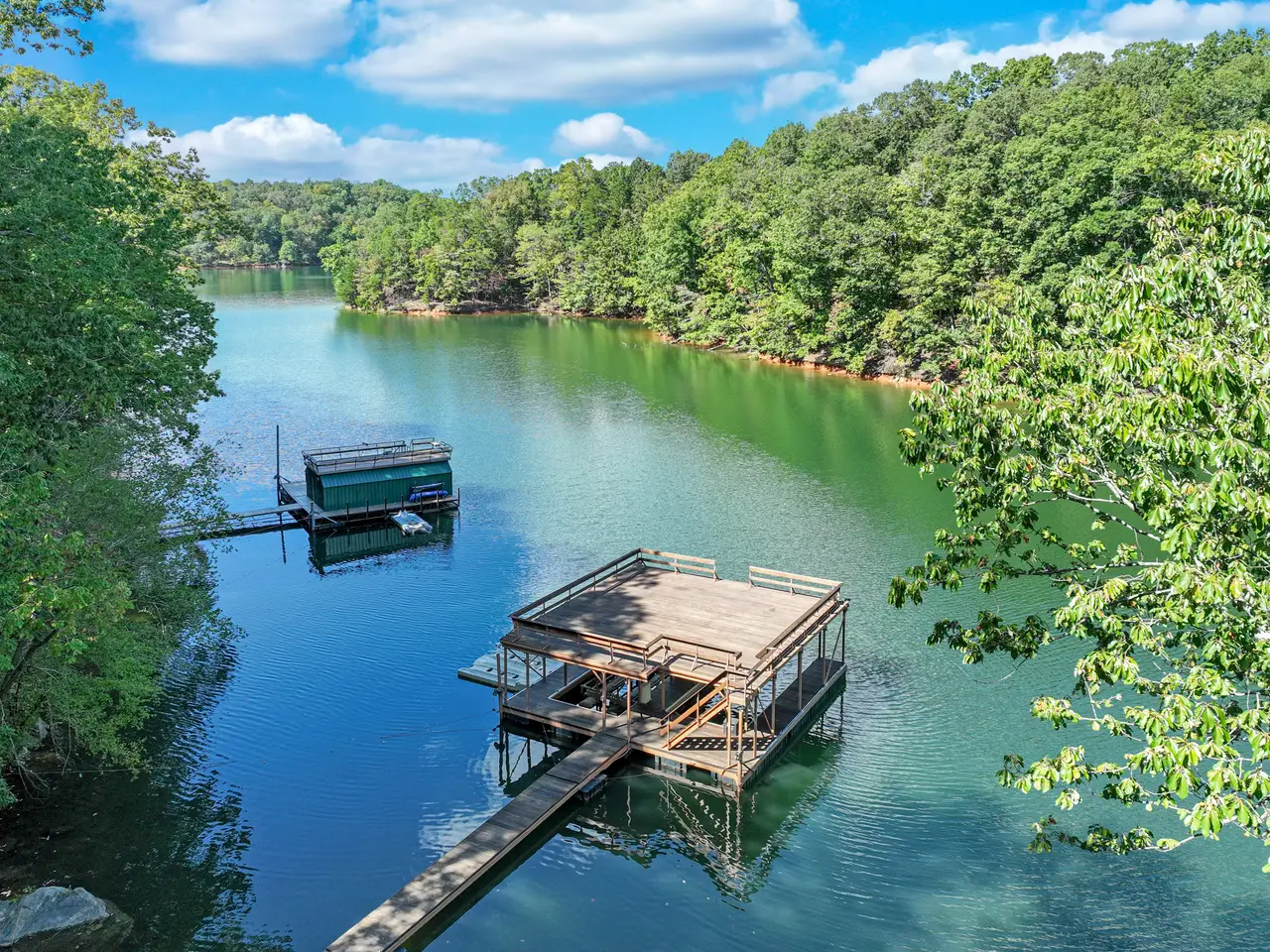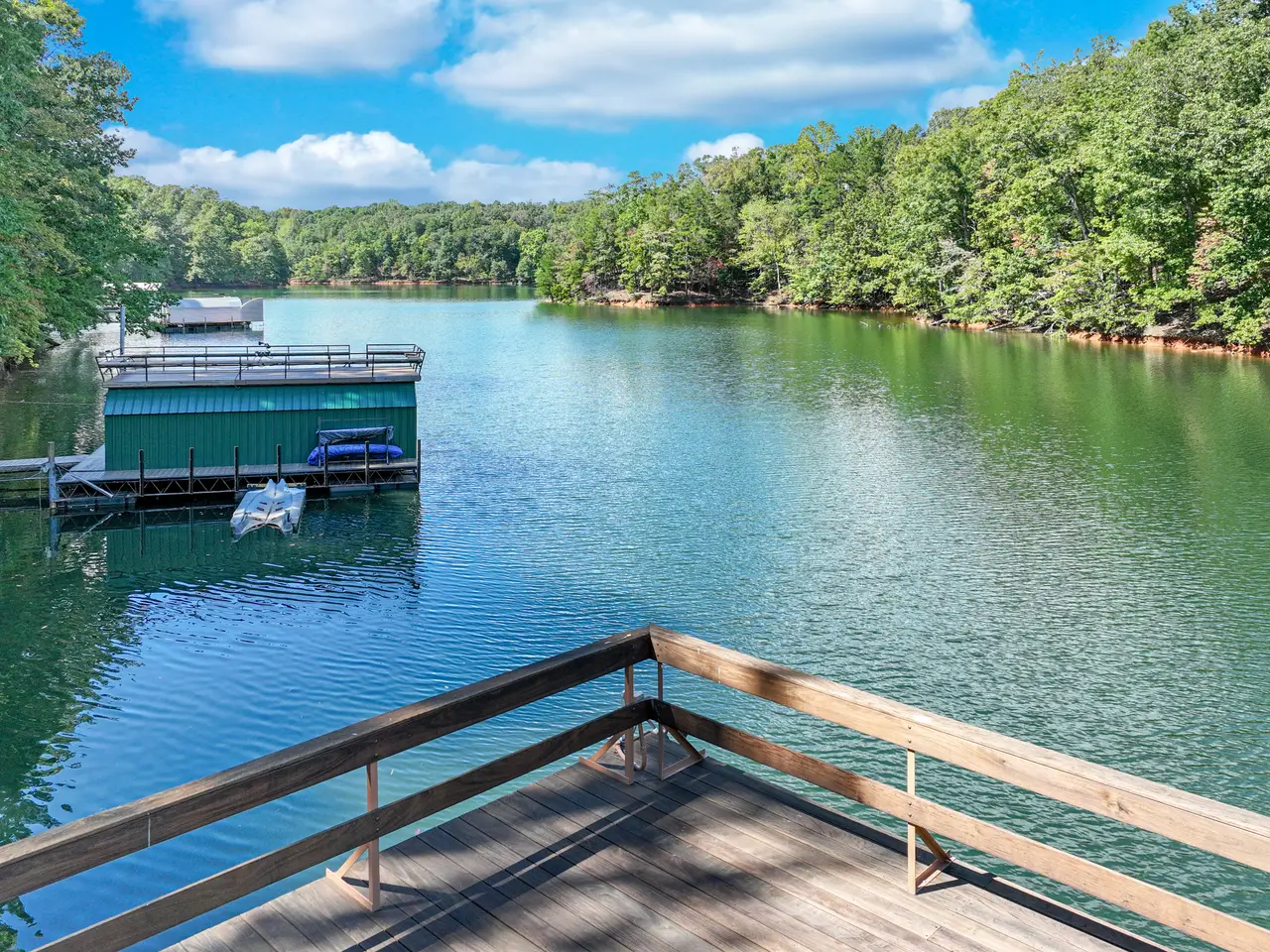 This magnificent, elegantly rustic, custom built Lake Lanier estate on 6.78 acres includes a Main Home, a Carriage House, and 2 attached Guest Houses on deep water with a double slip party dock, along with a stream, multiple waterfalls and water features, covered gazebo, and stone walking paths, is like no other property you've experienced! It could easily function as a private estate, investment opportunity, or corporate retreat. A refined gated entrance and tree lined drive over the stream welcomes you to the main home reminiscent of a log home in the mountains. Once inside, you'll appreciate the family room with gorgeous, hand hewn logs and beams, pine floors taken from an 1800's cabin, both joined with wood pegs, wood ceiling, stone fireplace, and an open porch leading to a stone patio that captures beautiful lake views. The kitchen boasts a stone backsplash, Viking appliances of a 4 burner with griddle gas range and refrigerator, a Bosch dishwasher, built-in pantry, a second stone fireplace in the dining area, and lake views. Just off the kitchen is a laundry room, and a hall full bath with a SteaMist shower. Walk past a spiral staircase (reclaimed from a ship) and you'll find a generous guest bedroom with ensuite offering a third stone fireplace, built-ins, lake views and French doors to a private screened porch. The bathroom includes a gorgeous stone accent wall and a huge, dual head shower. Upstairs, the primary bedroom with ensuite offers a cozy sitting/office area featuring a wood burning stove against a stone accent wall. Built-ins and a spacious morning bar lead into the luxurious bath with a makeup area, SteaMist shower, and stone floors. Within the bedroom, a fourth stone fireplace, huge walk-in closet with built-in storage, and French doors leading to your private deck overlooking the lake, combine to enhance the beginning or ending of your day. An additional bedroom/office with 3 closets, a sitting area and a fifth stone fireplace will warmly welcome guests. Two hall closets and a hall full bath complete the upper floor. The Carriage House features a 2 bay, heated and cooled garage with an interlocking tiled floor. Upstairs... you'll enjoy the convenience of a full kitchen with a Thermador 4 burner gas range, 2 Subzero under counter refrigerators, a Bosch dishwasher, granite counters, stained cabinets, wood walls and ceilings, and wide board pine flooring. A spacious dining and living area focuses on a stacked stone accent wall with a wood burning stove. A full bath, linen closet, and closet, along with a loft bedroom makes a perfect space for your guests. Should there be a power loss, a Generac generator supports the Main Home and the Carriage House. The Guest Homes allow for additional family or guests to feel right at home. Each home features 2 garage bays that are heated and cooled with separate thermostats, with 1 bay hosting an EV charger. Upon entering the homes, you'll find a laundry room with glazed cabinets, travertine tile floors, granite countertops and a sink. Before you walk upstairs, look up! You won't want to miss the stunning, light-filled, wood ceiling. Once upstairs, you'll find that both living spaces are private, yet conveniently connected. Each offers kitchenettes with Kitchen Aid refrigerators, drawer dishwashers and microwaves. The family and dining areas are intimate, and both have ample bedrooms with ensuites. Stone paths from the main home and the guest home lead past the stream, waterfall, and pond to a covered gazebo with beautiful lake views. The 32x32 double slip, covered dock is teak and has been recently pressure washed and oiled. Included in the dock are a boat hoist and 4 jet ski ports. The dock electrical was also recently rewired. This amazing property also features stone accent walls. A walkable paved cart path that leads to the adjacent vacant lot with a concrete drive allows for overflow parking, an RV or trailer for your watercraft, and a separate gated entrance.