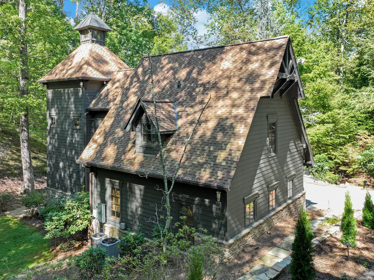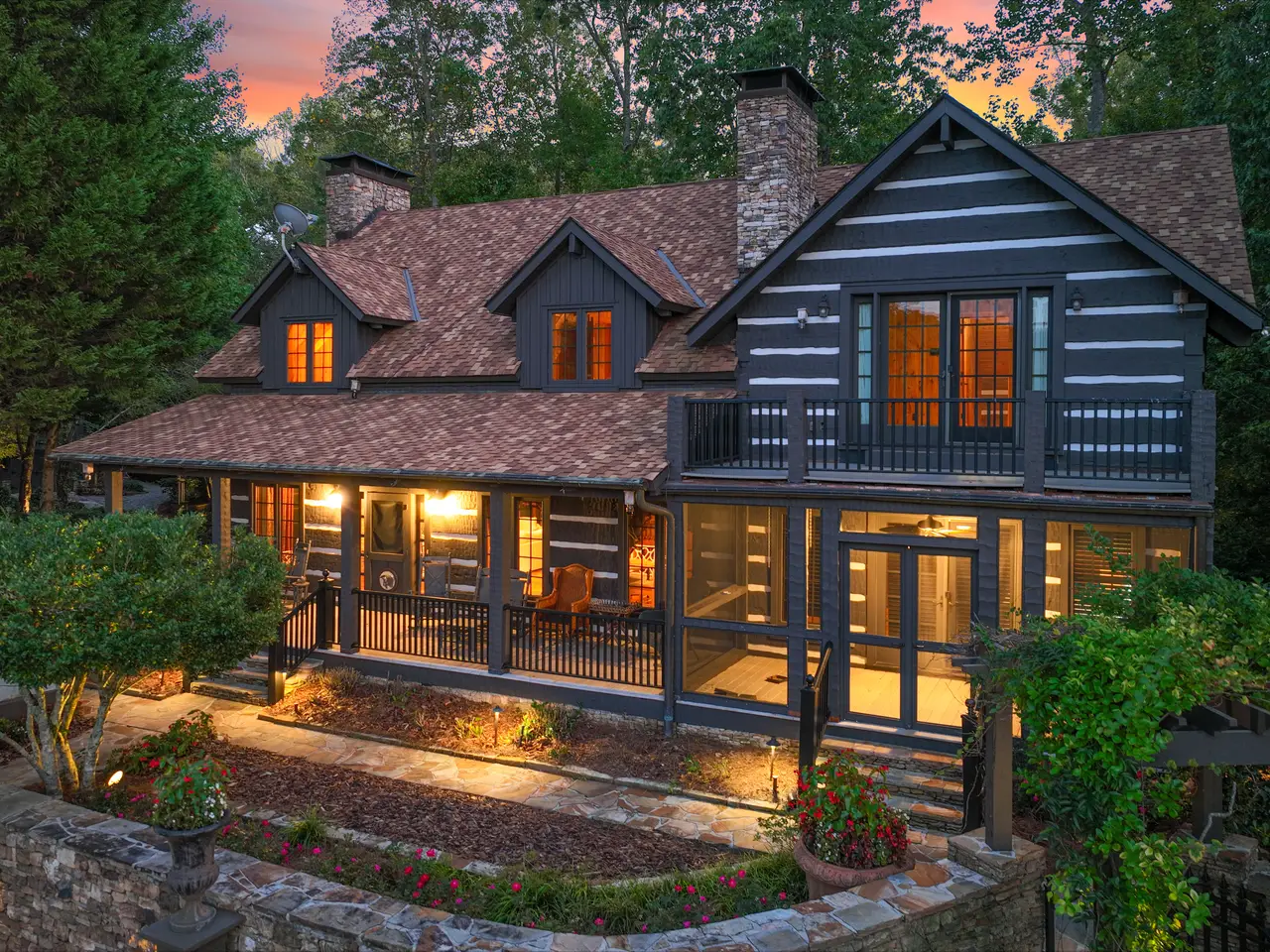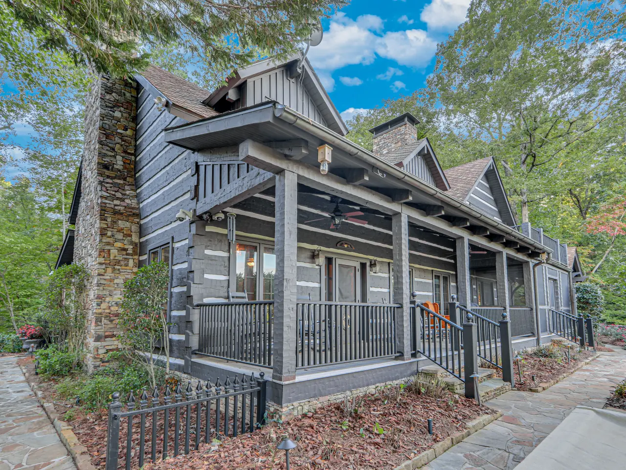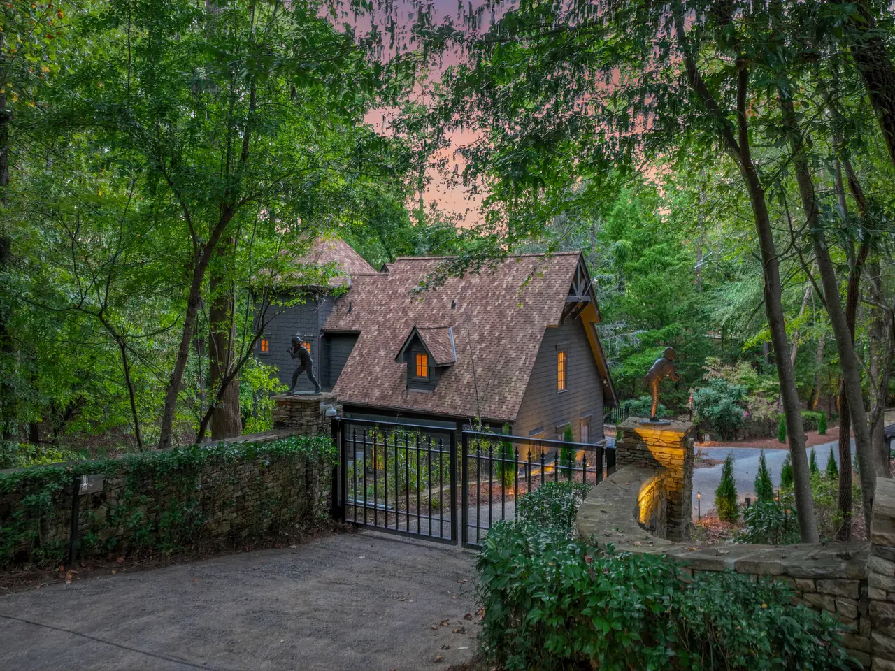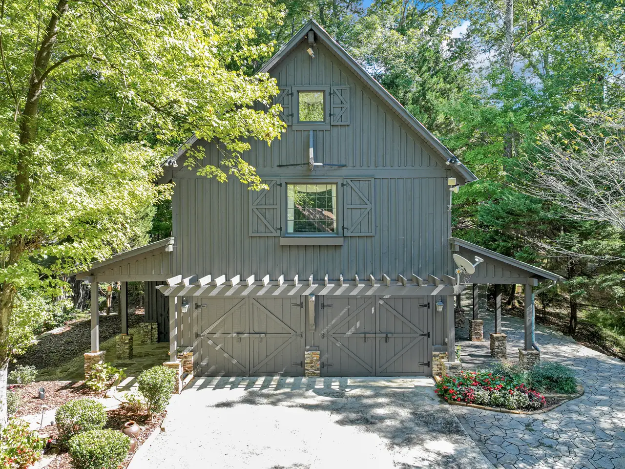 This magnificent, elegantly rustic, custom built Lake Lanier estate on 6.78 acres includes a Main Home, a Carriage House, and 2 attached Guest Houses on deep water with a double slip party dock, along with a stream, multiple waterfalls and water features, covered gazebo, and stone walking paths, is like no other property you've experienced! It could easily function as a private estate, investment opportunity, or corporate retreat. A refined gated entrance and tree lined drive over the stream welcomes you to the main home reminiscent of a log home in the mountains. Once inside, you'll appreciate the family room with gorgeous, hand hewn logs and beams, pine floors taken from an 1800's cabin, both joined with wood pegs, wood ceiling, stone fireplace, and an open porch leading to a stone patio that captures beautiful lake views. The kitchen boasts a stone backsplash, Viking appliances of a 4 burner with griddle gas range and refrigerator, a Bosch dishwasher, built-in pantry, a second stone fireplace in the dining area, and lake views. Just off the kitchen is a laundry room, and a hall full bath with a SteaMist shower. Walk past a spiral staircase (reclaimed from a ship) and you'll find a generous guest bedroom with ensuite offering a third stone fireplace, built-ins, lake views and French doors to a private screened porch. The bathroom includes a gorgeous stone accent wall and a huge, dual head shower. Upstairs, the primary bedroom with ensuite offers a cozy sitting/office area featuring a wood burning stove against a stone accent wall. Built-ins and a spacious morning bar lead into the luxurious bath with a makeup area, SteaMist shower, and stone floors. Within the bedroom, a fourth stone fireplace, huge walk-in closet with built-in storage, and French doors leading to your private deck overlooking the lake, combine to enhance the beginning or ending of your day. An additional bedroom/office with 3 closets, a sitting area and a fifth stone fireplace will warmly welcome guests. Two hall closets and a hall full bath complete the upper floor. The Carriage House features a 2 bay, heated and cooled garage with an interlocking tiled floor. Upstairs... you'll enjoy the convenience of a full kitchen with a Thermador 4 burner gas range, 2 Subzero under counter refrigerators, a Bosch dishwasher, granite counters, stained cabinets, wood walls and ceilings, and wide board pine flooring. A spacious dining and living area focuses on a stacked stone accent wall with a wood burning stove. A full bath, linen closet, and closet, along with a loft bedroom makes a perfect space for your guests. Should there be a power loss, a Generac generator supports the Main Home and the Carriage House. The Guest Homes allow for additional family or guests to feel right at home. Each home features 2 garage bays that are heated and cooled with separate thermostats, with 1 bay hosting an EV charger. Upon entering the homes, you'll find a laundry room with glazed cabinets, travertine tile floors, granite countertops and a sink. Before you walk upstairs, look up! You won't want to miss the stunning, light-filled, wood ceiling. Once upstairs, you'll find that both living spaces are private, yet conveniently connected. Each offers kitchenettes with Kitchen Aid refrigerators, drawer dishwashers and microwaves. The family and dining areas are intimate, and both have ample bedrooms with ensuites. Stone paths from the main home and the guest home lead past the stream, waterfall, and pond to a covered gazebo with beautiful lake views. The 32x32 double slip, covered dock is teak and has been recently pressure washed and oiled. Included in the dock are a boat hoist and 4 jet ski ports. The dock electrical was also recently rewired. This amazing property also features stone accent walls. A walkable paved cart path that leads to the adjacent vacant lot with a concrete drive allows for overflow parking, an RV or trailer for your watercraft, and a separate gated entrance.