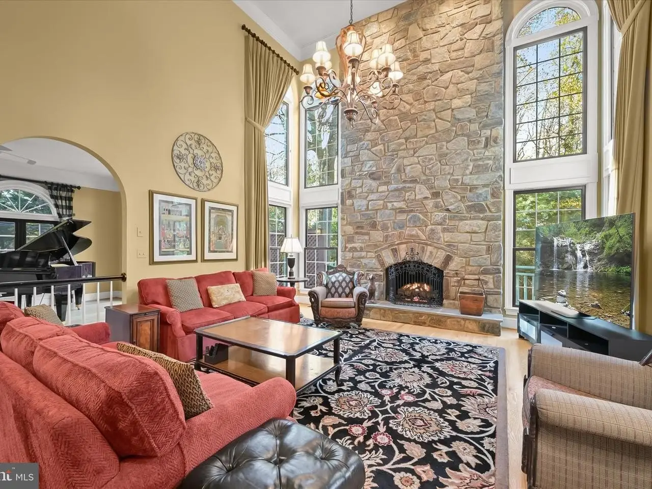 Floor-to-ceiling stone fireplace