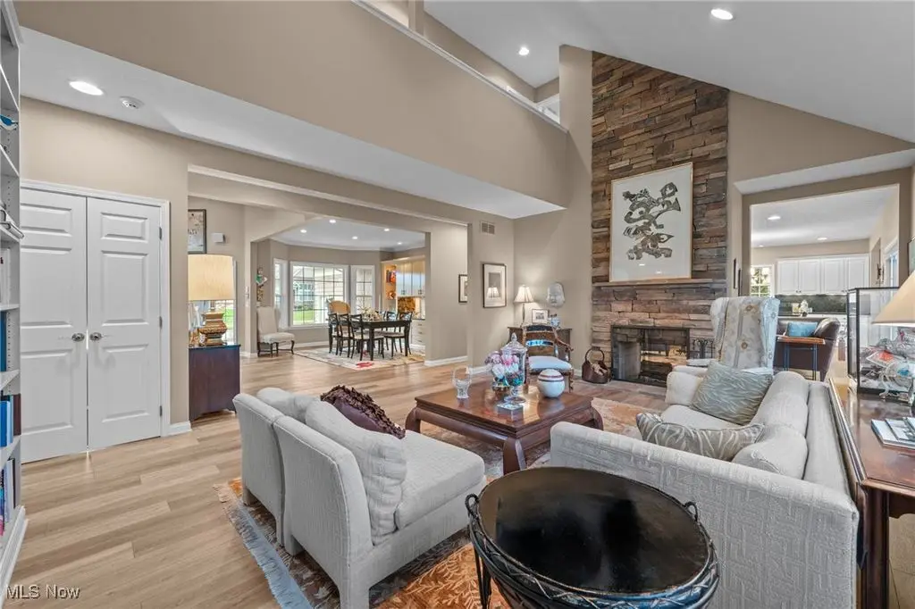 Stunning transitional home, nestled within the gated golf and social community of Signature of Solon. Situated on one of the most premier lots, this beautiful home backs up to a nature preserve of federally protected wetlands, ensuring privacy and no future development. As you step inside, you will immediately notice that this home was built with many upgrades and custom features. Enter the foyer and see the open floor plan with vaulted living room and adjacent dining room. Living room features a two story stone fireplace, custom built-in bookshelves, and a wall of windows with breathtaking views. The dining room has a furniture quality built-in hutch with Michael Aram hardware. Recently remodeled chef's kitchen with loads of cabinetry, newer appliances, huge island, and bright eat-in breakfast room. The kitchen is open to a terrific hearth/family room with 2-way fireplace. The first level is truly designed for entertaining and comfortable everyday living. The first floor master suite has a large bedroom, bath, and office. Upstairs are 2 nice sized bedrooms with jack and jill bath and a separate office. Over 3800 square feet on the first and second levels. Additionally, there is a finished walk-out lower level that is incredibly spacious and offers a billiard area, family room, full bath, and 2 additional larger finished rooms currently being used as office space but could easily turn into an in-law or nanny suite. One owner home, and owners have already replaced many components including roof, furnace, air, hot water tank, and flooring. You will be thoroughly impressed with the quality and the pride of ownership.