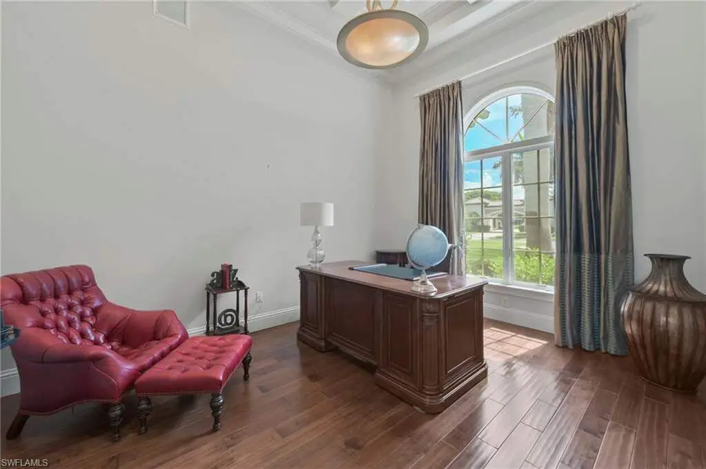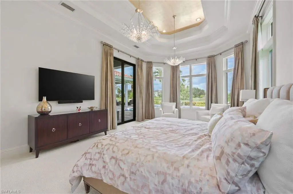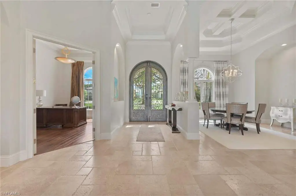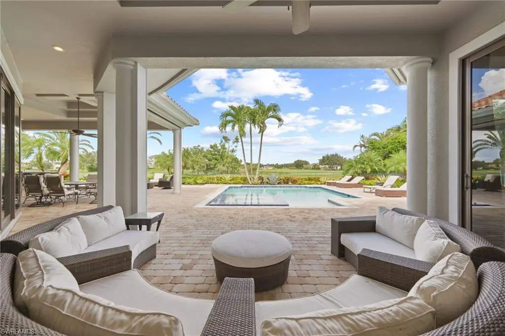 Exquisitely designed with soaring, coffered ceilings as you enter the double, glass paned front doors to the beautiful foyer offering stunning views of the craftsmanship details to the fabulous exterior views overlooking your lanai, pool/spa and to the golf course and lake beyond. Inside, you will be immersed in luxury as you enjoy a gas fireplace flanking the formal living room to the fabulous kitchen detailed with an abundance of workspace, island, and Wolf appliances and overlooking the breakfast nook and family room with zero corner sliders leading to the fantastic lanai. There, you will appreciate the built in outdoor kitchen, seating area and the lovely, coffered ceiling. The pool/spa and gas fire pit are open for wonderful starry nights and fabulous entertaining. With 4 bedrooms, all ensuite, den and media room, you and your family and guests will appreciate the privacy of personal spaces and the 3-car garage with a portico allows plenty of spaces for your treasured vehicles.