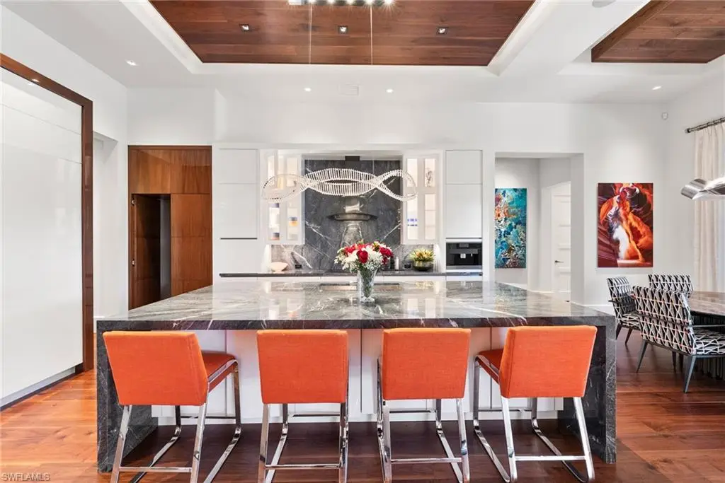 A residence conceived with the poise and indulgence of a world-class Las Vegas retreat - nestled within the exclusive enclave of Bonita Bay. Commandingly set along the 18th fairway of the Marsh Course, this 2022 architectural statement by Harwick Homes, in collaboration with renowned designer Sherri DuPont, redefines bespoke living through an extraordinary fusion of artistry, innovation, and precision craftsmanship. Each space within the home reflects a distinct vision of grandeur: five ensuite bedrooms plus a study, framed by expressive architecture and opulent material selections. The interiors unfold like a private gallery - where custom furnishings, commissioned art, and sculptural lighting create a cinematic interplay of texture, color, and form. Every detail was conceived not simply to impress, but to immerse. The outdoor realm rivals a five-star resort, with expansive terraces, tranquil water features, and a resort-caliber pool environment that transitions seamlessly from day to dusk, overlooking the course's most dramatic vistas. Entertaining flows effortlessly between interior and exterior spaces, each crafted for both lavish gatherings and quiet reflection.