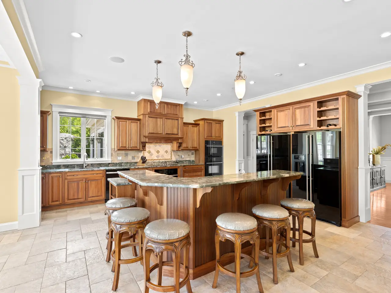 The residence features a variety of elegant living spaces, including a grand foyer, fireplaced living room, formal dining room, chef’s kitchen, and four-season room with indoor grill. A cozy family room opens through