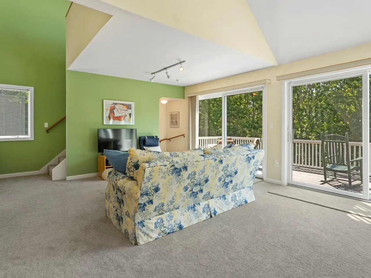 Bright second-floor great room with skylights