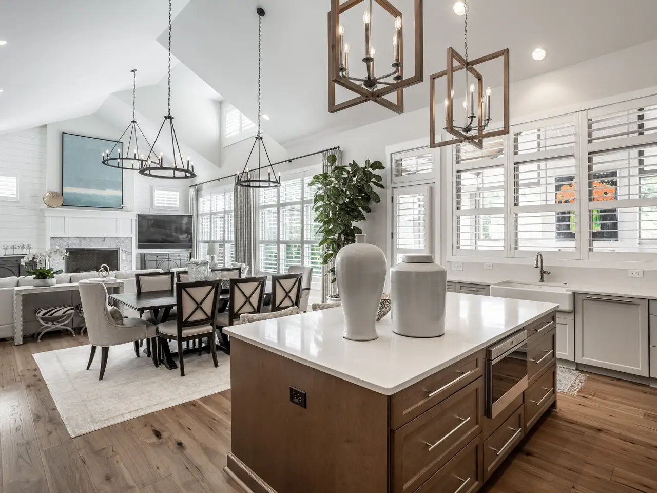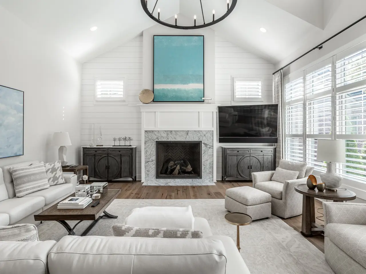 Soaring vaulted ceilings and striking gas fireplace