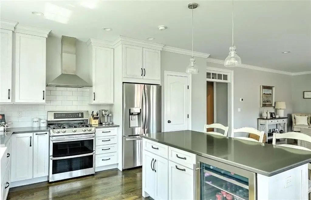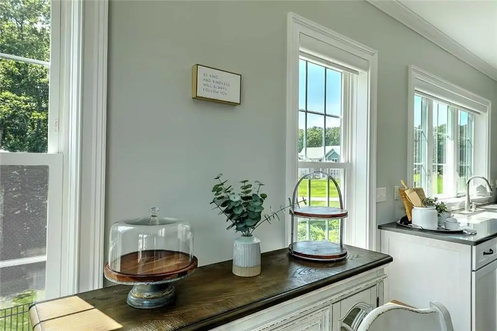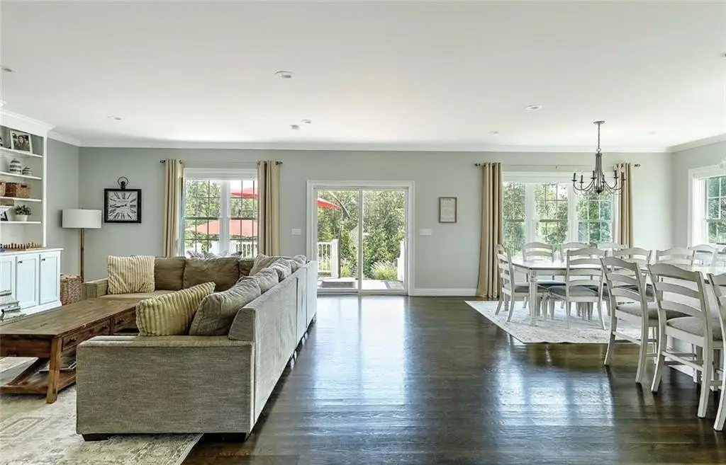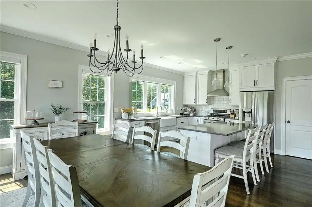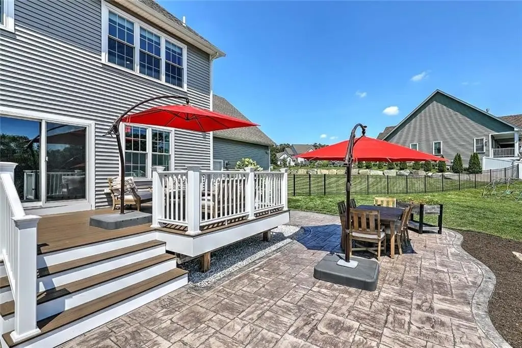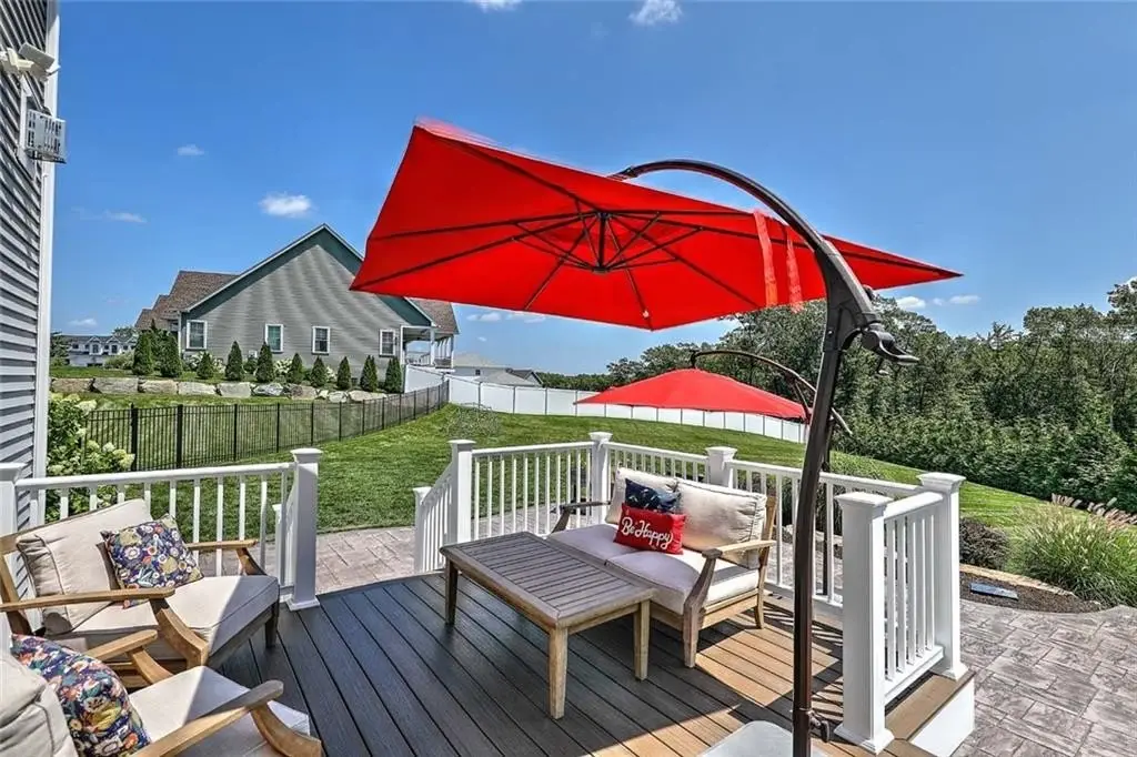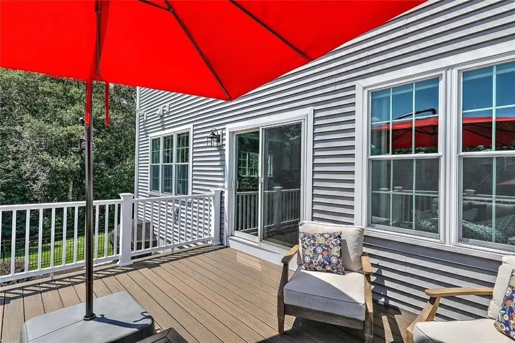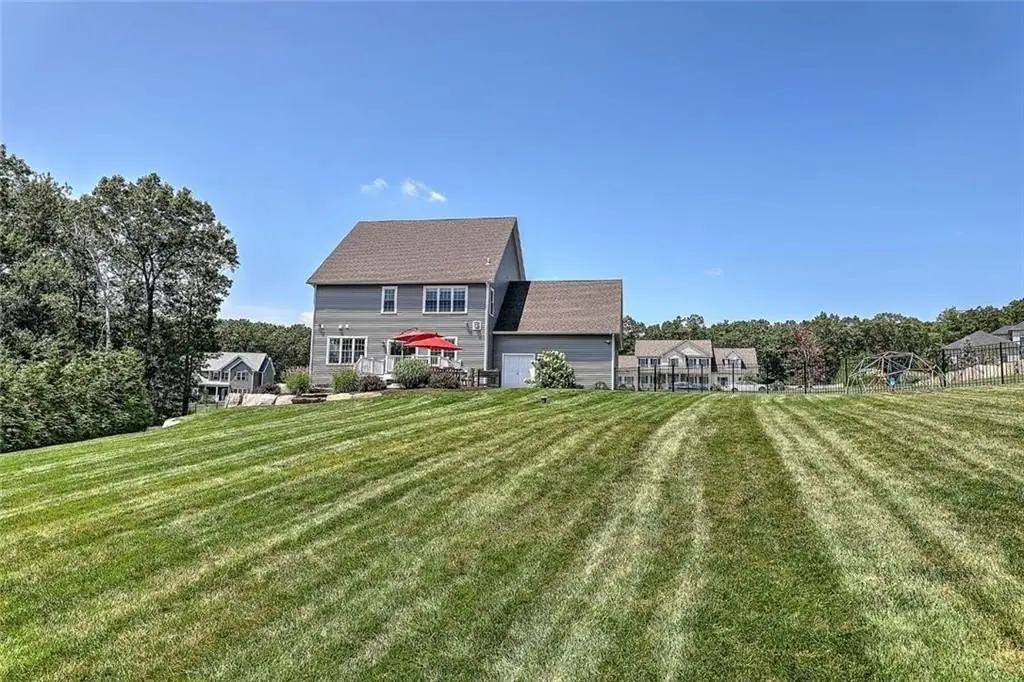 Ready to make this beautiful house your home, this modern Colonial in Smithfield is an end lot surrounded by 30+ acres of pristine conservation land. This 3-4-bedroom home, with potential to expand, was recently painted throughout and designed with an addition of an in-law apartment in mind. The main level features a bedroom and full bath, as well as an open-concept kitchen, open living and dining area. Custom built-in shelving frames the charming gas fireplace, walk-in pantry, beverage fridge, gas stove, farmers sink and sliders leading out to the deck and patio. From the garage, step into a spacious laundry/mudroom with ample cabinetry. Upstairs, you'll find an office, a bedroom with a walk-in closet & ensuite bath, plus an owner’s suite featuring a tiled glass shower and a custom walk-in closet. A large great room creates endless possibilities for a playroom, media room, or additional living space. The finished lower level includes a gym area, wet bar with fridge, and a half bath for entertaining a weekend crowd. Outside, added trees, additional landscaping, full fencing for pets completes this exceptional country abode. Laperche Elementary which is a state of Rhode Island Blue Ribbon School, Deerfield Park provides playgrounds, tennis courts, and trails. Close to the Crossings at Smithfield, Lincoln Mall, only 10 minutes away. Close proximity to highways for an easy commute to Boston or Providence. Contingent on finding suitable housing. Ask me about assumable VA at 2.25%