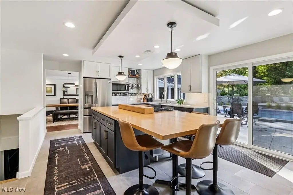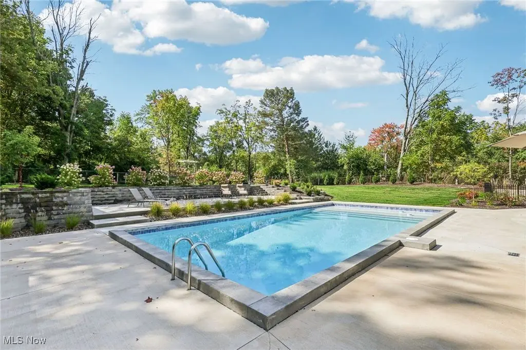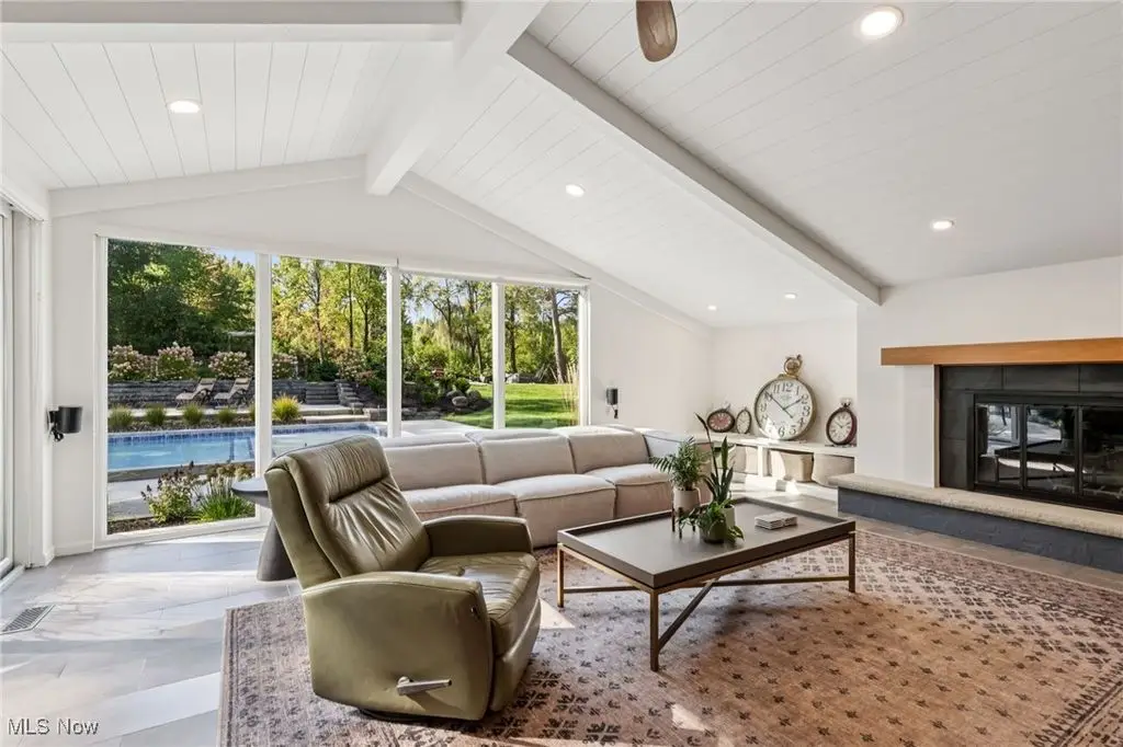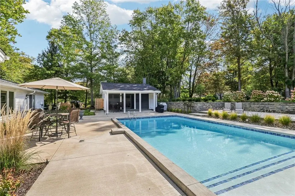 This breathtaking, fully renovated midcentury residence is the epitome of luxury living! Perched on a professionally landscaped 1-acre hilltop lot, this exquisite home features 4 bedrooms, 4 full baths, 1 half bath, a walk-out lower level, sparkling pool, and pool house. Arrive via the circular driveway and step into the dramatic two-story foyer, highlighted by a floating staircase and marble flooring. From there, the open living and dining room impress with picture windows front and back, and a decorative wrought-iron screen. The spectacular gourmet kitchen boasts full-height cabinetry, quartz countertops, tiled backsplash, and stainless-steel appliances. Adjacent is the vaulted, beamed-ceiling family room with wet bar, built-in buffet, and a stunning gas fireplace. A large pantry, an incredible exercise room, a laundry with dog shower, and a mudroom complete this wing of the home. On the opposite side of the foyer, the gorgeous primary suite offers built-in bookshelves, a wet bar, dual closets with a Murphy bed, and a spa-inspired bath with oversized tiled shower, sauna, soaking tub, and double-sink granite vanity. Upstairs, three generously sized bedrooms, two remodeled bathrooms, and a versatile loft provide comfort and flexibility. The walk-out lower level features a spacious recreation room and full bath with direct yard access. Both levels of the home overlook the private backyard oasisC/B?B=complete with pool, pool house, lush gardens, and firepit. Additional highlights include a 4-car attached garage, extra parking, and full connection to public sewer in 2024. Whether hosting elegant dinner parties, enjoying summer poolside, or relaxing with family in inviting living spaces, this remarkable property offers an unparalleled lifestyle.