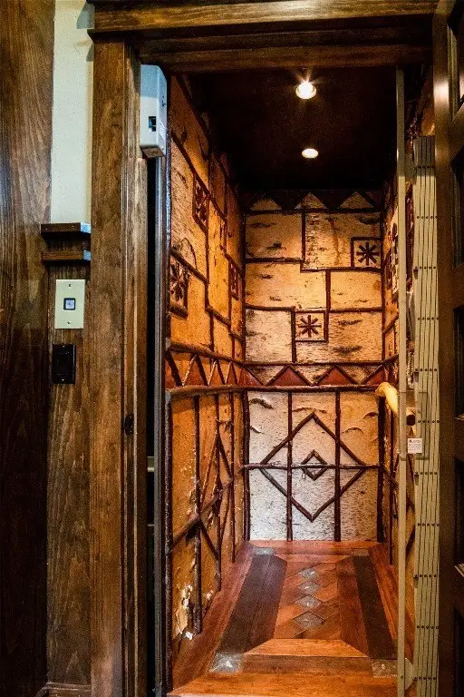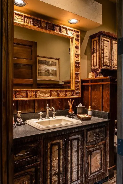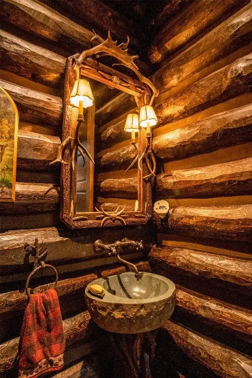 • Reclaimed heart pine floors and pine logs with golden chinking