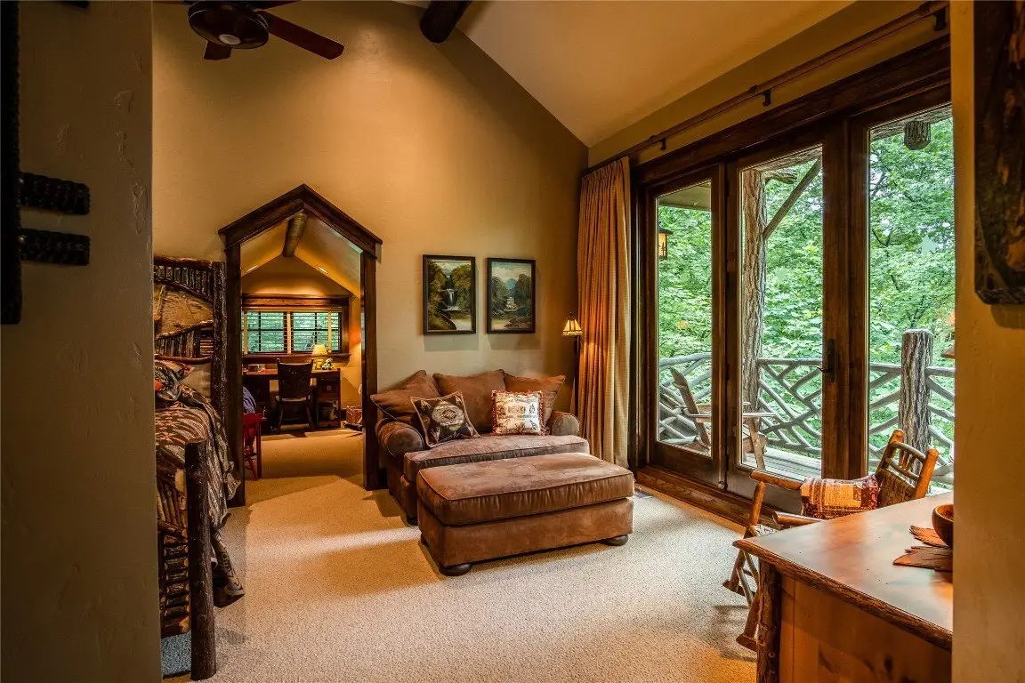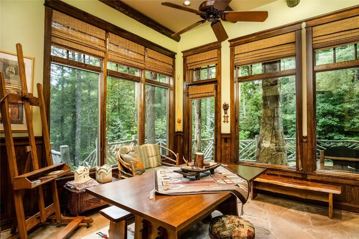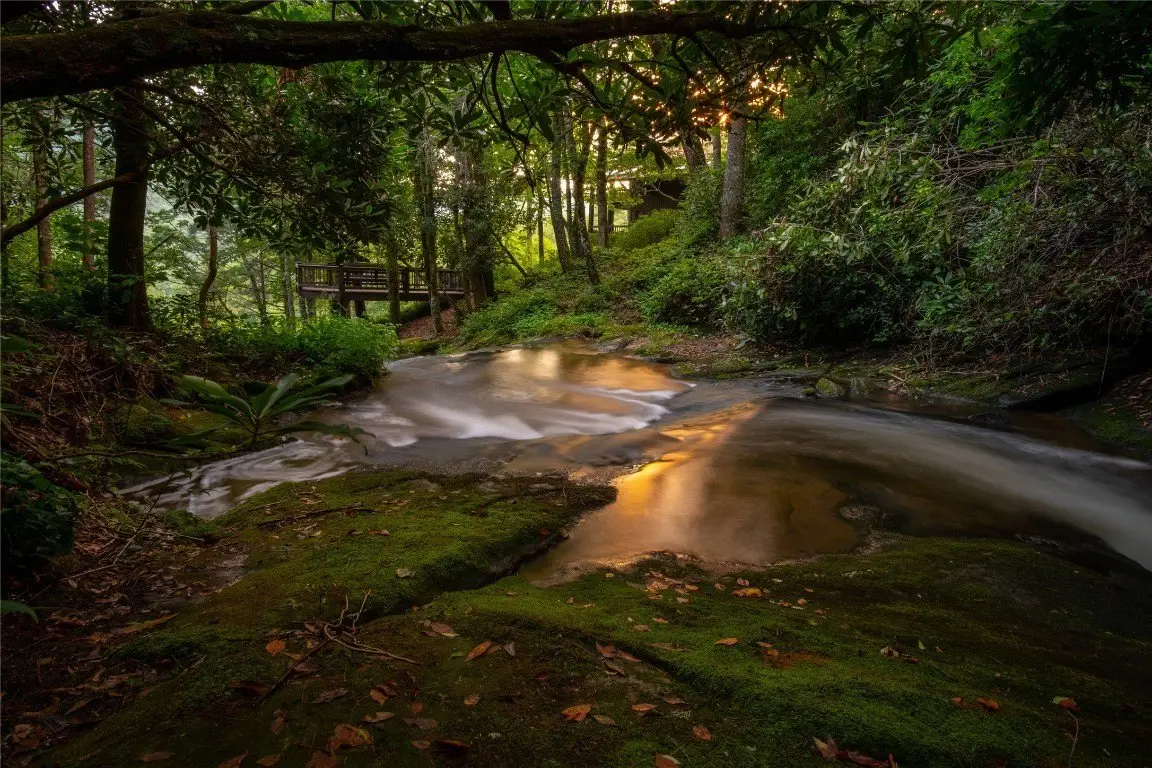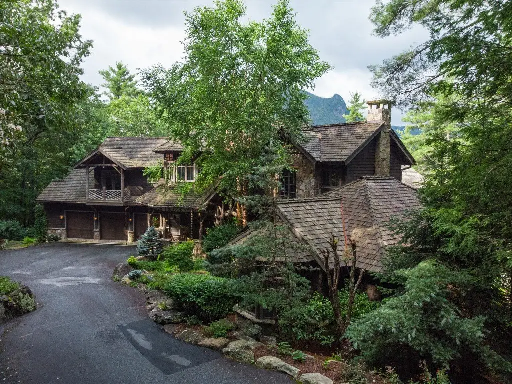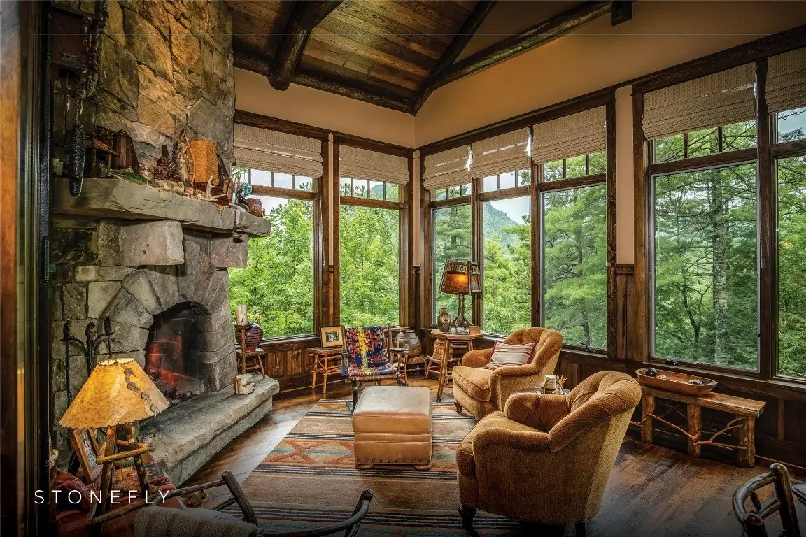 Just minutes from the shopping and fine dining of downtown Cashiers, Blue Bear Camp is the ultimate Adirondack-style mountain lodge. This prime property borders the Nantahala National Forest, ensuring privacy and abundant wildlife. Another world awaits in the dream-like setting amid the wild Chattooga River, flowering landscaping, a sparkling waterfall, and lush forest, all against the stunning backdrop of Whiteside Mountain and Devil's Courthouse. Reminiscent of the great camps in the early 1900s, the rustic decor is warm and welcoming with natural wood details such as pine logs with golden chinking, wax-rubbed reclaimed heart pine floors, and a grandiose circular log staircase surrounding a seven-foot antler chandelier. The staircase is a masterpiece of engineering, constructed from Colorado Ponderosa pine over three months. Much of the custom furniture and details were built by local craftsmen on site. Other unique finishes were created by artisans from across the country, using natural materials such as mica, aged copper, shed elk antlers from Wyoming, Canadian birch bark, wormy chestnut, and turquoise. The stunning stonework and multiple fireplaces throughout the home were built from Tennessee fieldstones, many of which reveal 300,000-year-old fossils. In addition to the private guest quarters with a kitchenette and laundry room, the sprawling three-story home with an elevator offers an abundance of space for family and guests to explore, including a sunroom, library, an artist studio, game room, wine cellar, a resplendent home theater, and a fitness room with a sauna and steam room. Nature lovers will revel in the magical surroundings and fresh mountain air on the covered porch amid sights and sounds of the rushing waterfall. There's something for everyone to enjoy in an area offering residents access to the countless natural resources and opportunities for outdoor recreation such as hiking, fly fishing, biking, skiing, and golf.